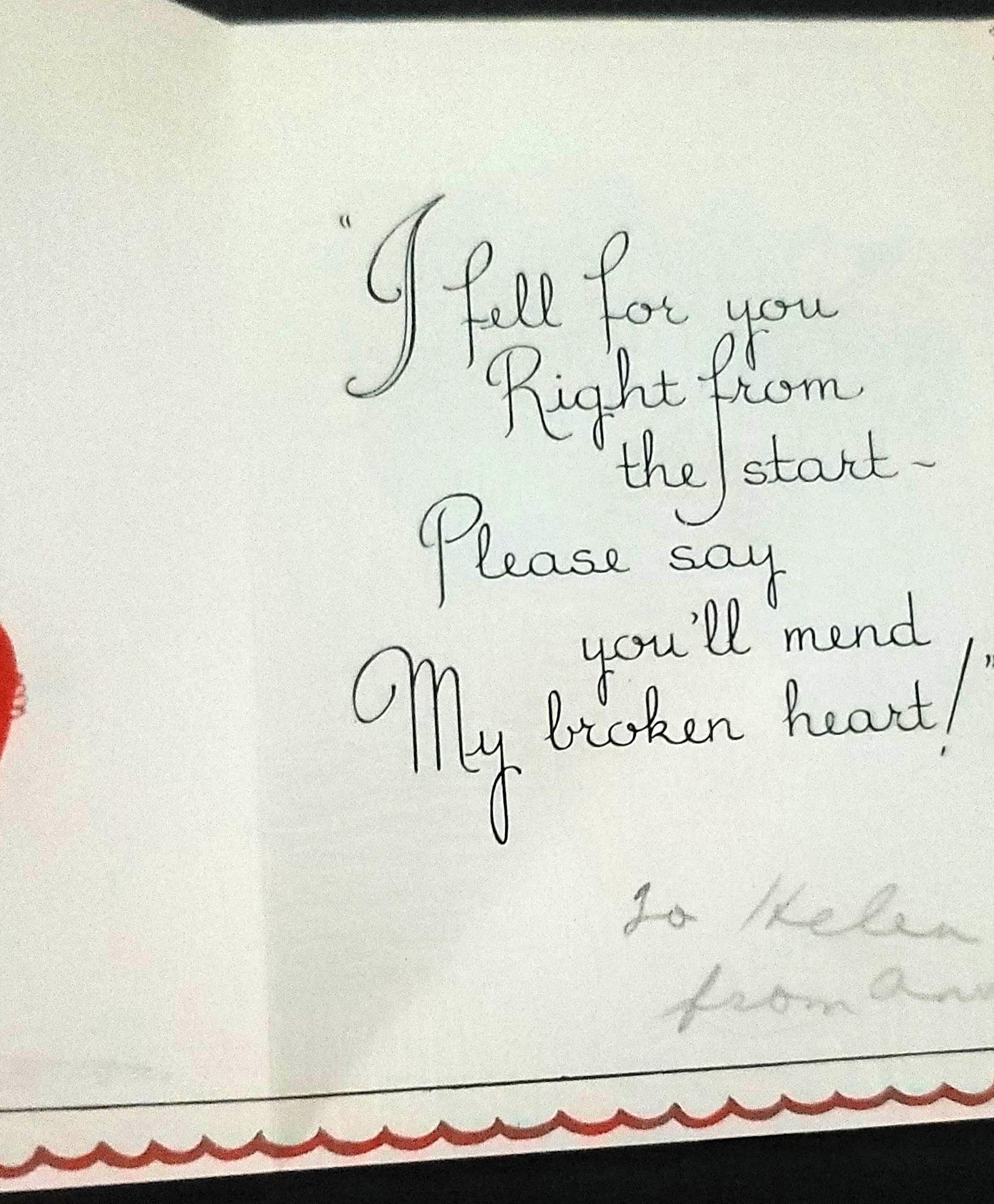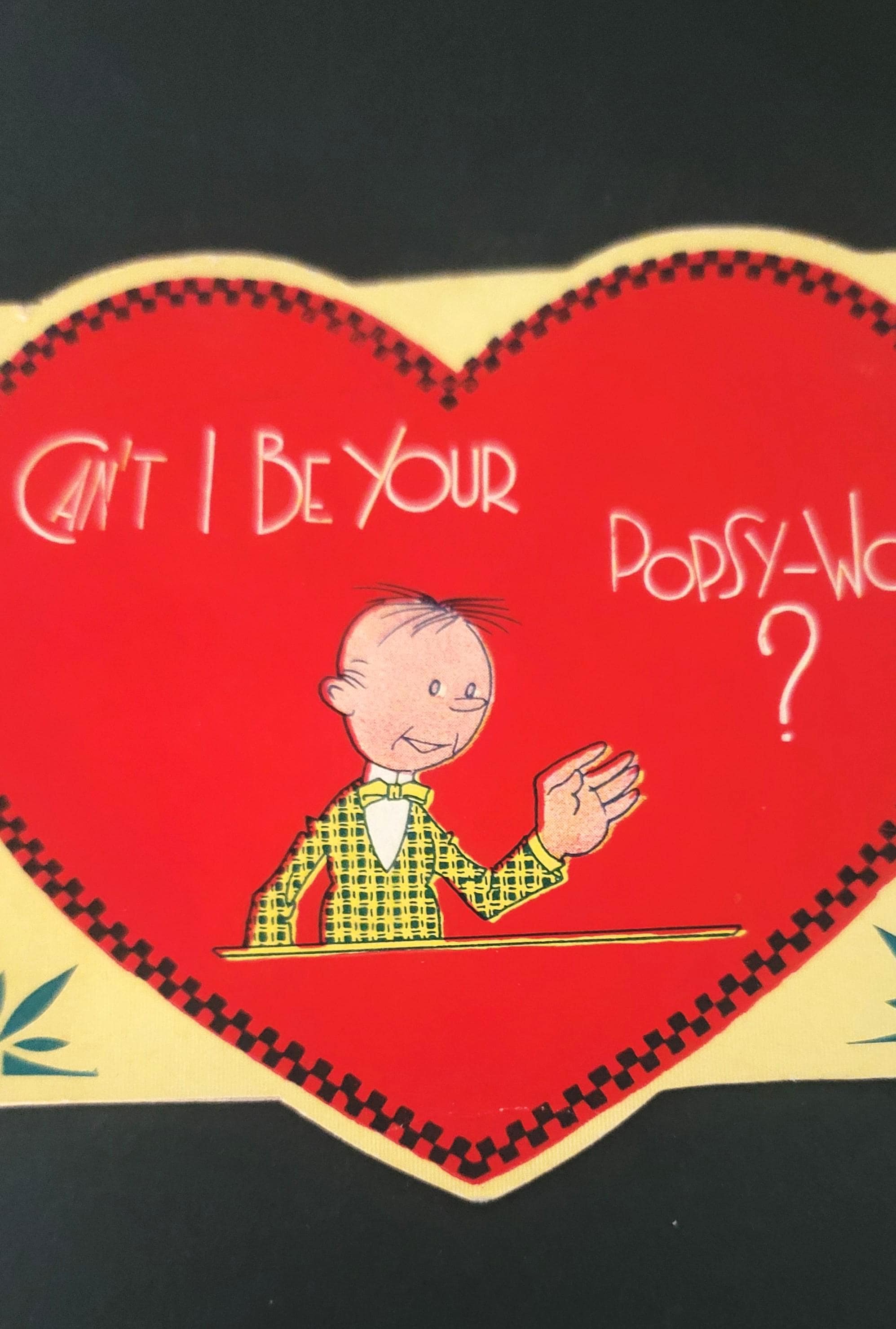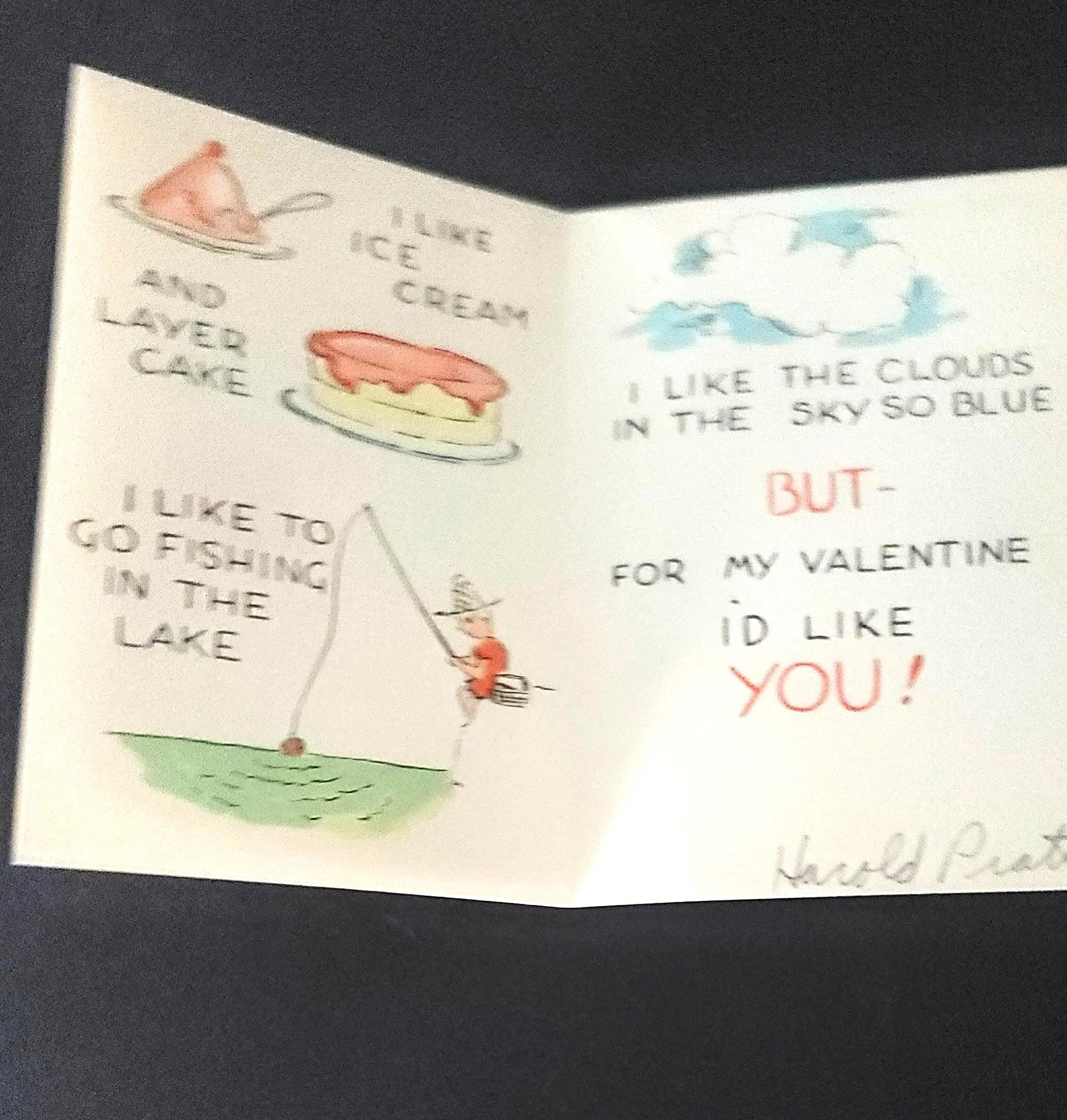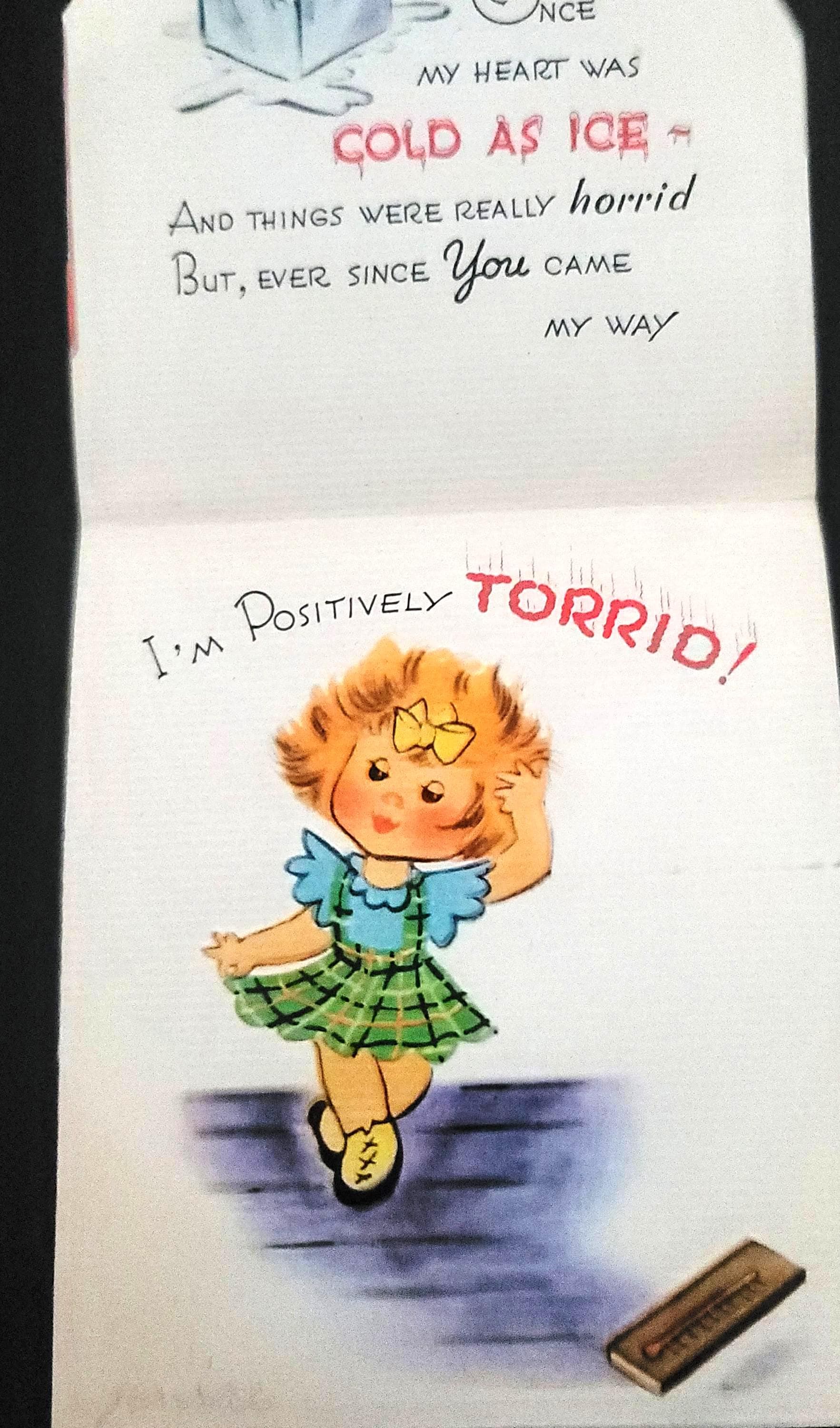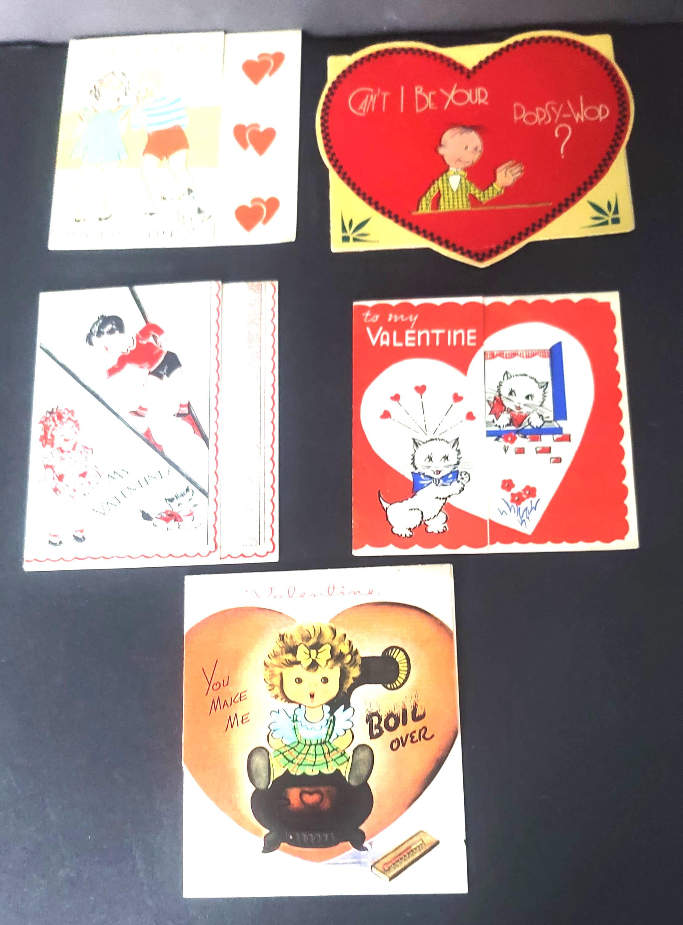 These are some really adorable ones from the 1930s. I especially love the one that says "Can't I be your Popsy-Wop?" That was a slang term in the 30s for a sweetheart. I also love the one that says "Valentine You make me boil over. Once my heart was cold as ice and things were really horrid, but, ever since you came my way, I'm positively torrid!" they all open up and they all have writing on them, but are in very good vintage condition. They are about 5.25 x 4".