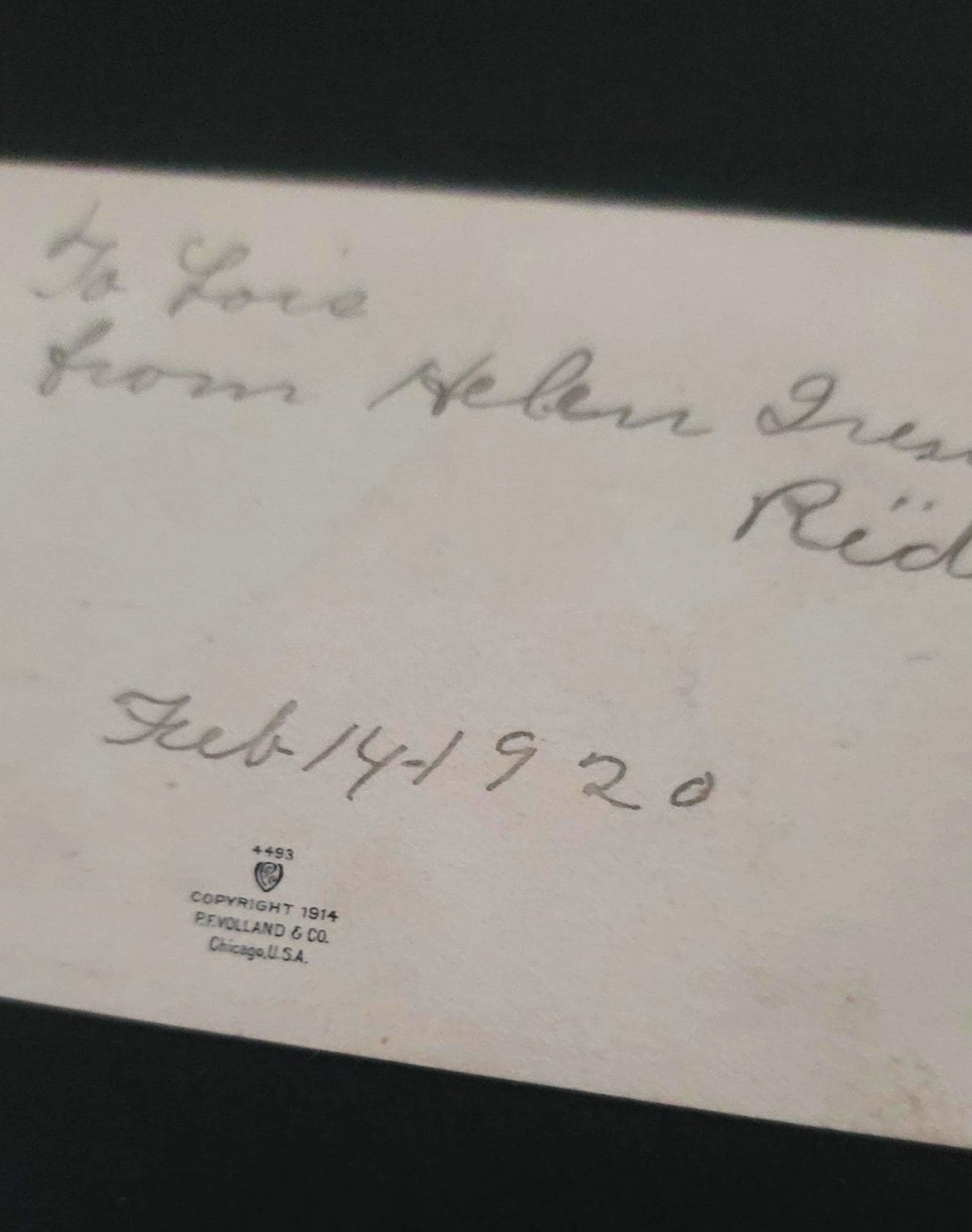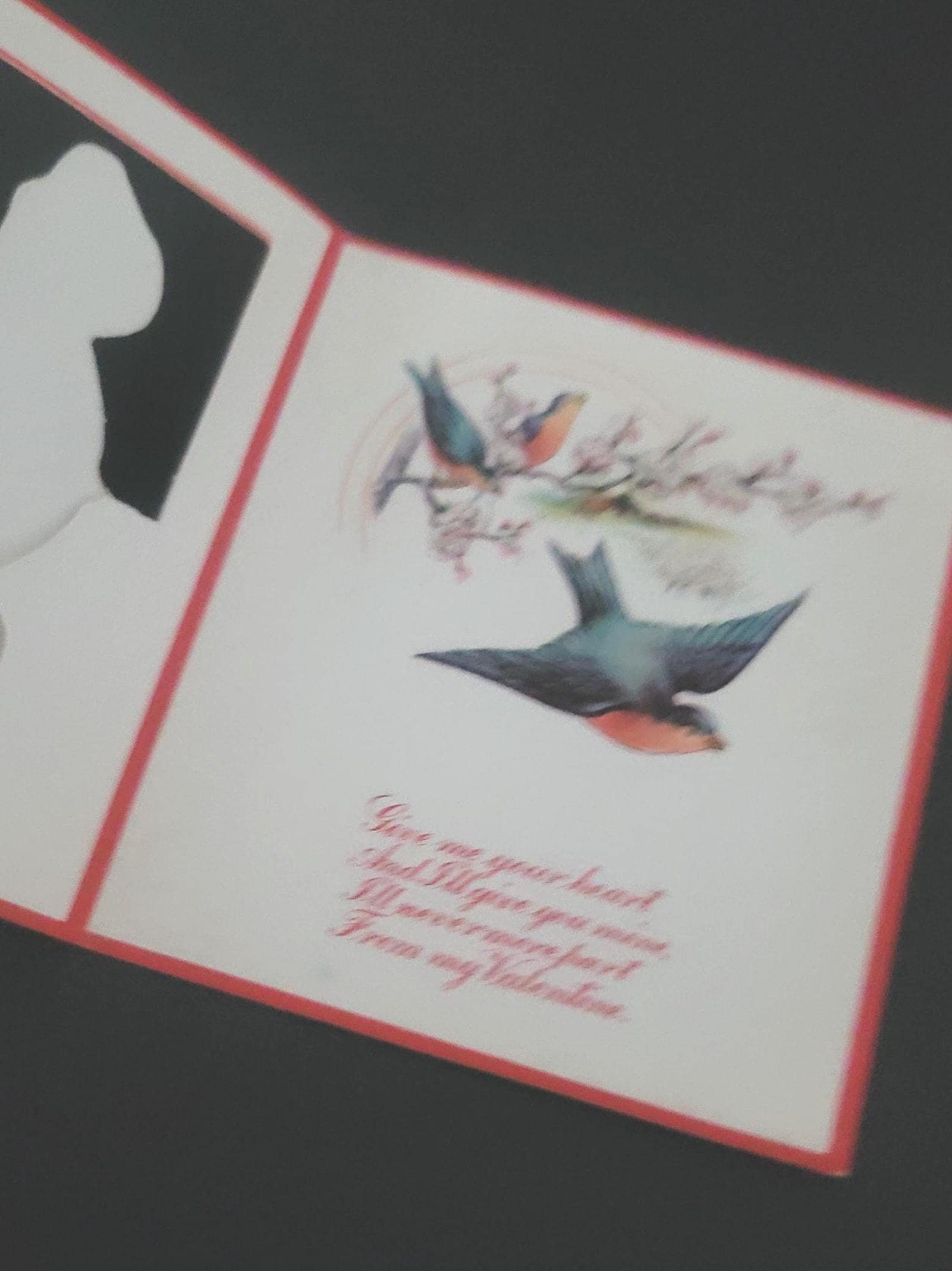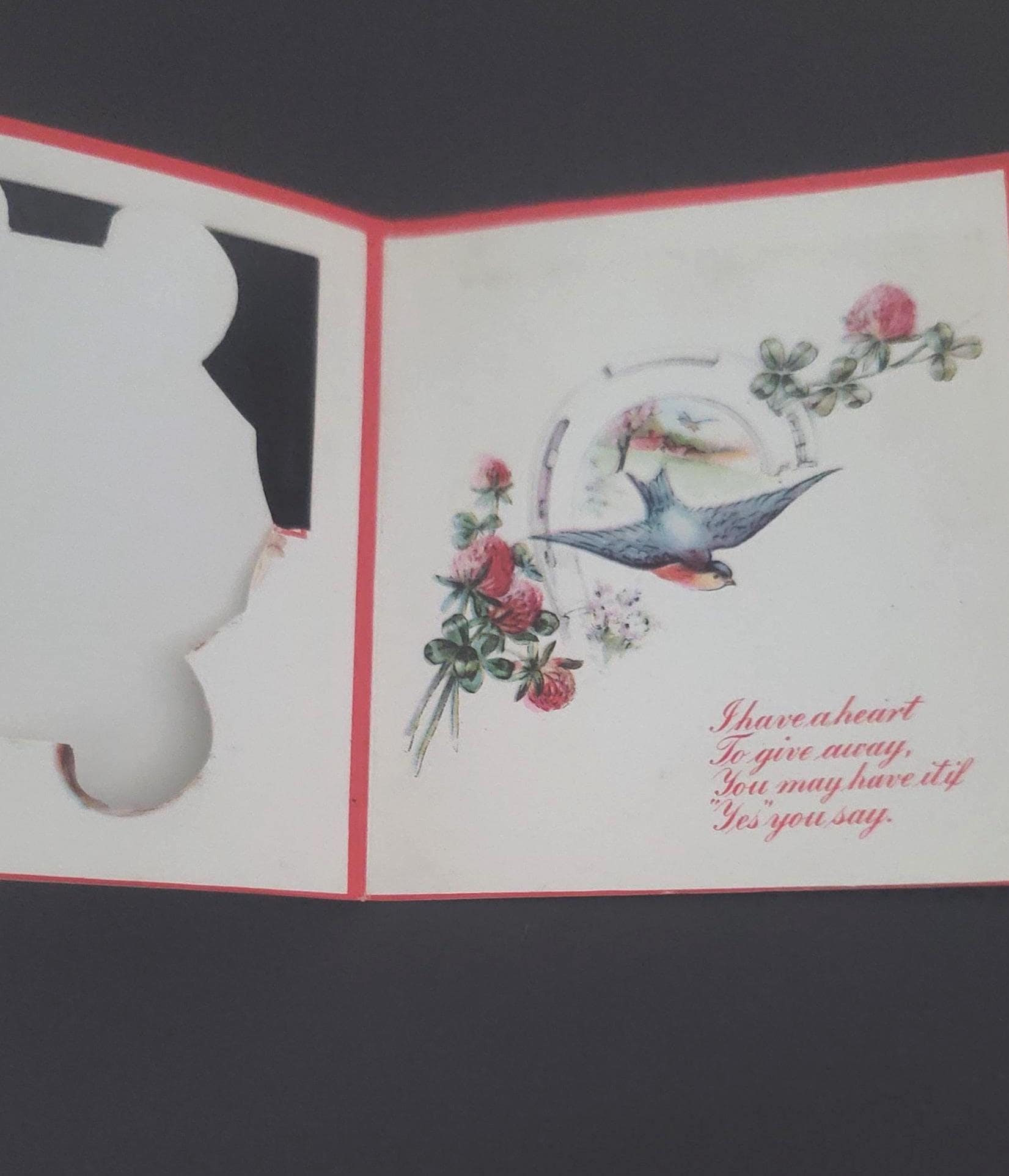 Here are four very adorable Valentines that are small. Smallest is 4.5 x 2.5" and largest 2 are 4 x 2.75". The 2 largest feature little die cut children that open up to birds and verse. The smallest one is like a mini postcard, signed on the back in pencil with the date Feb. 14, 1920 and the last is the beautiful Victorian style die cut with a boy carrying a girl on his back which moves to make it 3D like and says "from a true heart" in gold.