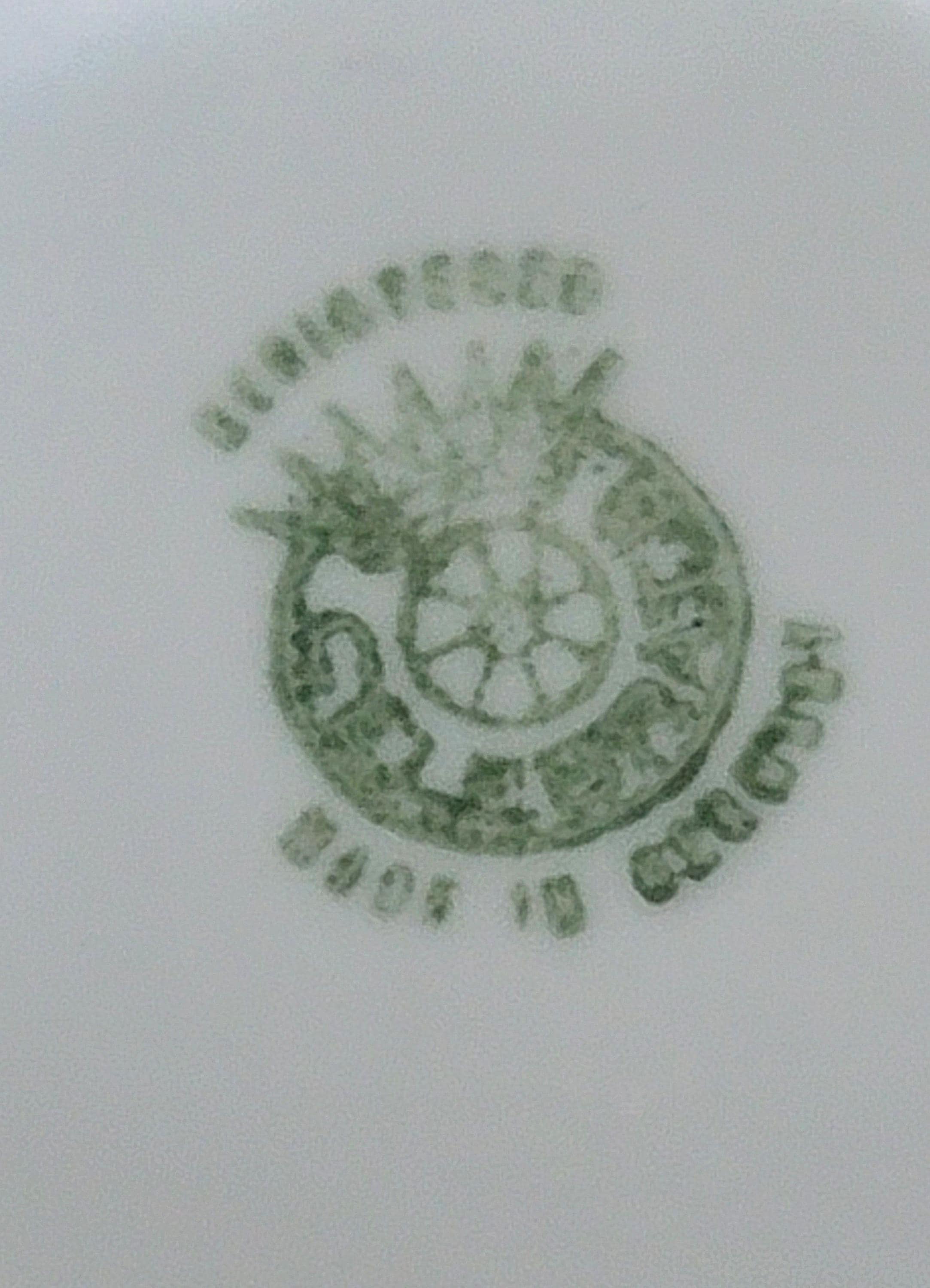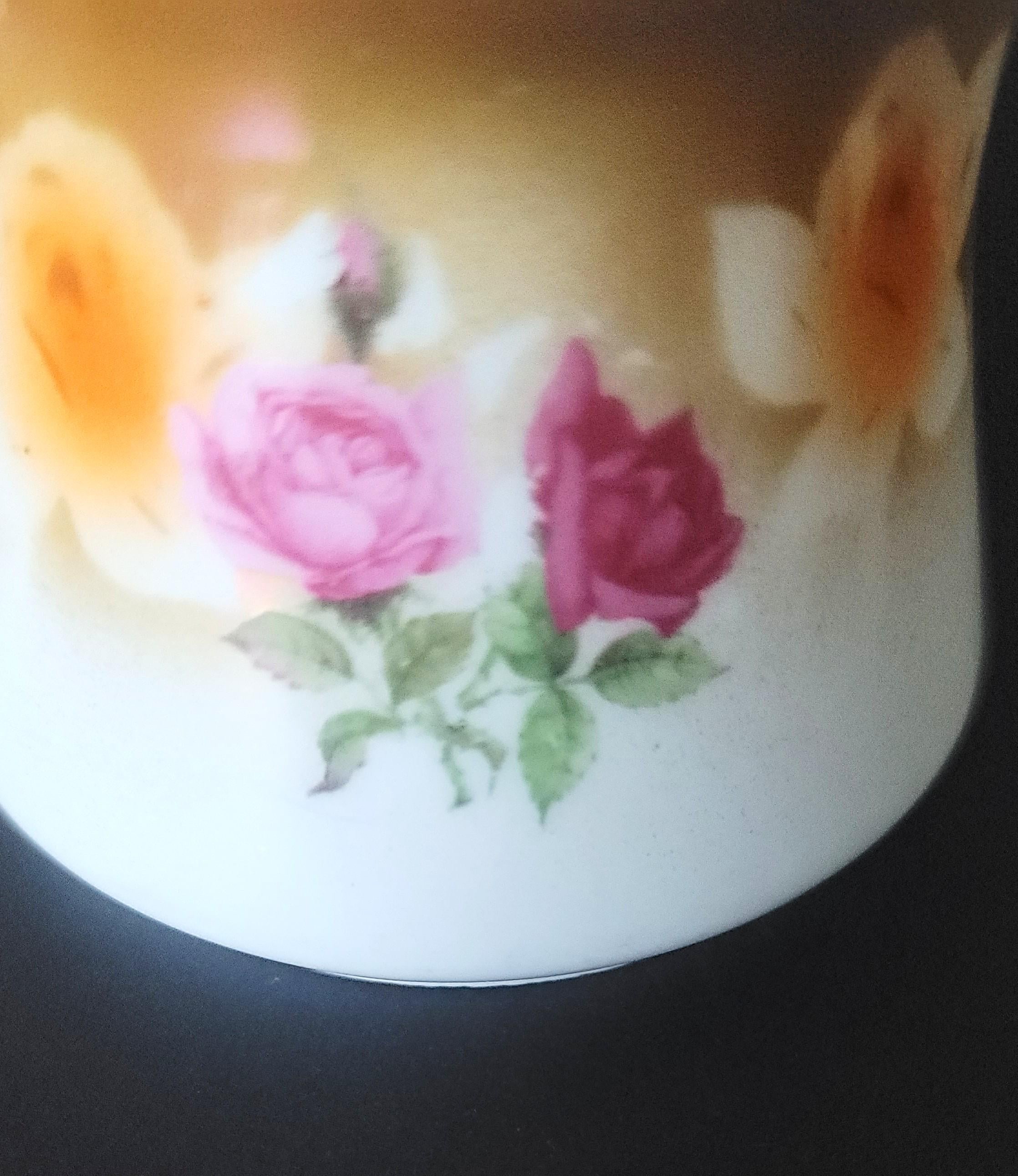 This little lusterware creamer is very pretty with it's pink and peach roses and it's light brown luster around the top. Has a really nice spout on it too. it stands 2.75" tall and the base is 3" in diameter and the piece comes out a little further than that. It has no flaws and waiting for someone that has a matching sugar bowl or someone that just loves the piece!
