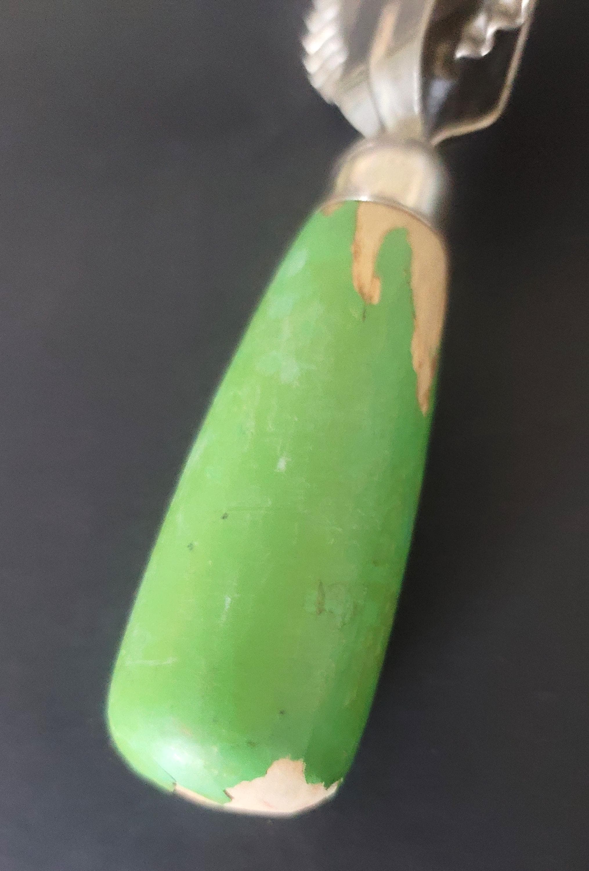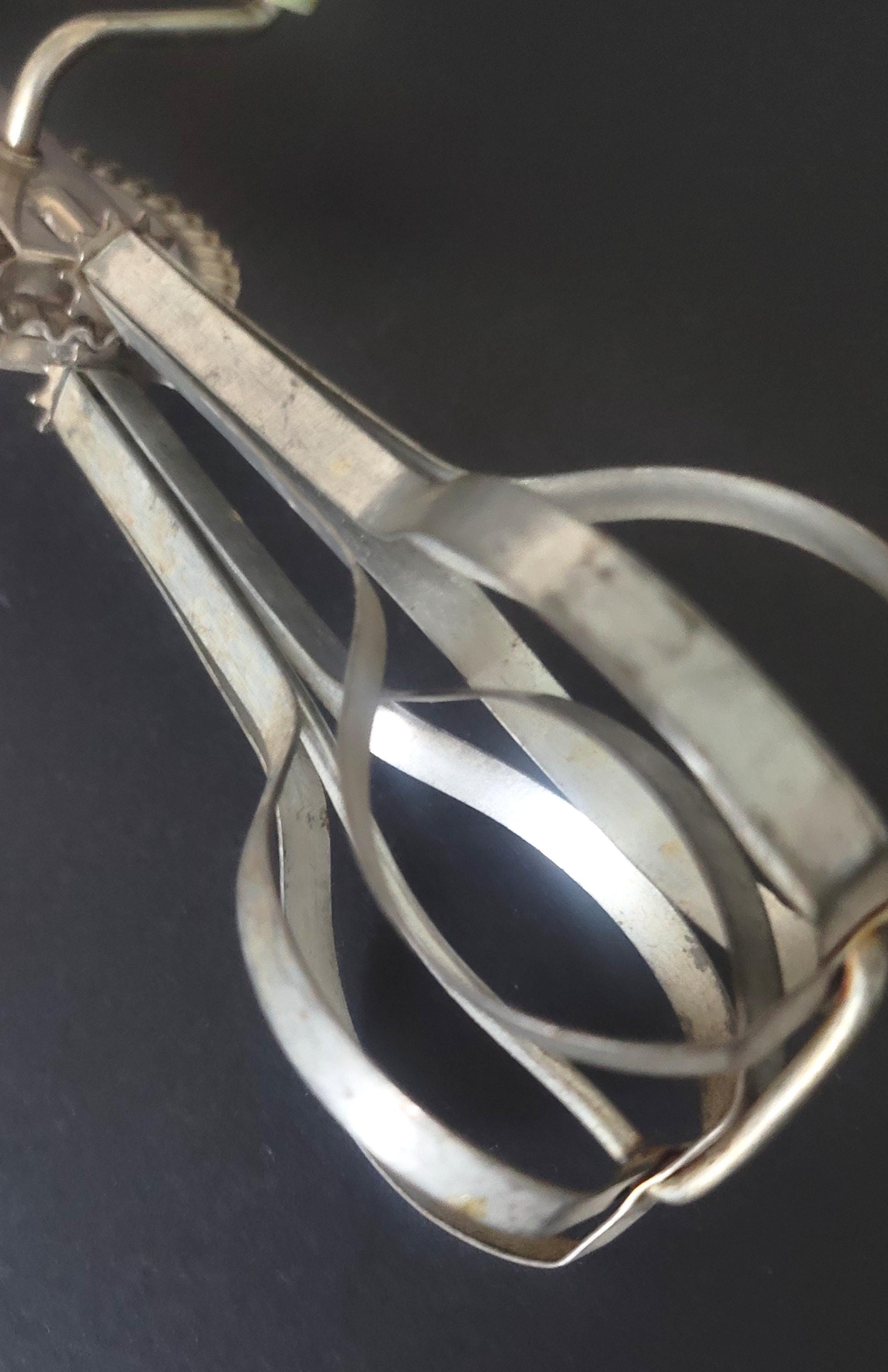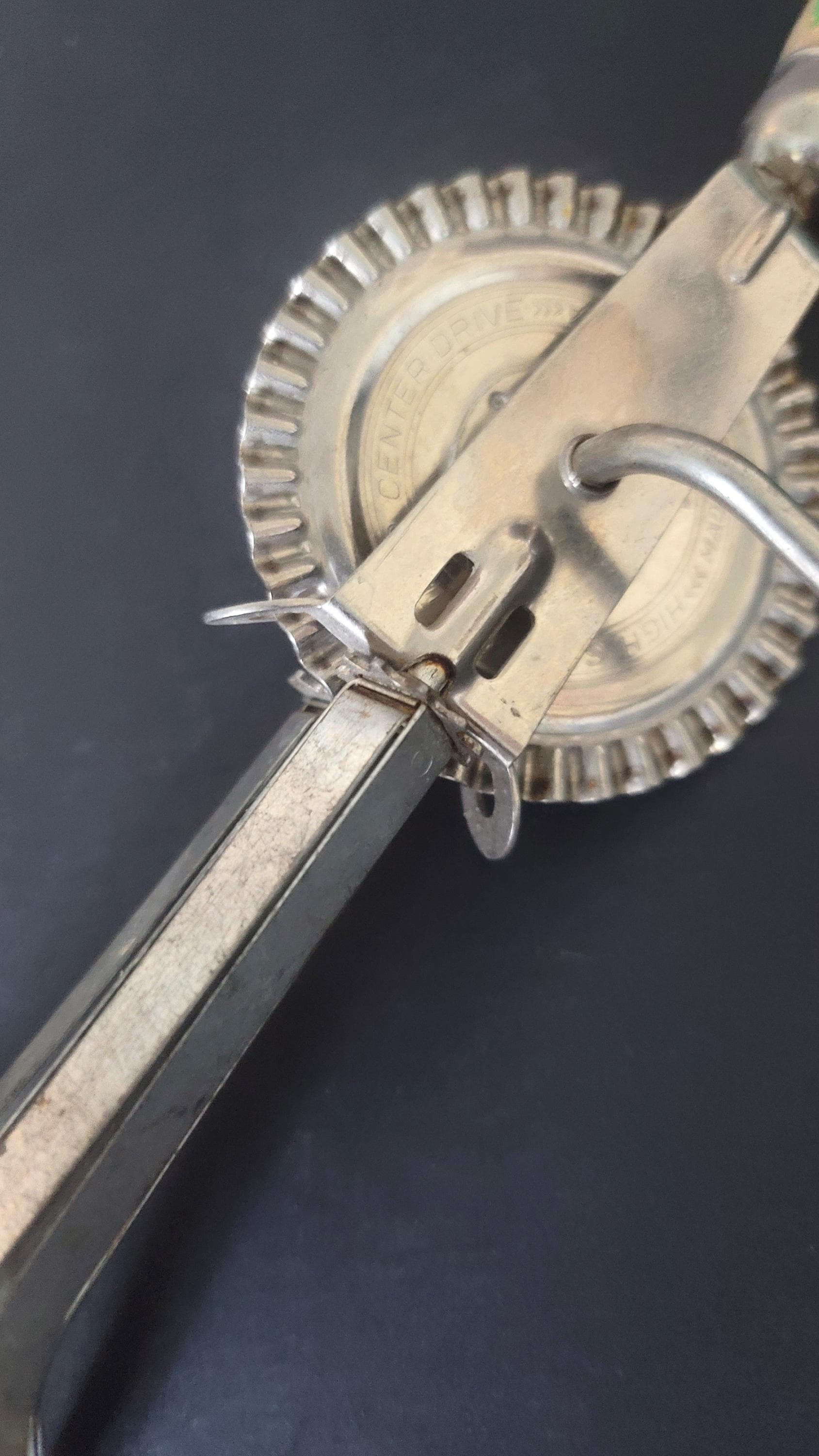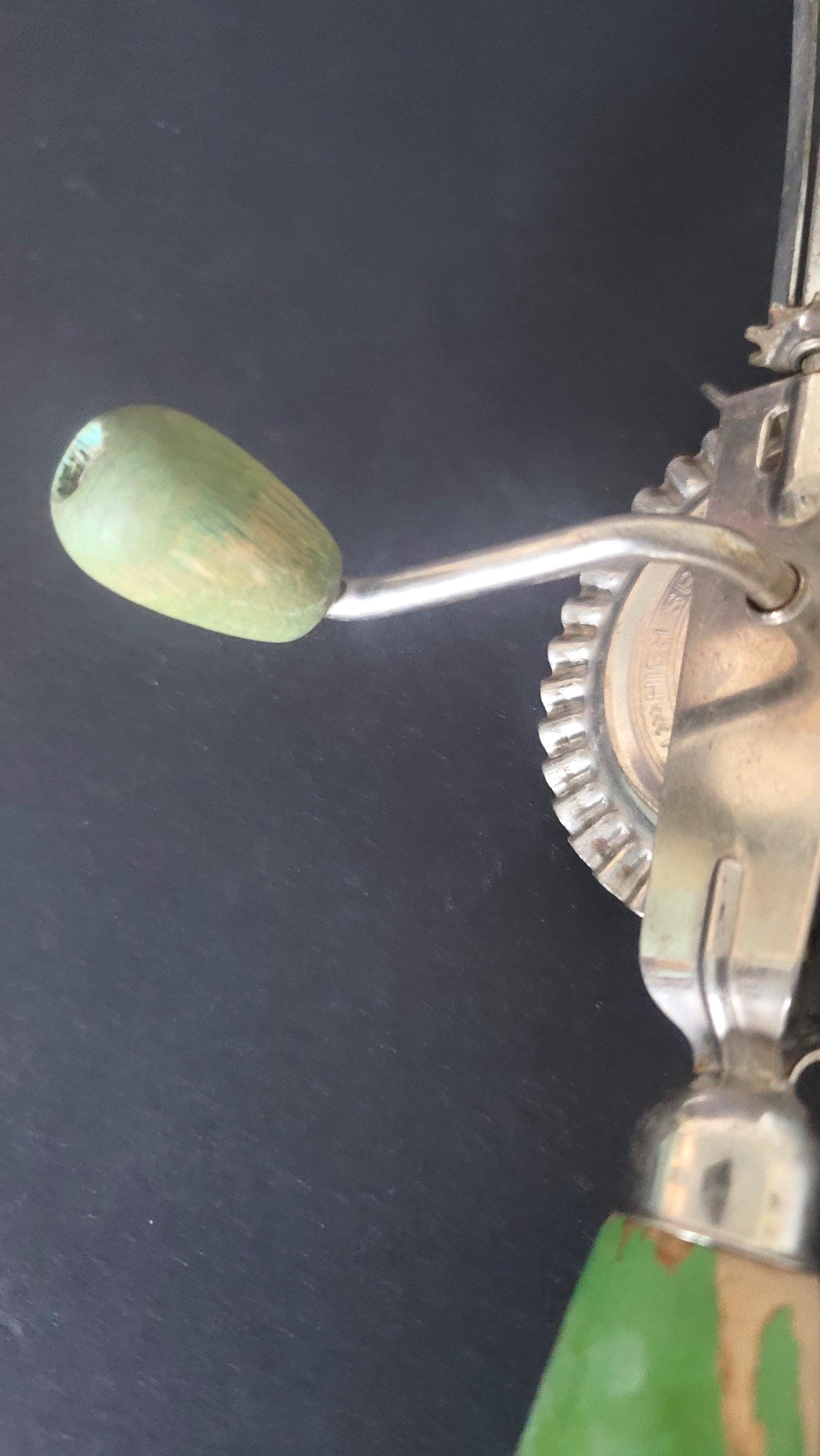 Here is a cool tool, perfect even for today even though this one was made in the 30s or 40s, when apple green was THE color before the 1950s mint green! This one works really well, spins fast and easy. It has been well used and is missing some of the green paint from it's wooden handles but that's okay, it just looks like it was loved. It is 12" long and it's marked "High speed super center drive Made in US America". Made by A & J Patent applied for.