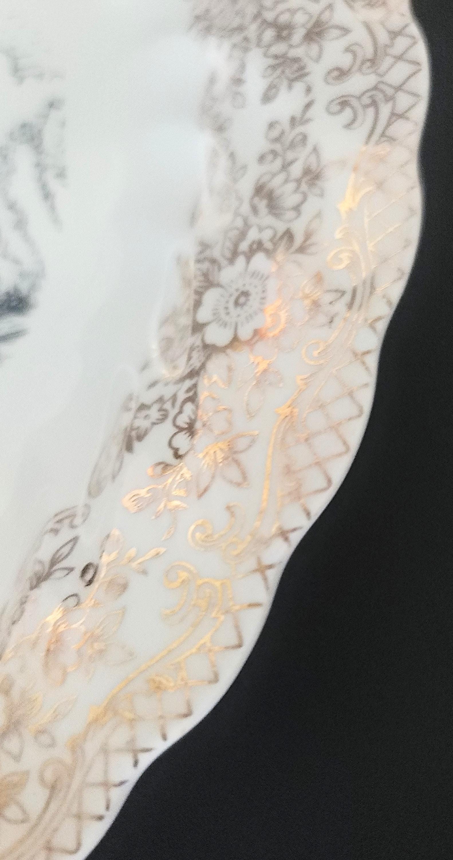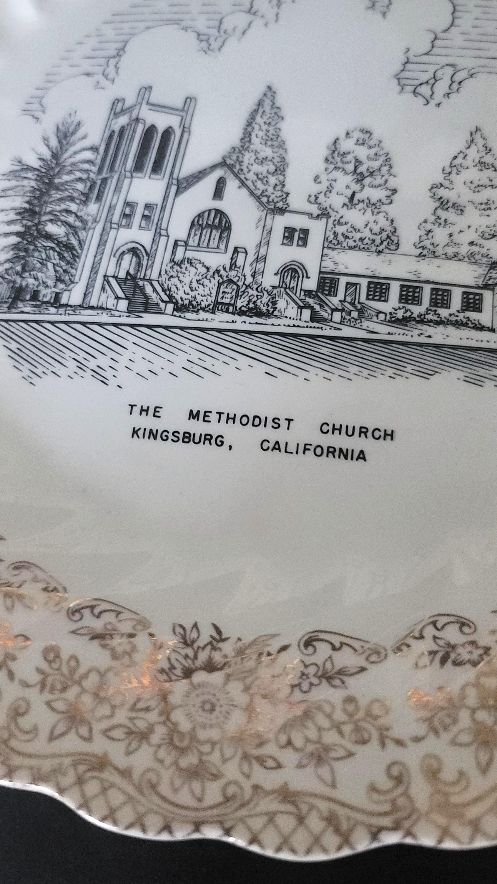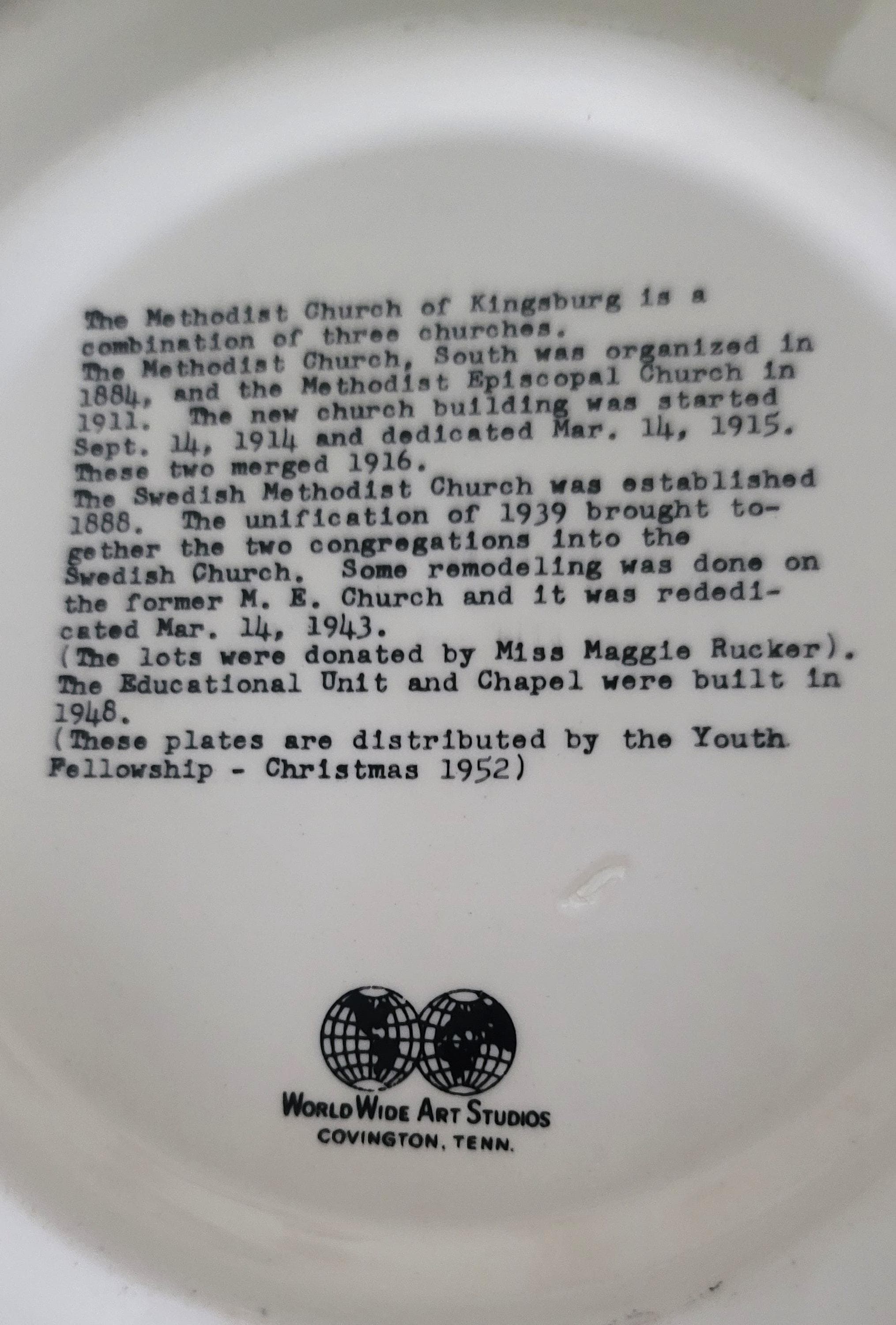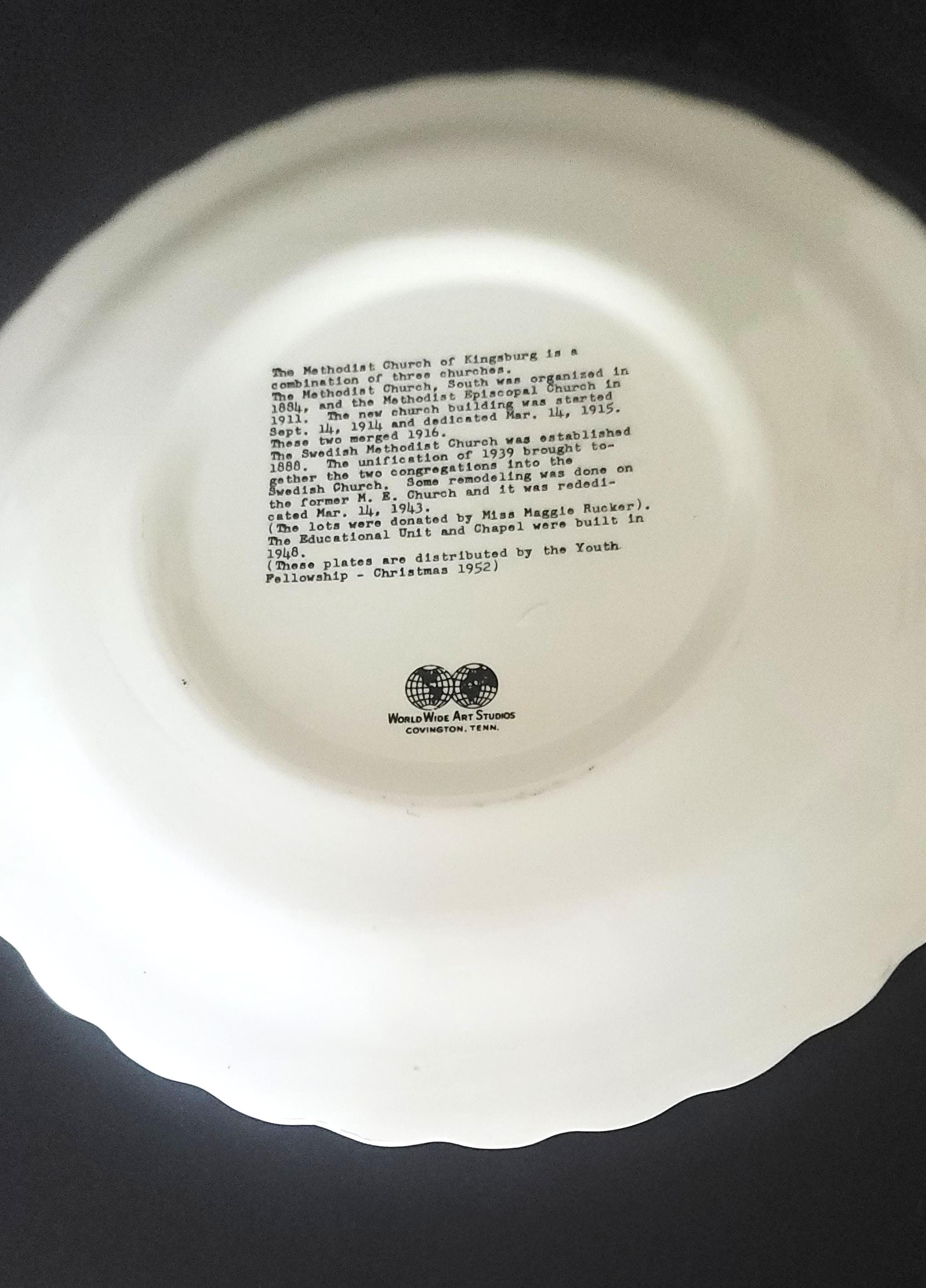 These were often made for fundraiser and this one has the 1950s style of gold design around the edge, this one is really pretty with the outer edge of lattice and then florals under some scroll work. It was made by World Wide Art Studios in TN. It has the story of the church and then at the end states that these plates were distributed by the Youth Fellowship in 1952. It is 10.25" in diameter and has no flaws.