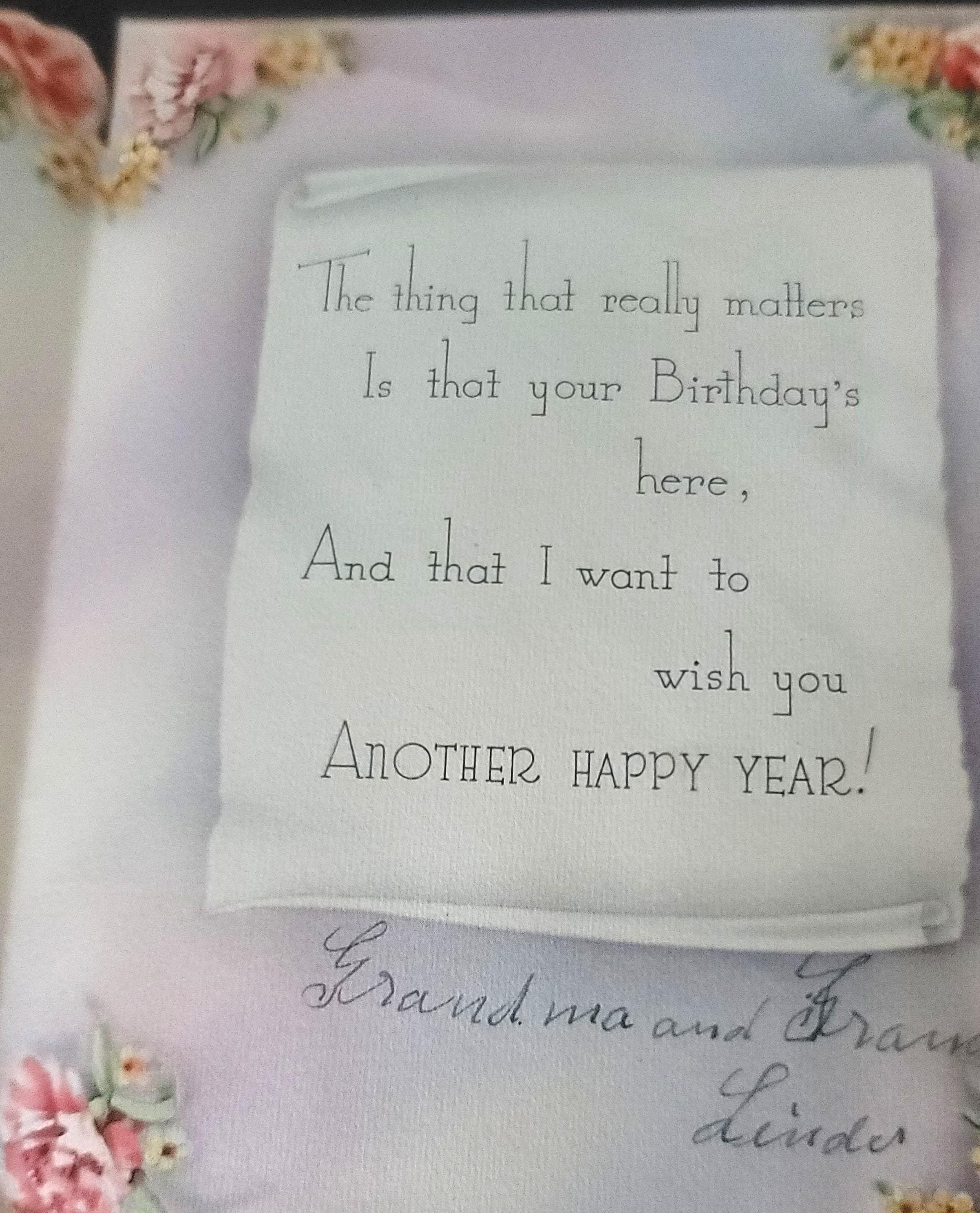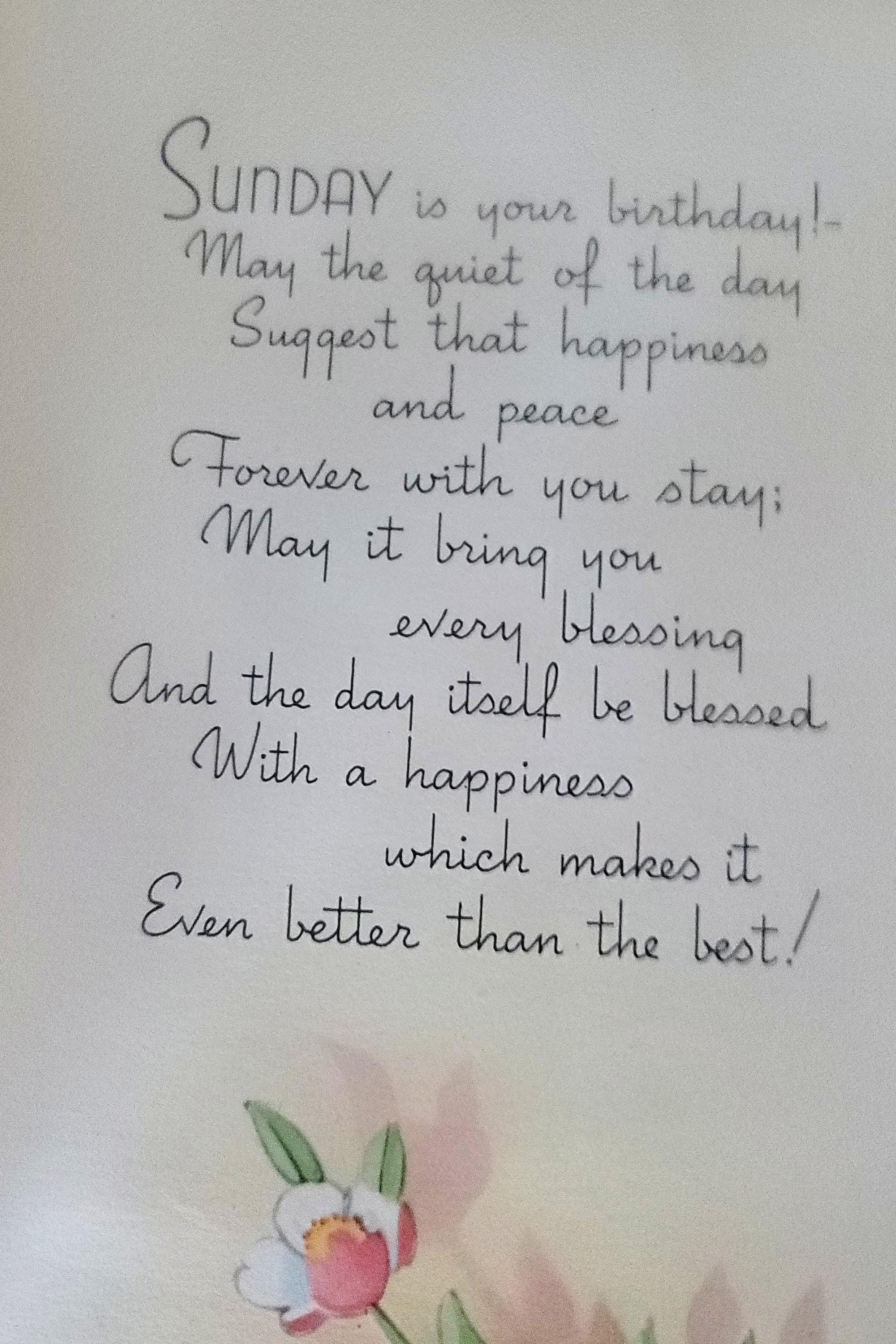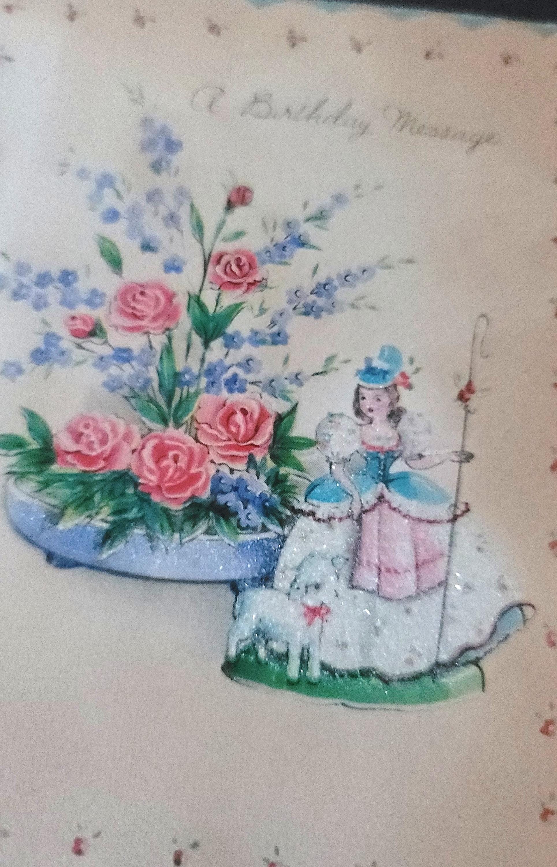 Here are 6 pretty birthday cards, I believe sent to a young girl as most are signed by grandparents in pen, except one which is in pencil. They are all florals with birds, butterflies or ribbon. One is for a Sunday birthday and one for a Monday as well. They are all approx. 6.5 x 4.5" or similar.