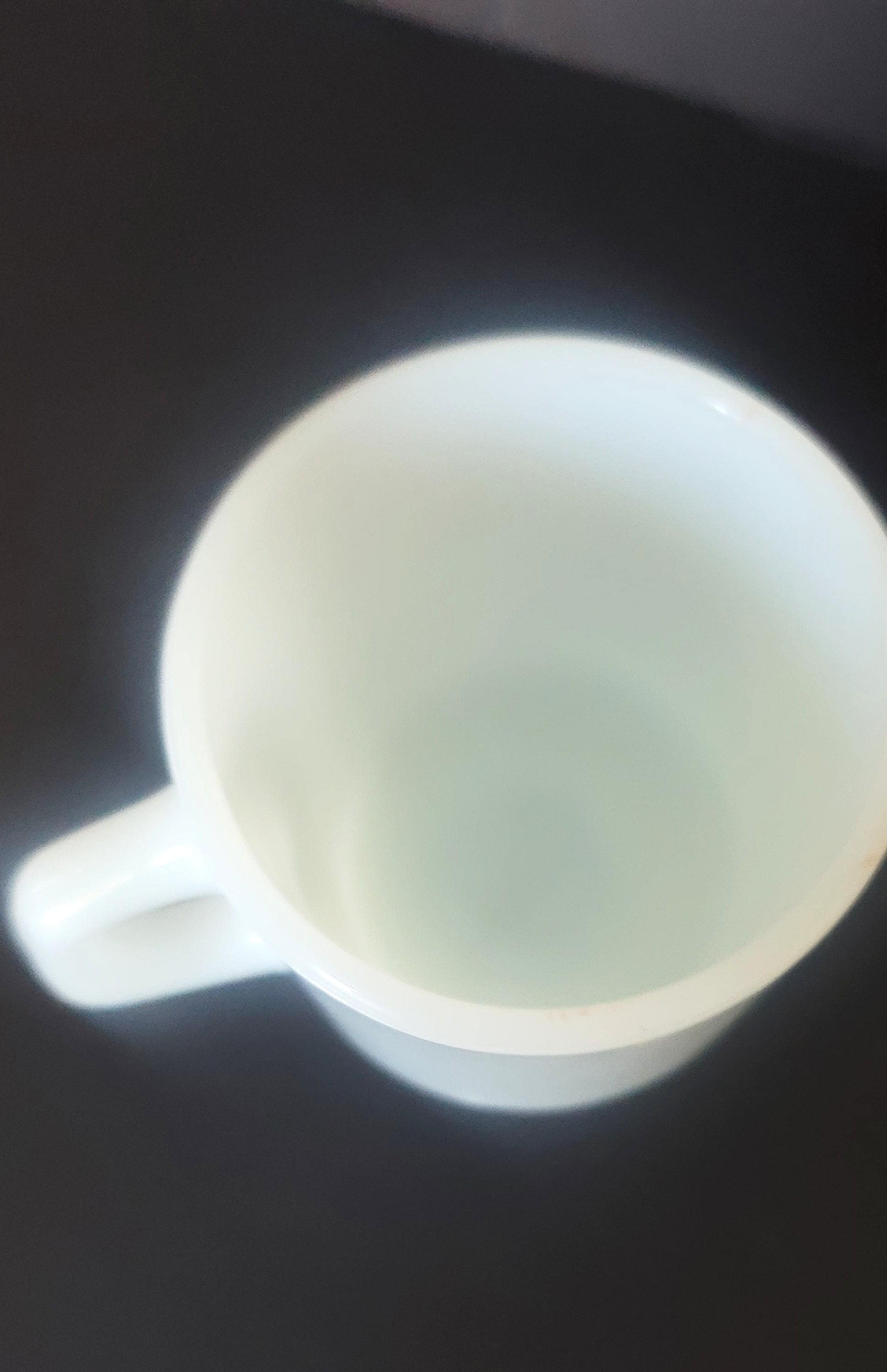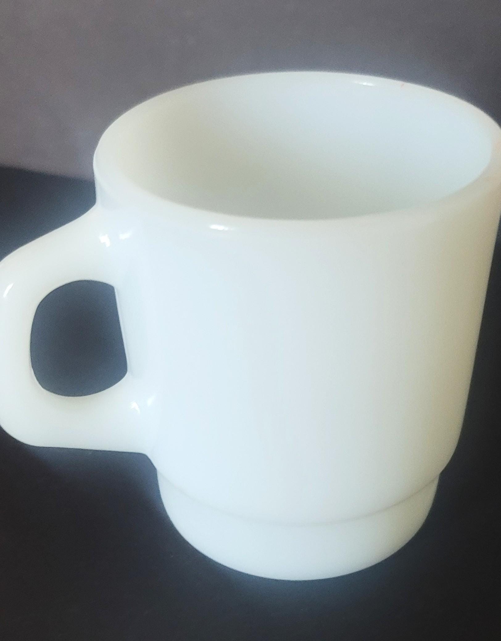 I'm sorry I couldn't get a better pic of the Fire King by Anchor Hocking logo on the bottom. It's really hard to see on milk glass but it is there! Heres a 1950s fire King mug, the kind with the indentation at the bottom to put in your drink holder. It is 3.5" tall and the top is 3" in diam and the bottom is 2.75" in diameter. No flaws in great condition.