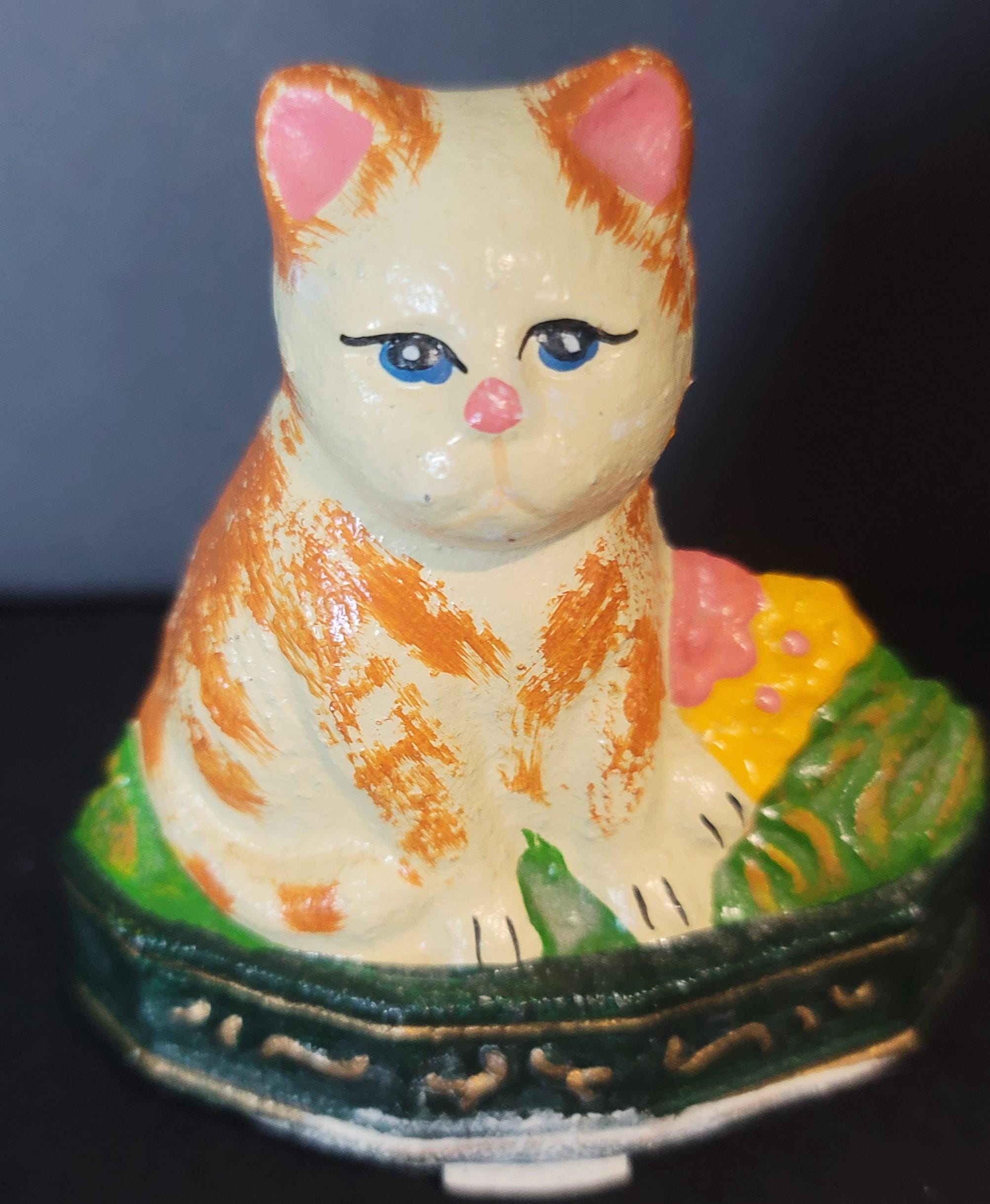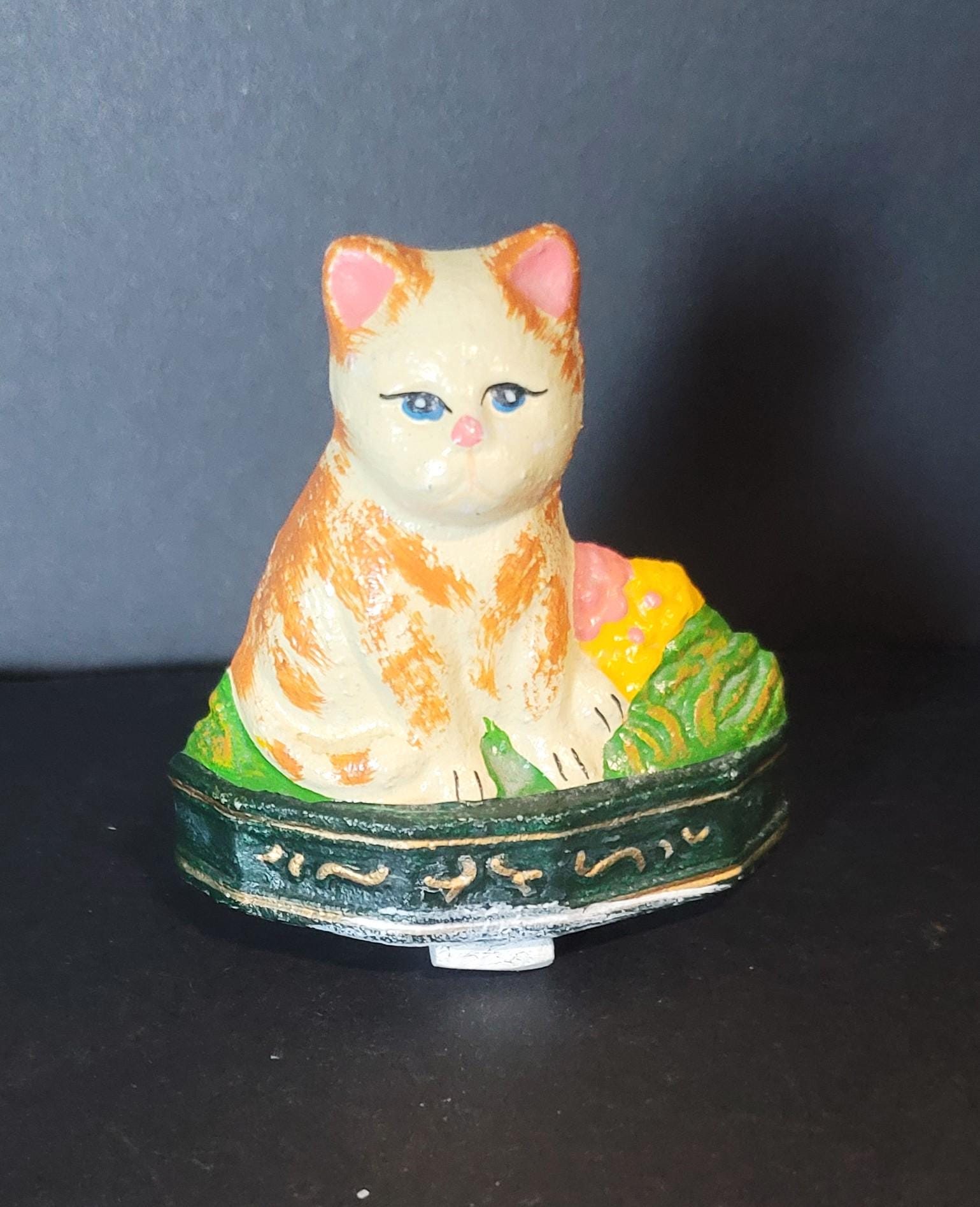 This pretty girl is from around 1920- 1930, made of cast iron and has no makers mark. She is in very good condition and is 4" tall, 4" wide and 4" deep. She weighs 13.4 oz. Free shipping in USA.