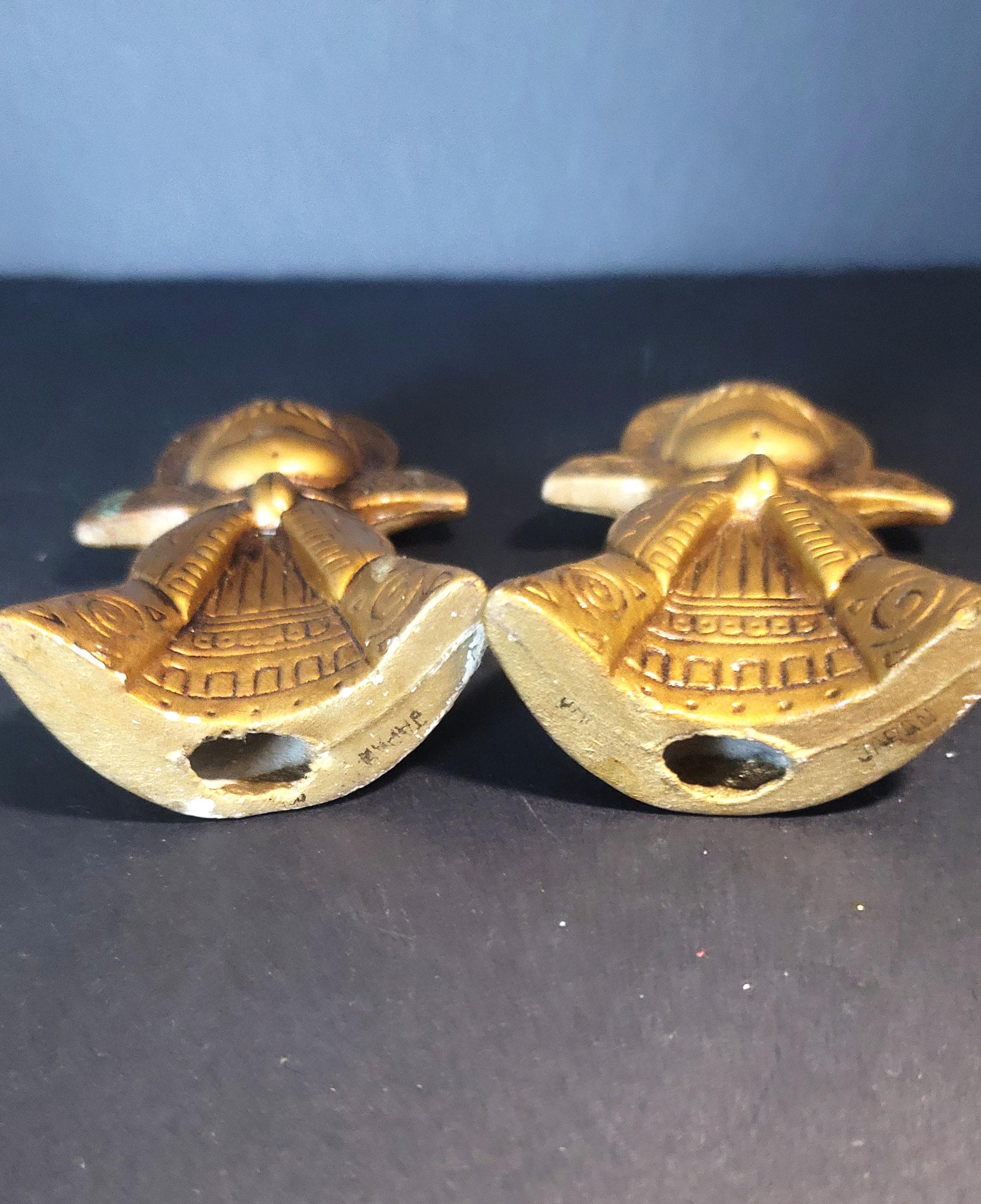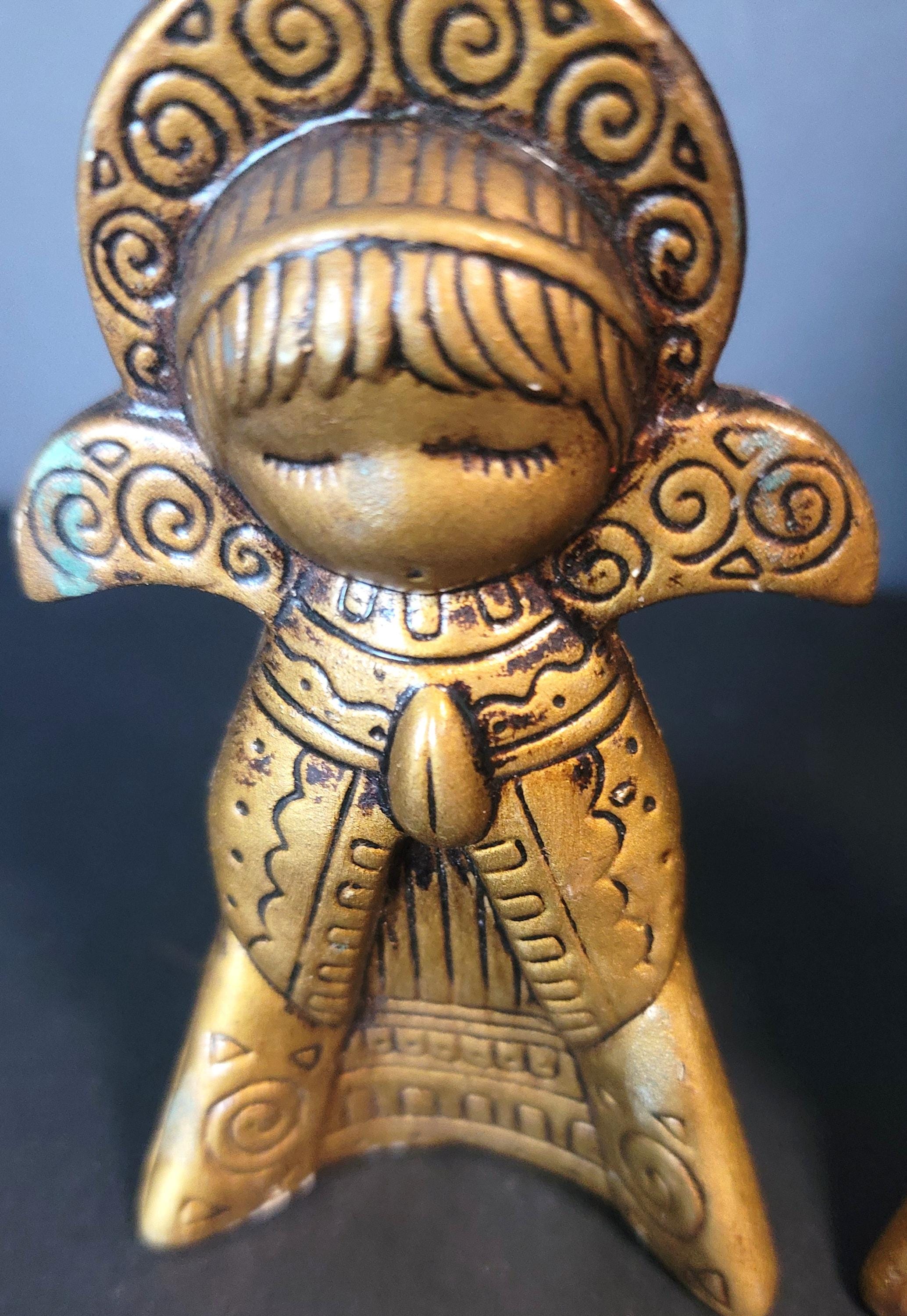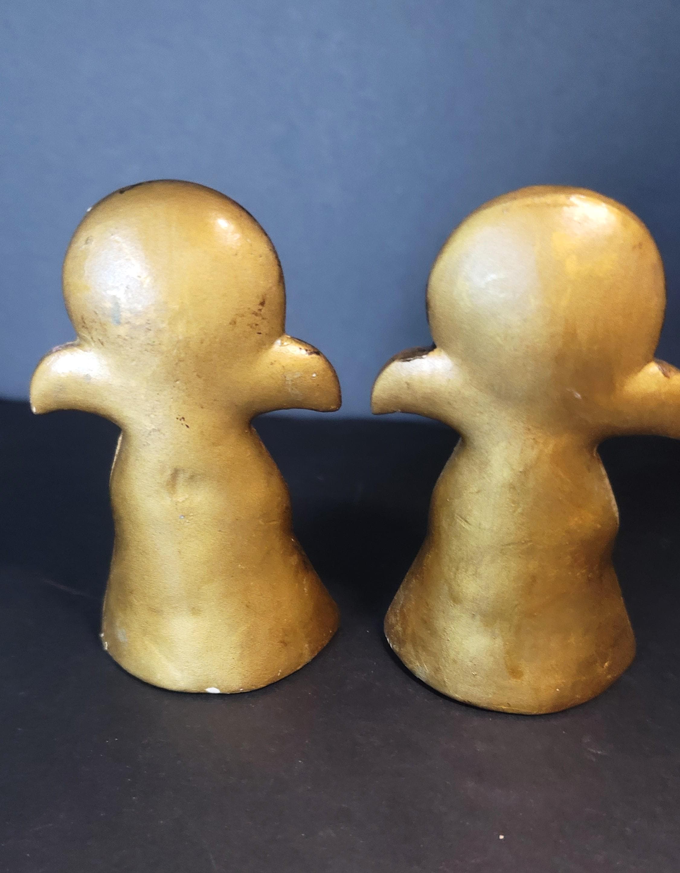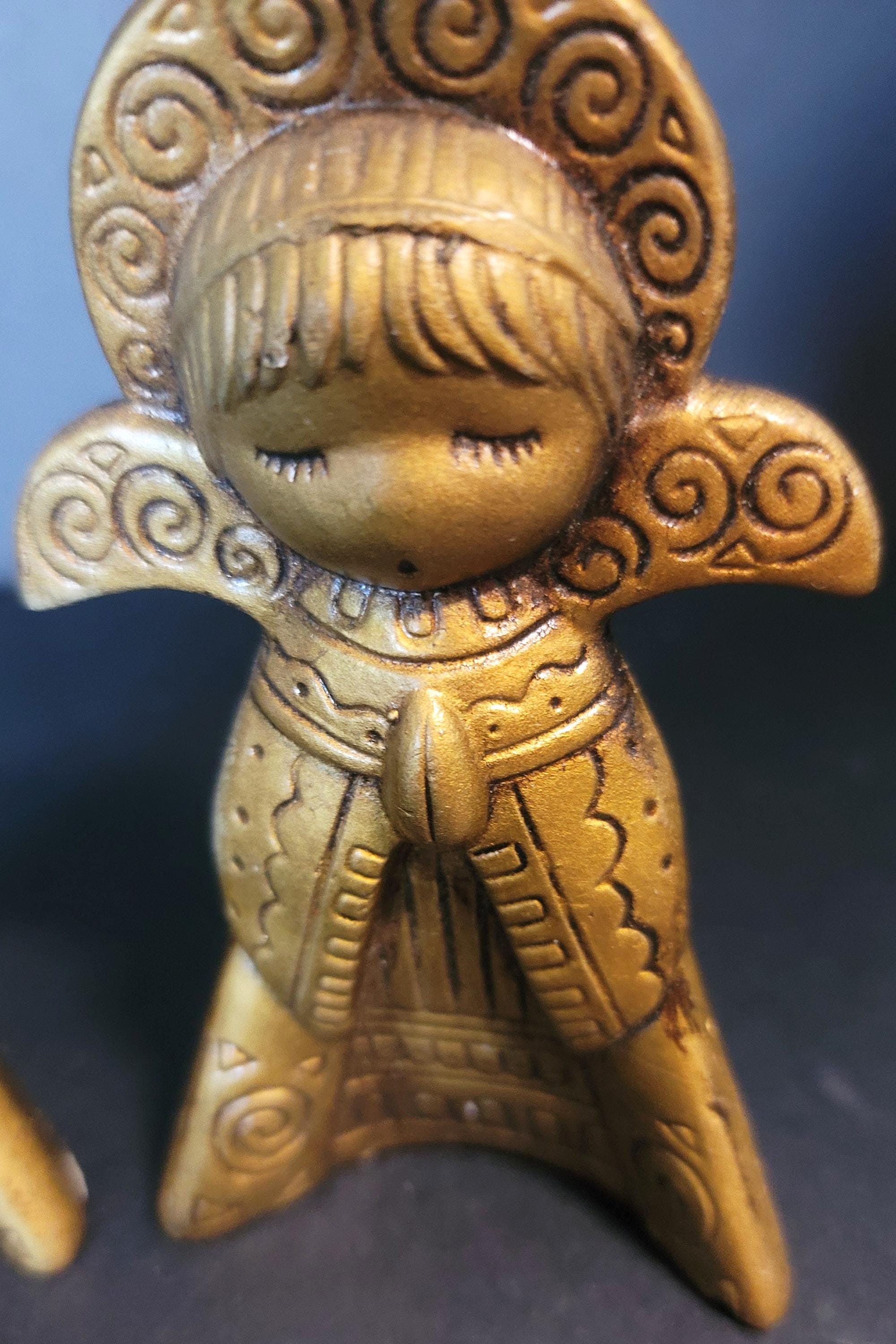 These adorable angels were made in Japan out of paper mache back in the 50s or 60s. They are lightweight, stand up perfectly and are each 5 x 2.75 x 1.5". They each have a couple of tiny spots- pen size spots of white where the gold didn't penetrate or were just worn off. Don't notice it unless you are looking for it and a tiny touch of gold paint would fix it.