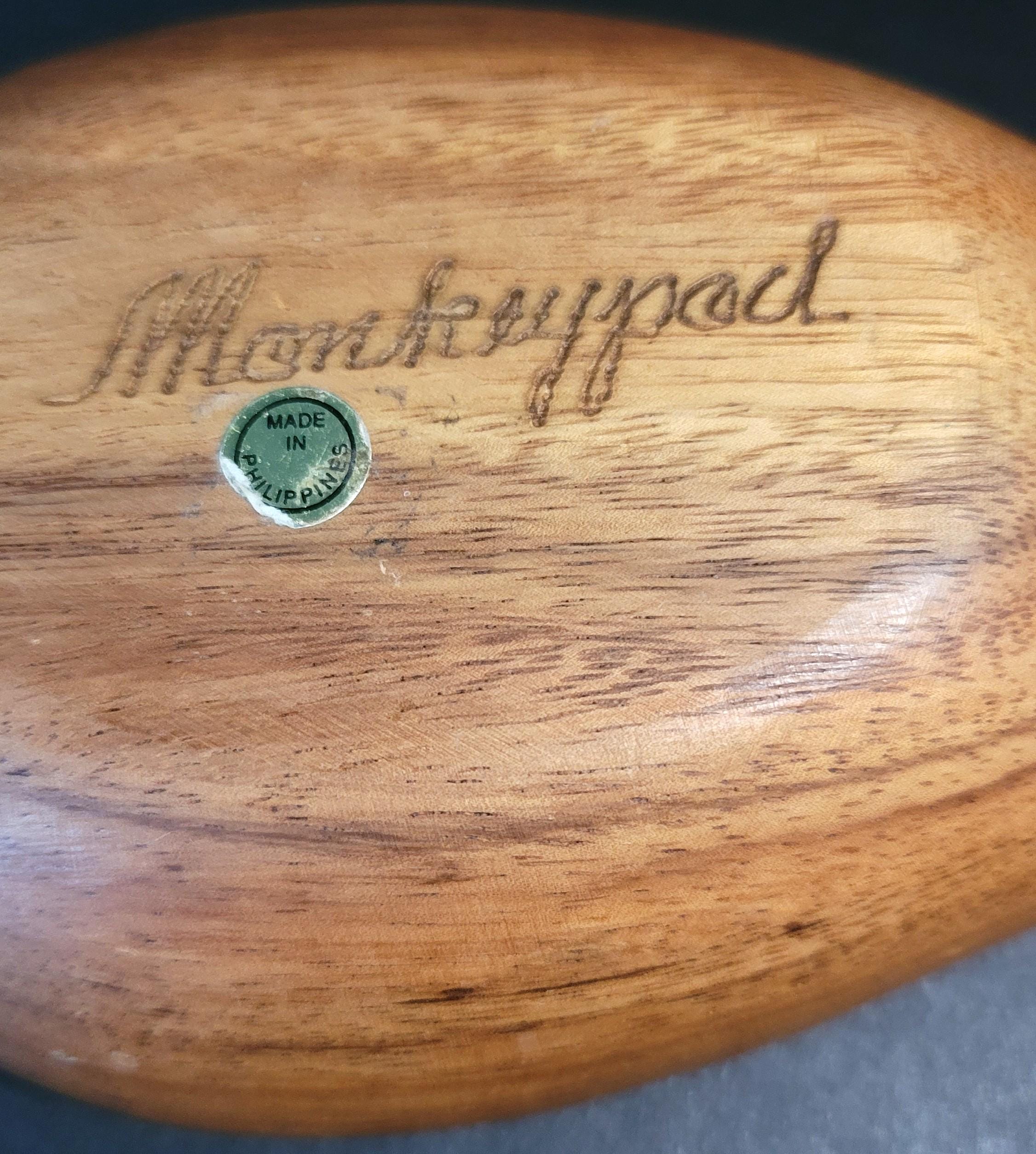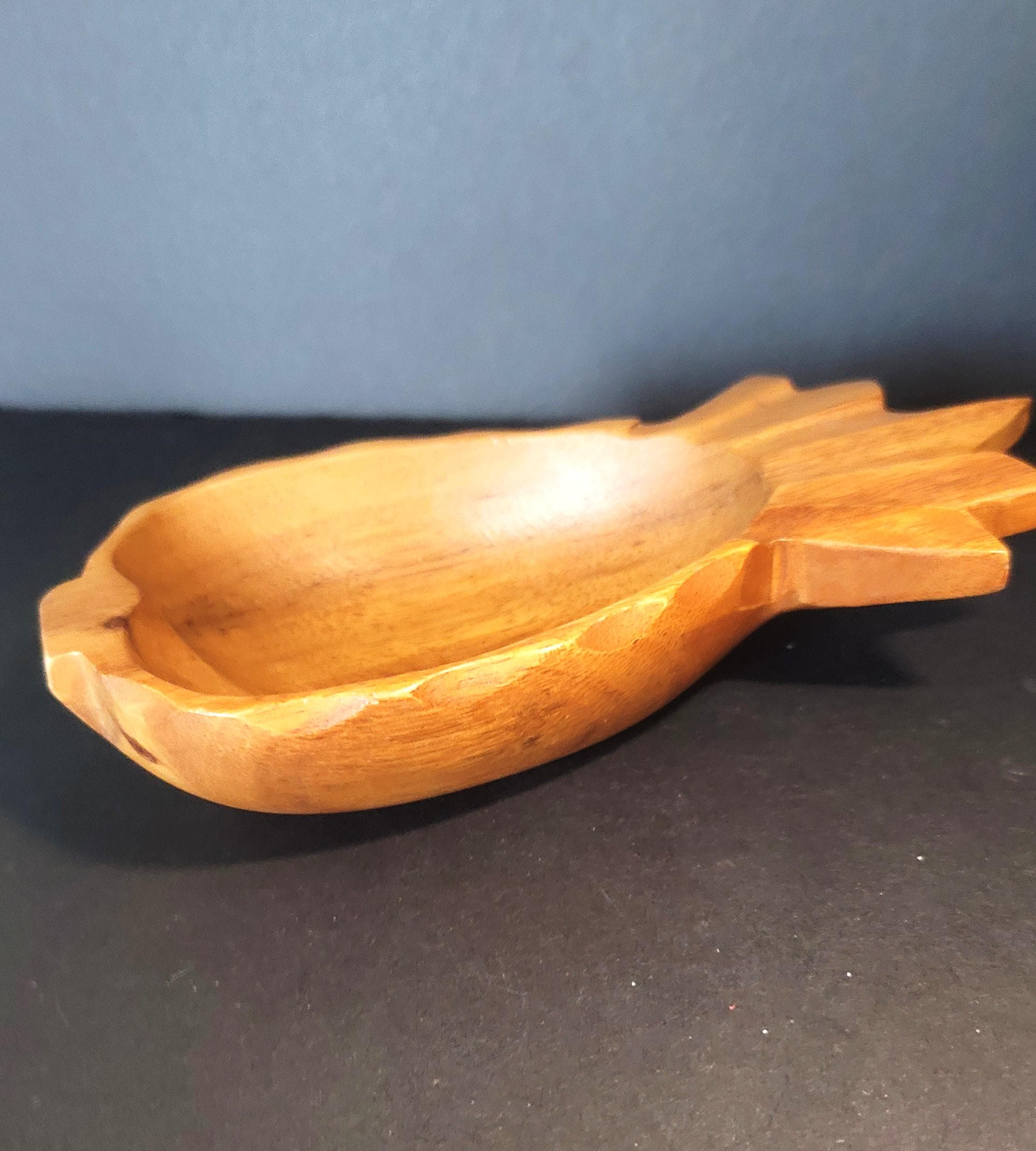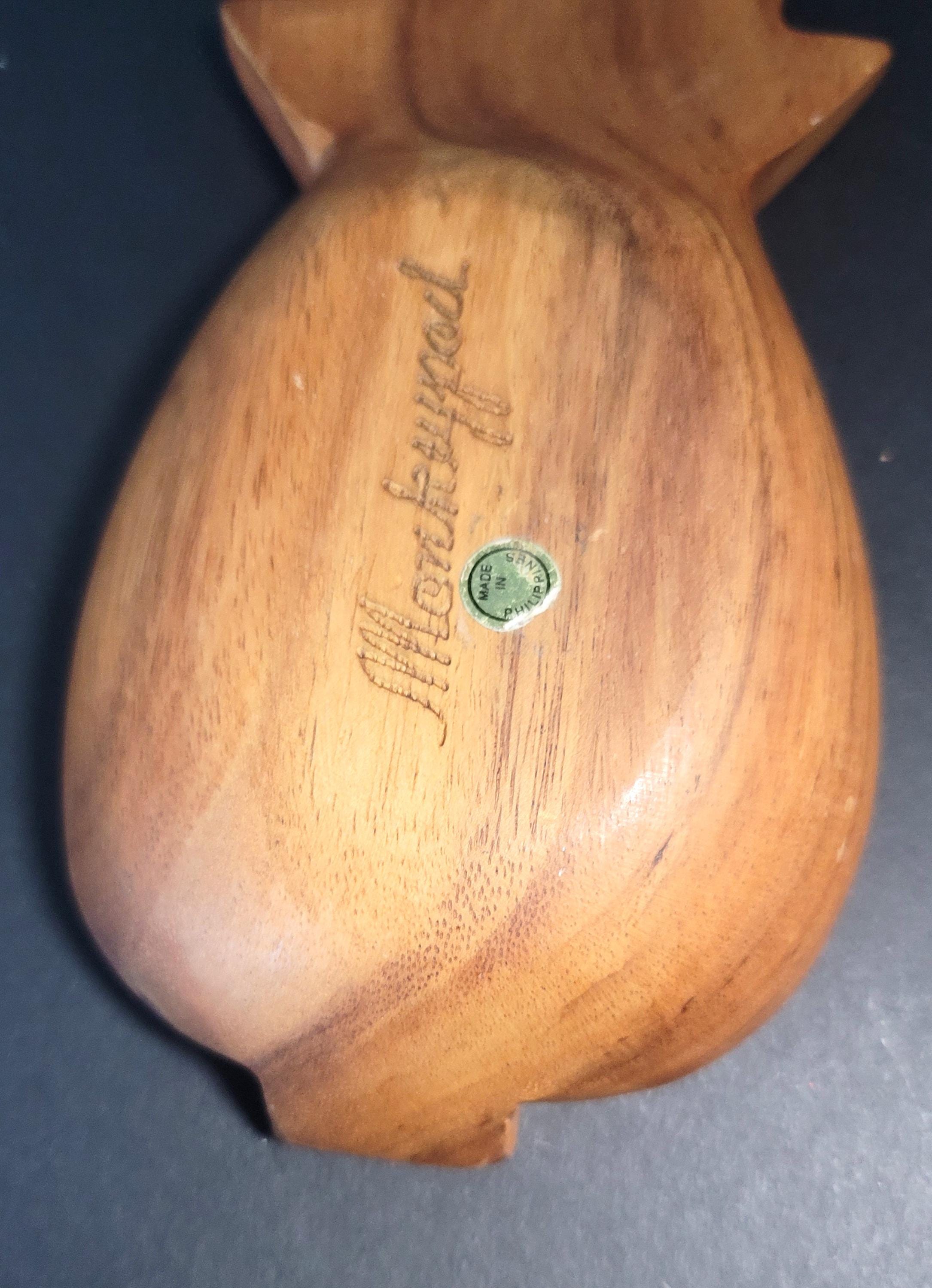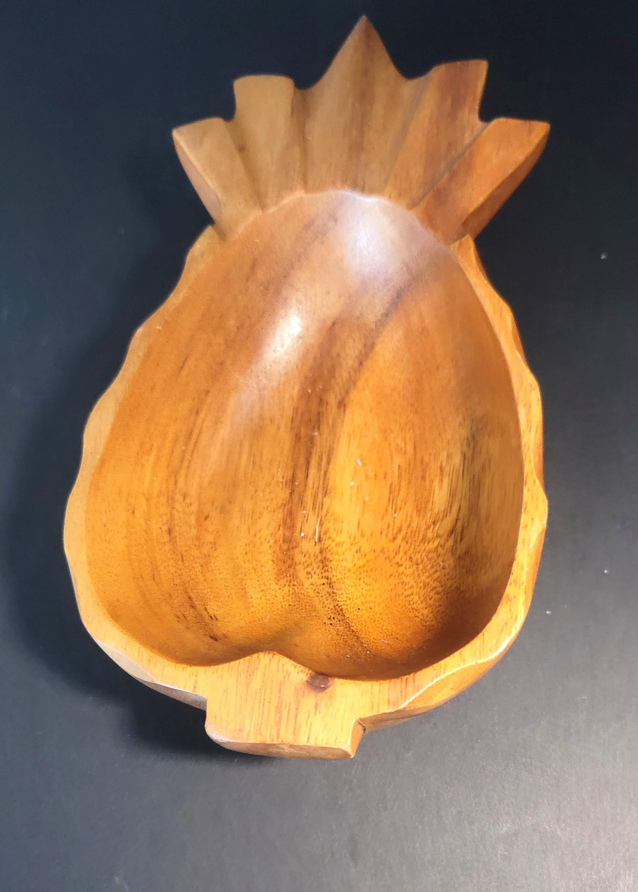Here is an original monkeypod bowl from the 70s in the shape of a pineapple. Although these were usually bought in Hawaii, they were made in the Philipines. It is signed on the bottom. This one is 9 x 5 x2" and the bowl part is 5.75 x 4.5 x 1.5". It's in really good condition and would make a great bowl on your patio!