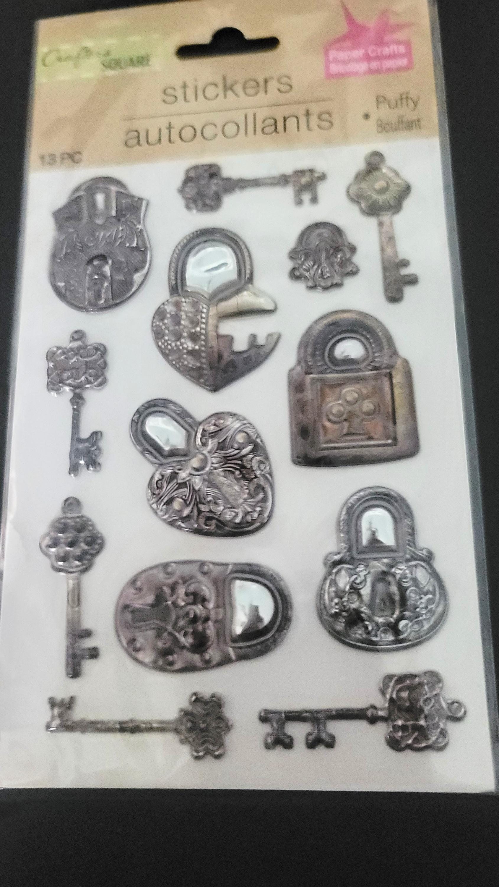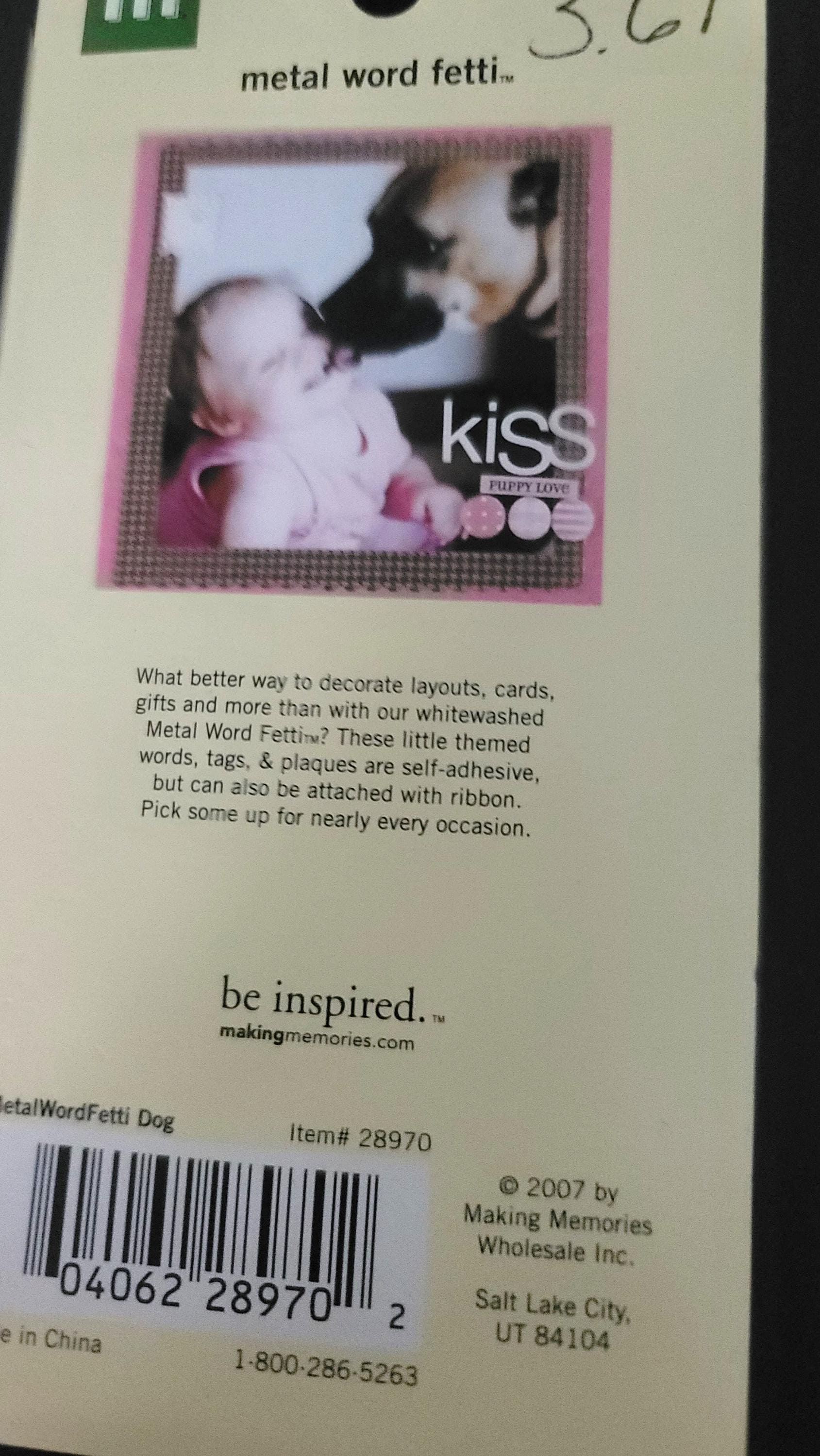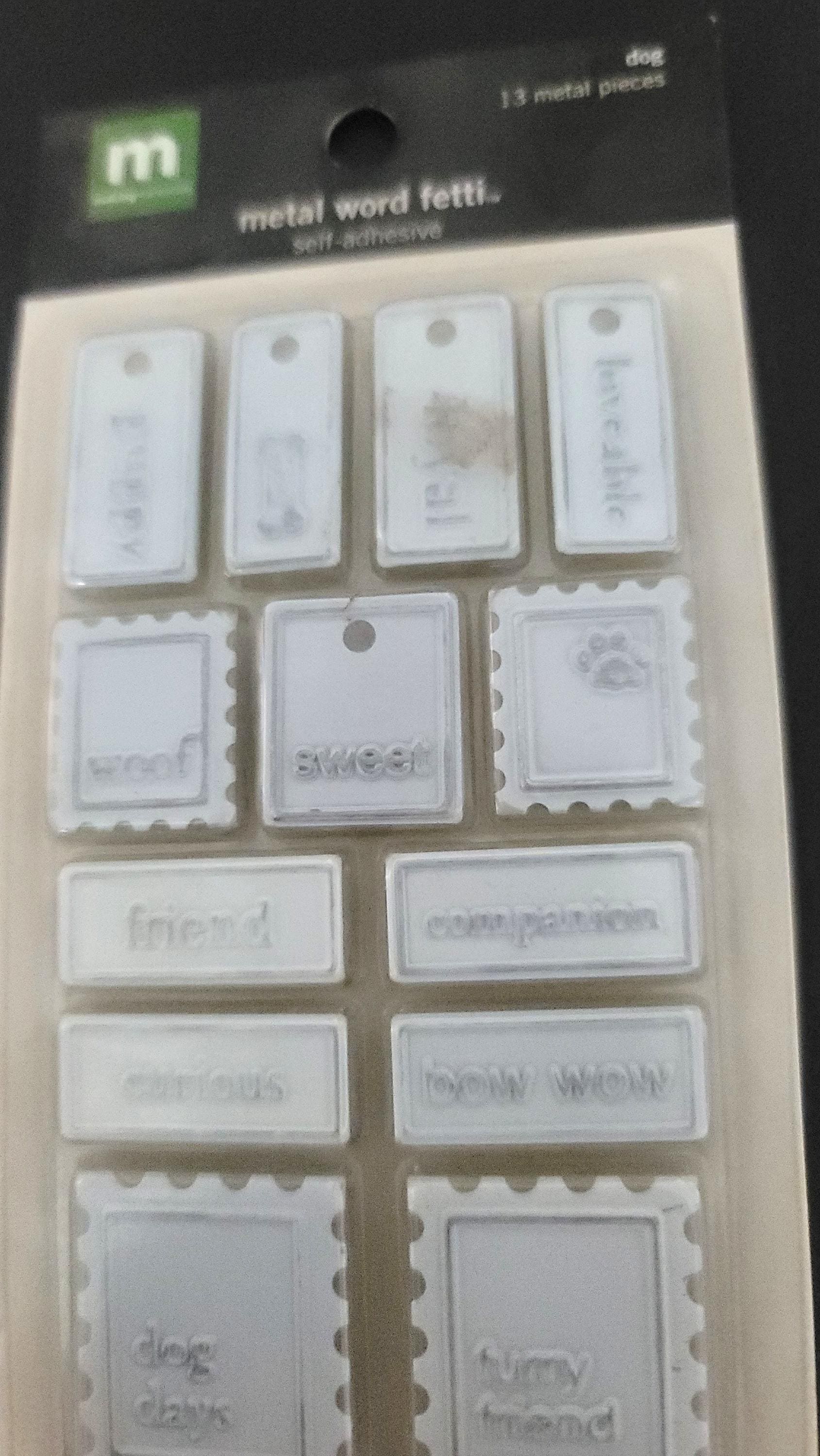 Here is a little random set of supplies which include an Accordian Keepsake Book by Zsiage which is acid and Lignin Free Cardstock finished size 6" x 12". Also includes some raised silvertone lock and key stickers (puffy stickers) with 13 pieces by Crafters Square and a package of 13 metal word pieces which are self adhesive put out by Making Memories. They are dog related and include words such as Woof, Furry Friend, Sweet, Lovable, Puppy and more. They are of various size. None of these items have been opened.