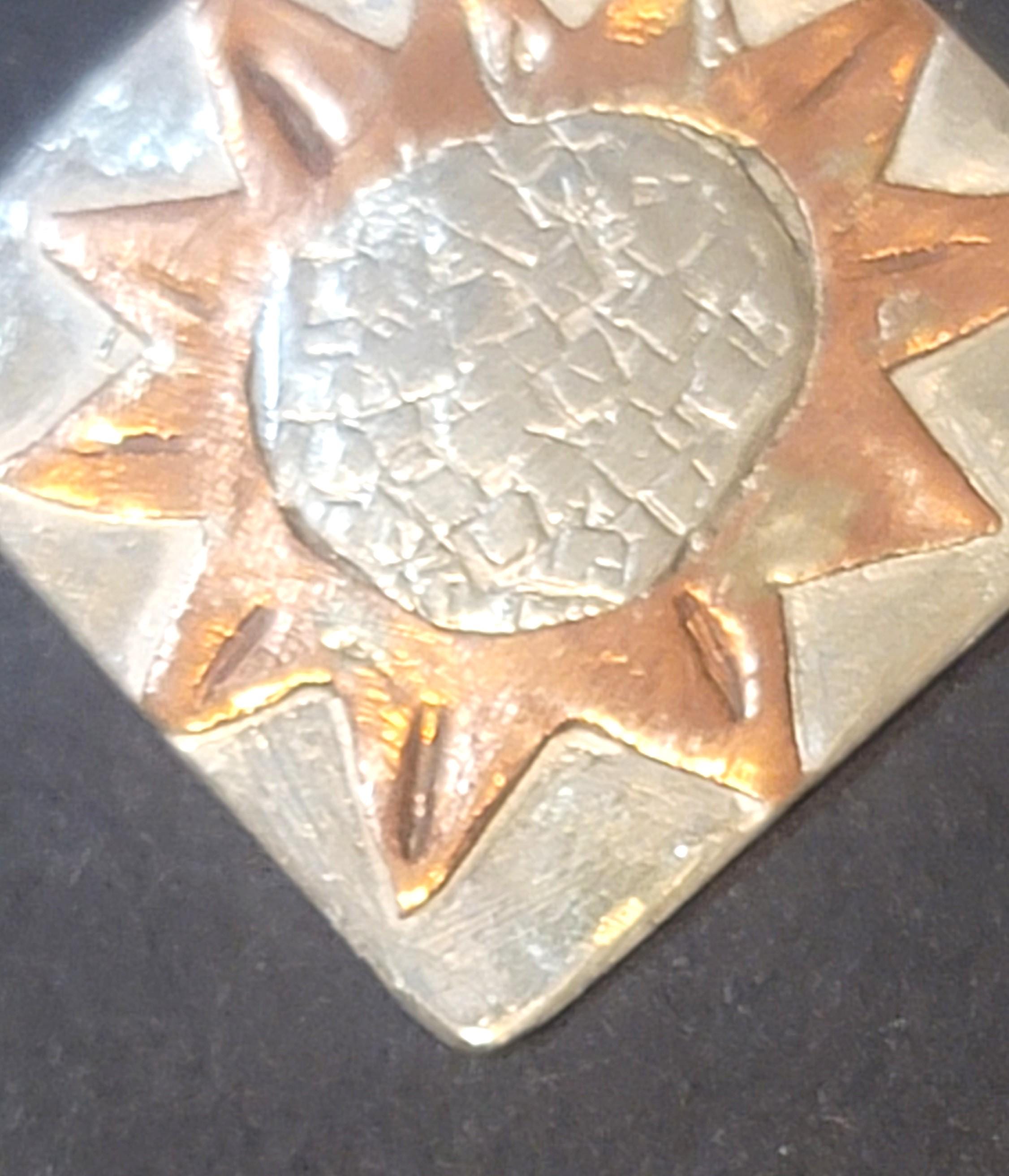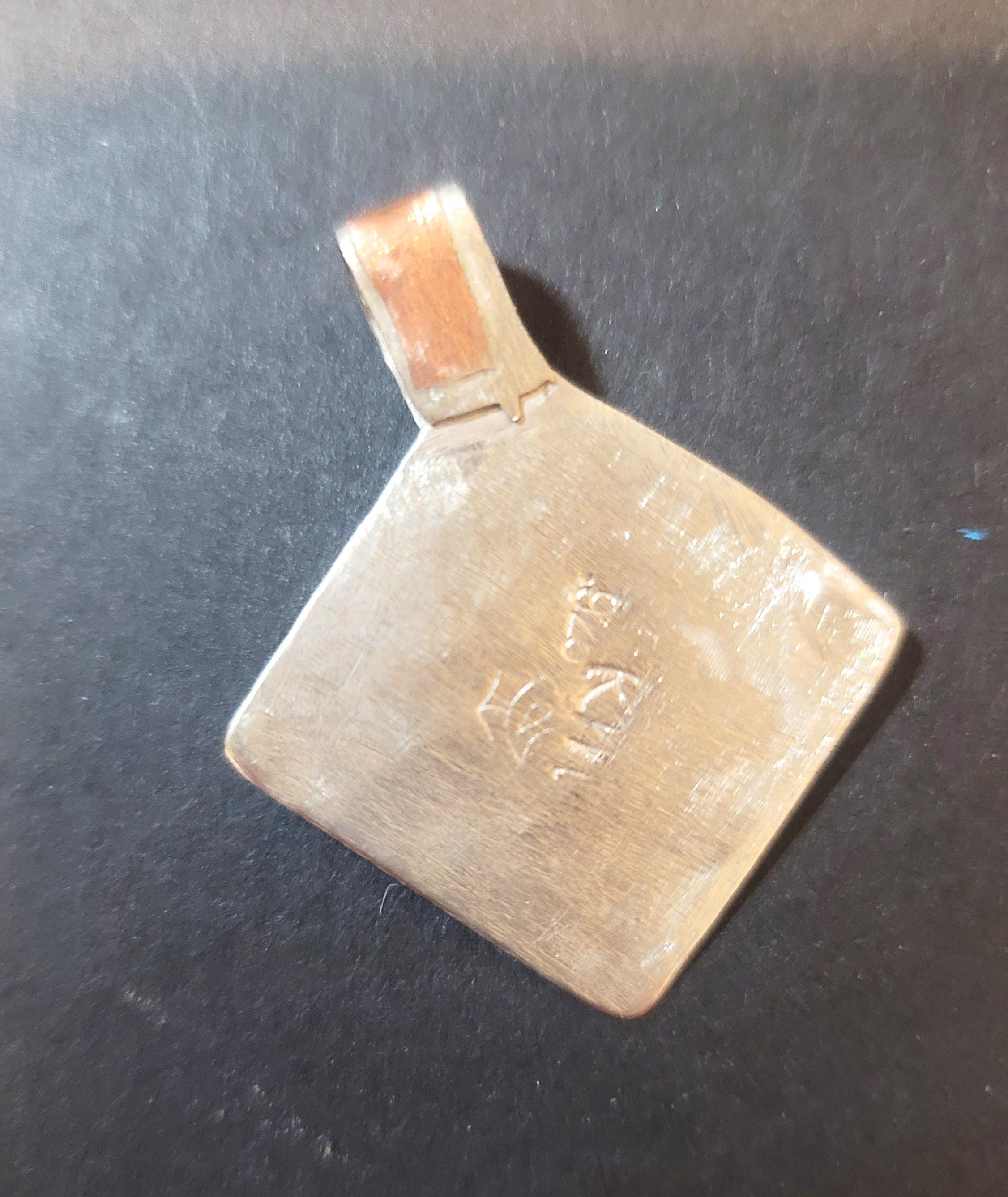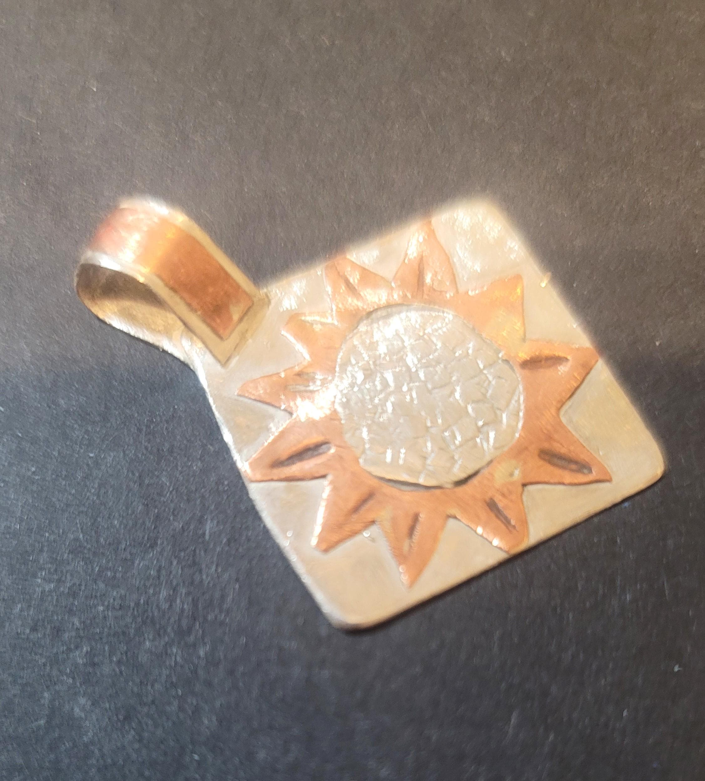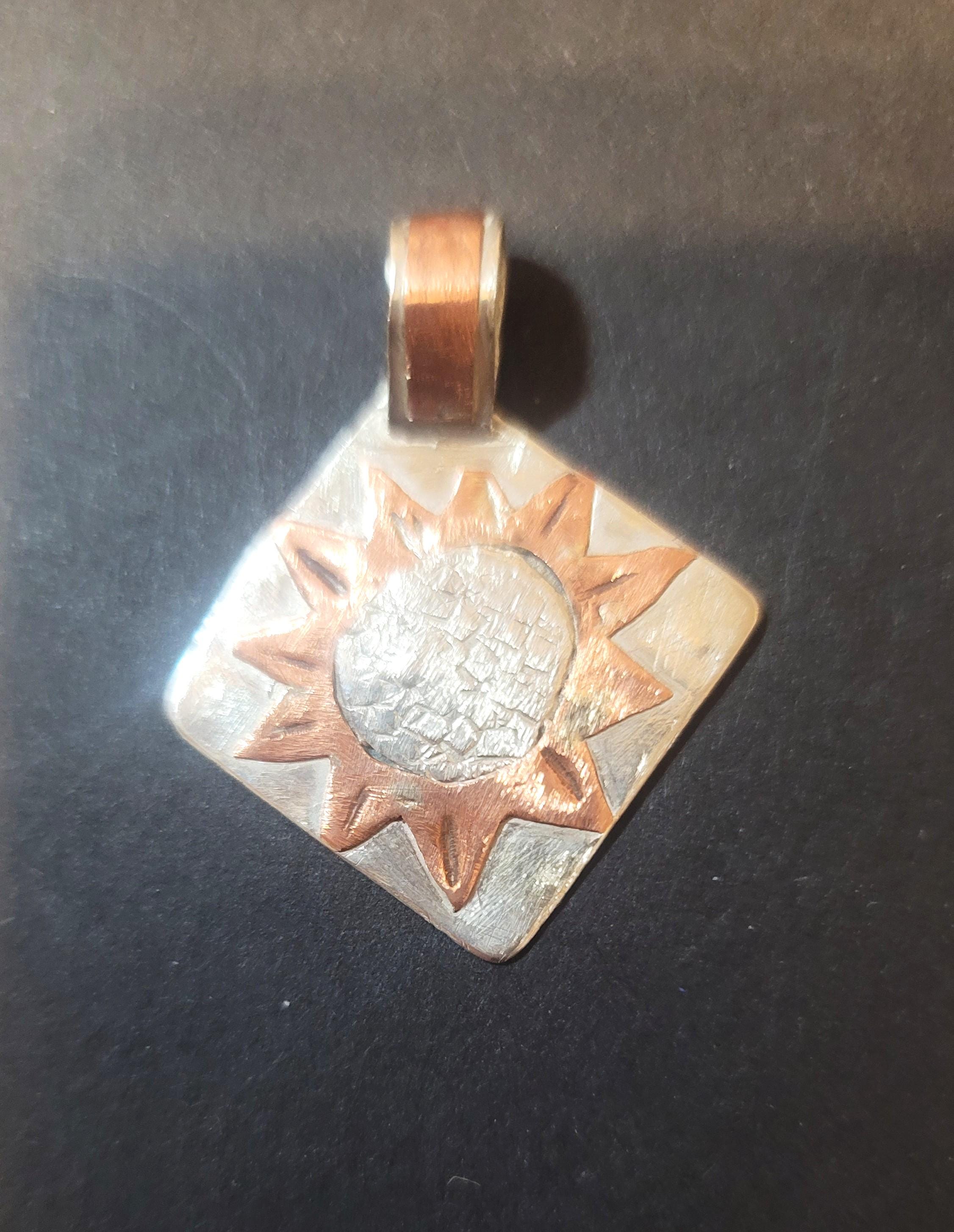 Here is a little sterling and copper pendant. You can put it on any chain you may like. it has a large bail and will fit a variety of chains.. It is a 1" square diamone with a 1/2" tall bail. It is meant to look handmade and nice because you can wear other metals with it.