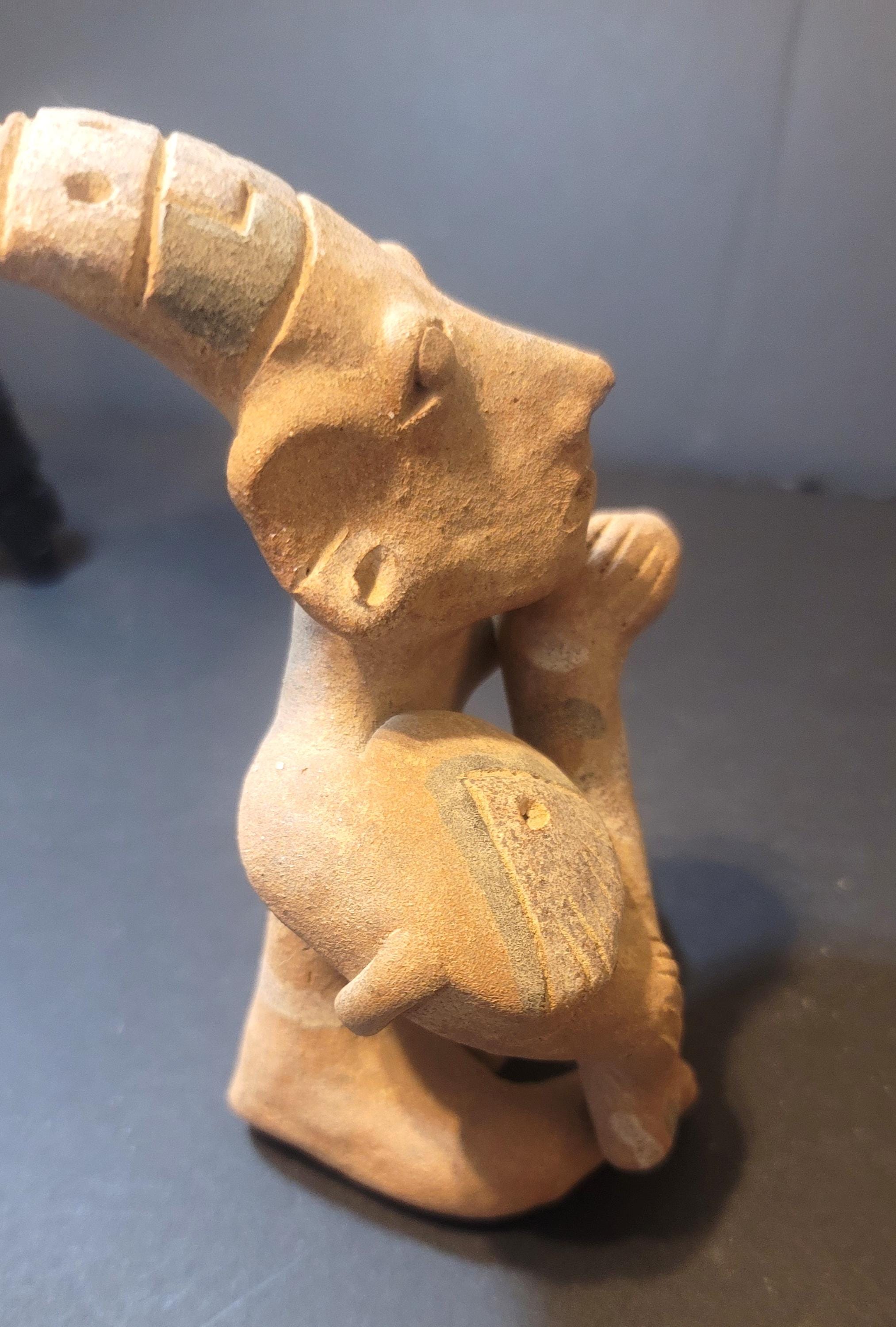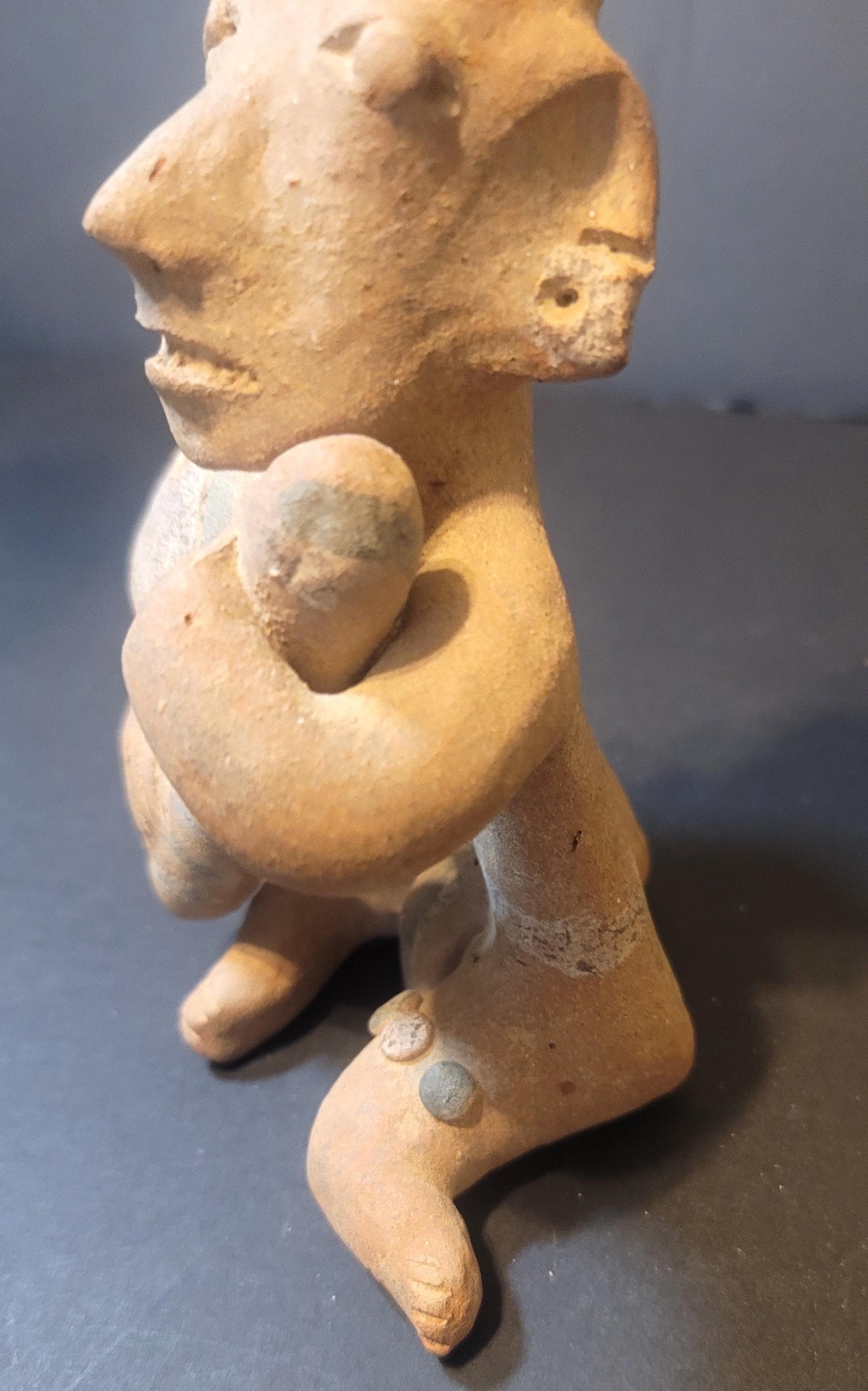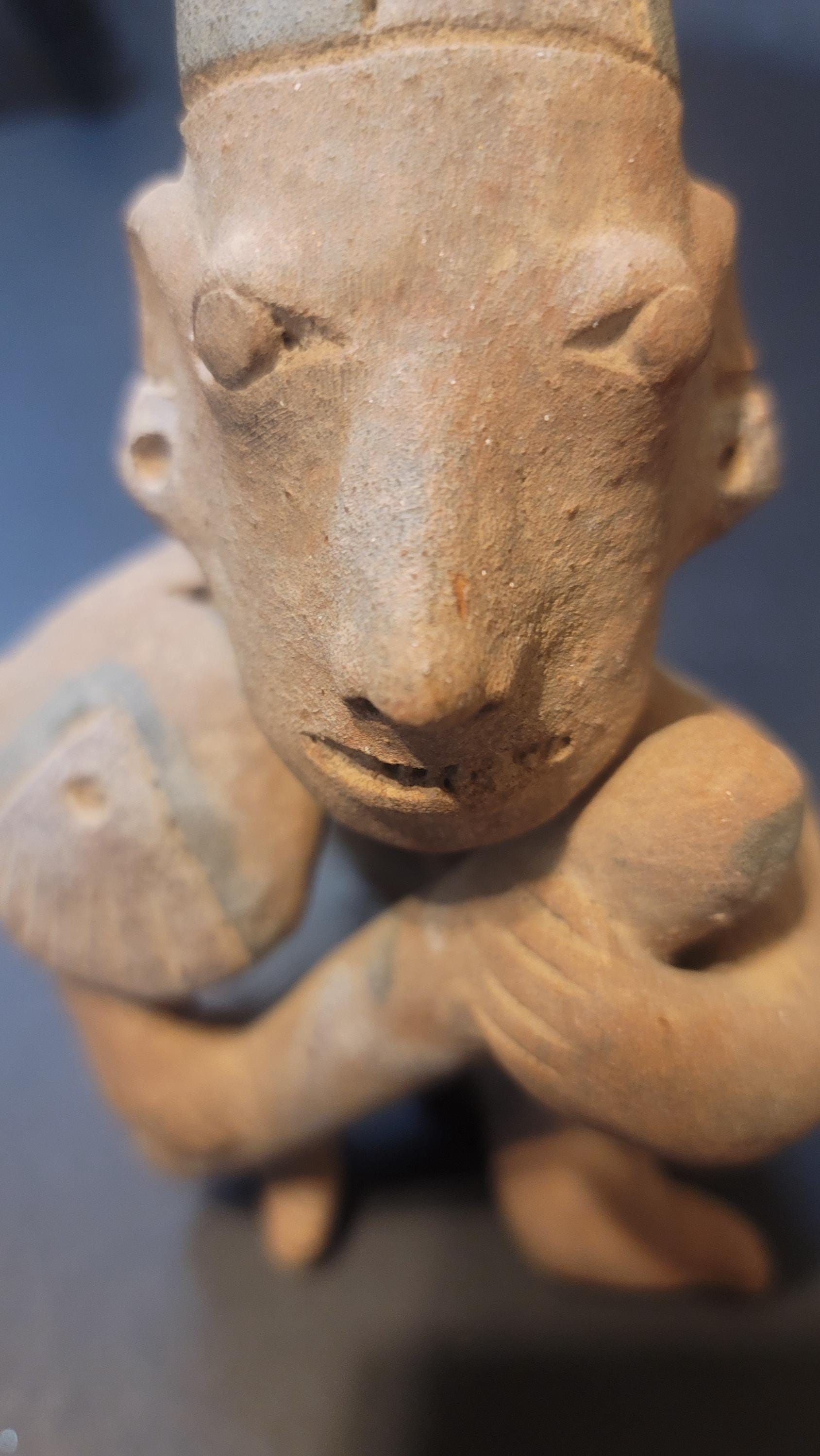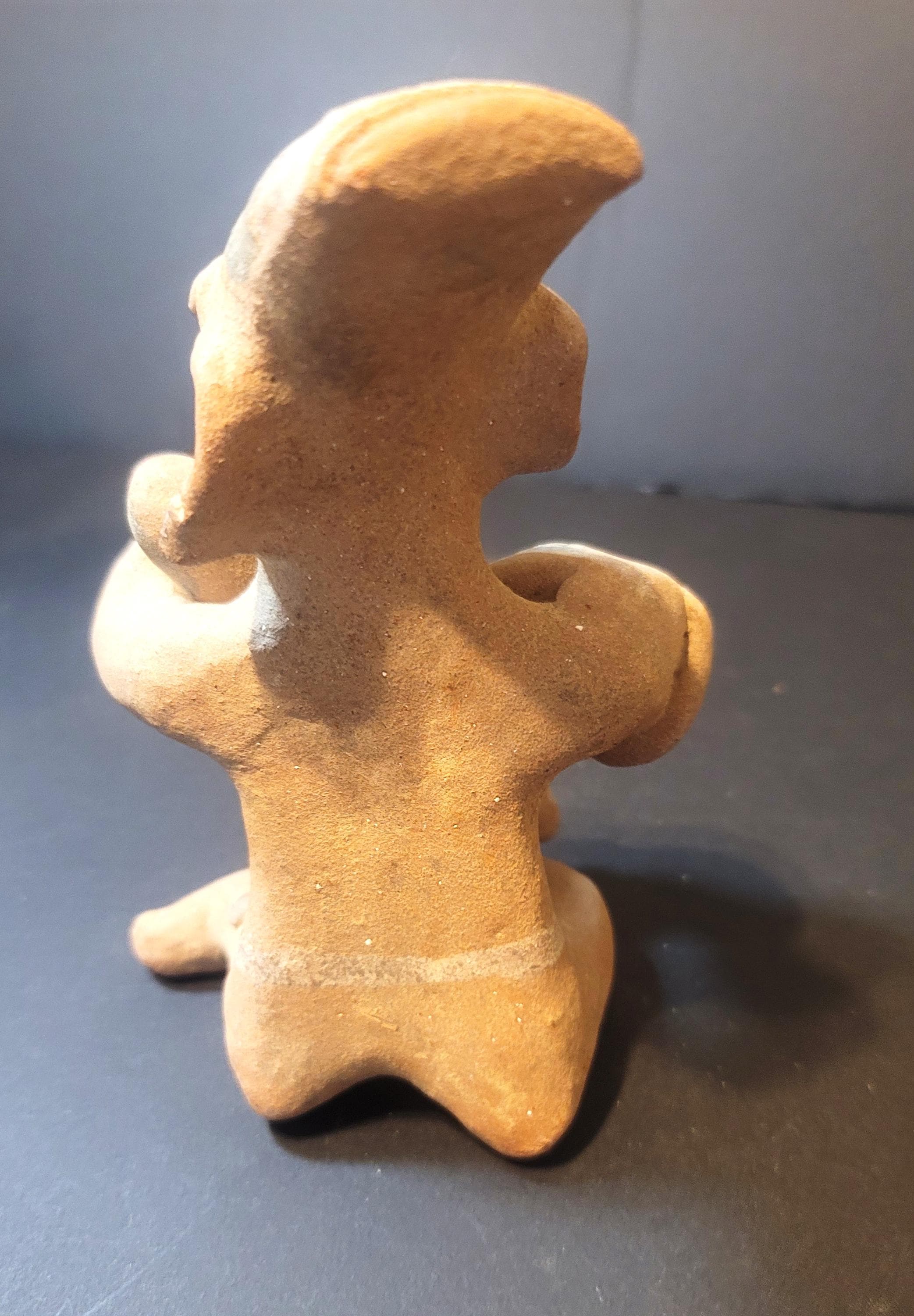 This is an unmarked piece of art that is in the style of Pre Columbian art. I do not believe it is an artifact. It is a man (Mayan) with a head dress, shield and mace sitting with decor around his leg, waist and shield. He stands 8" tall and the bottom is 4 x 3". He is terra cotta. It is quite heavy at 1.8 lbs. Free shipping in US.