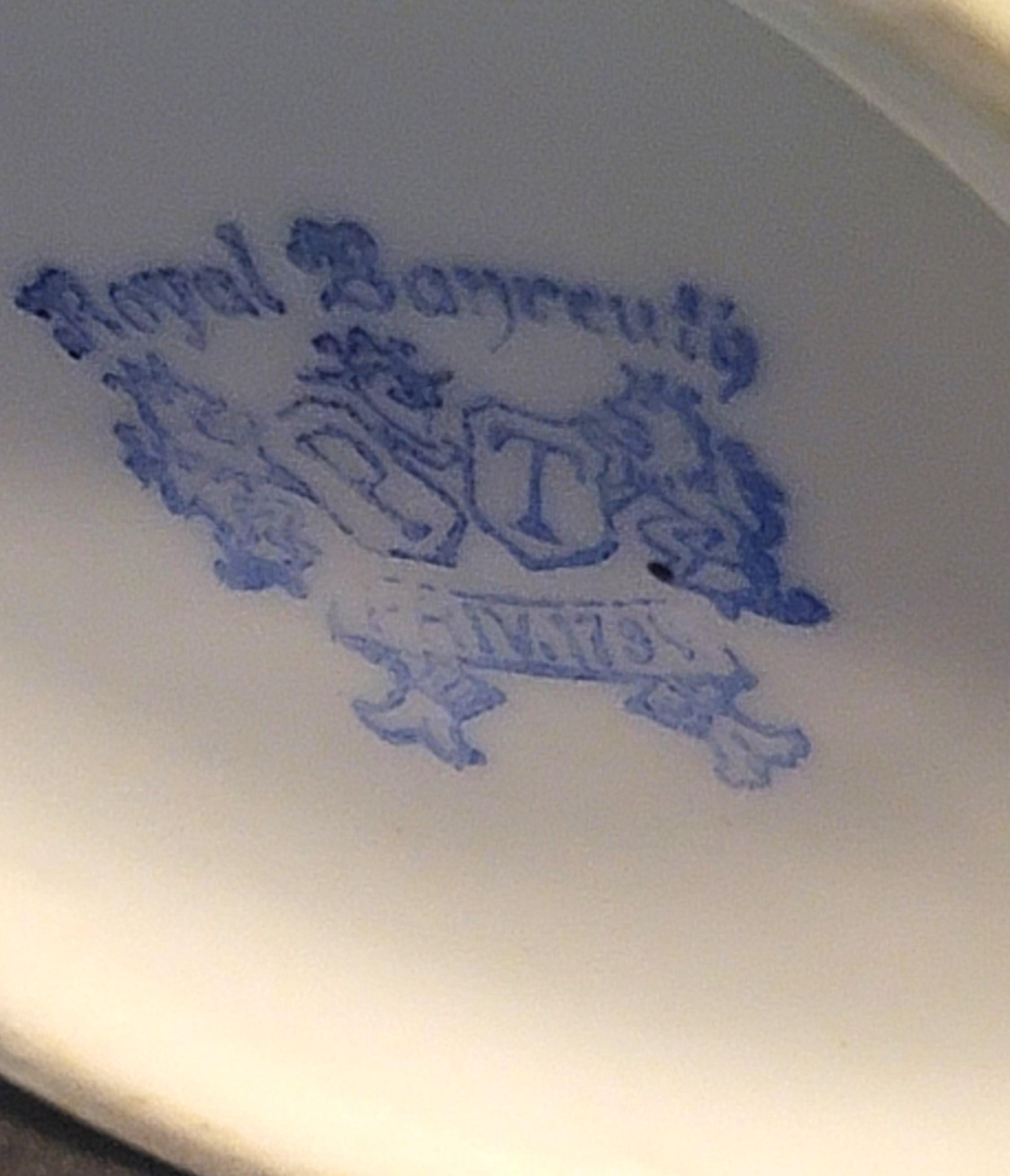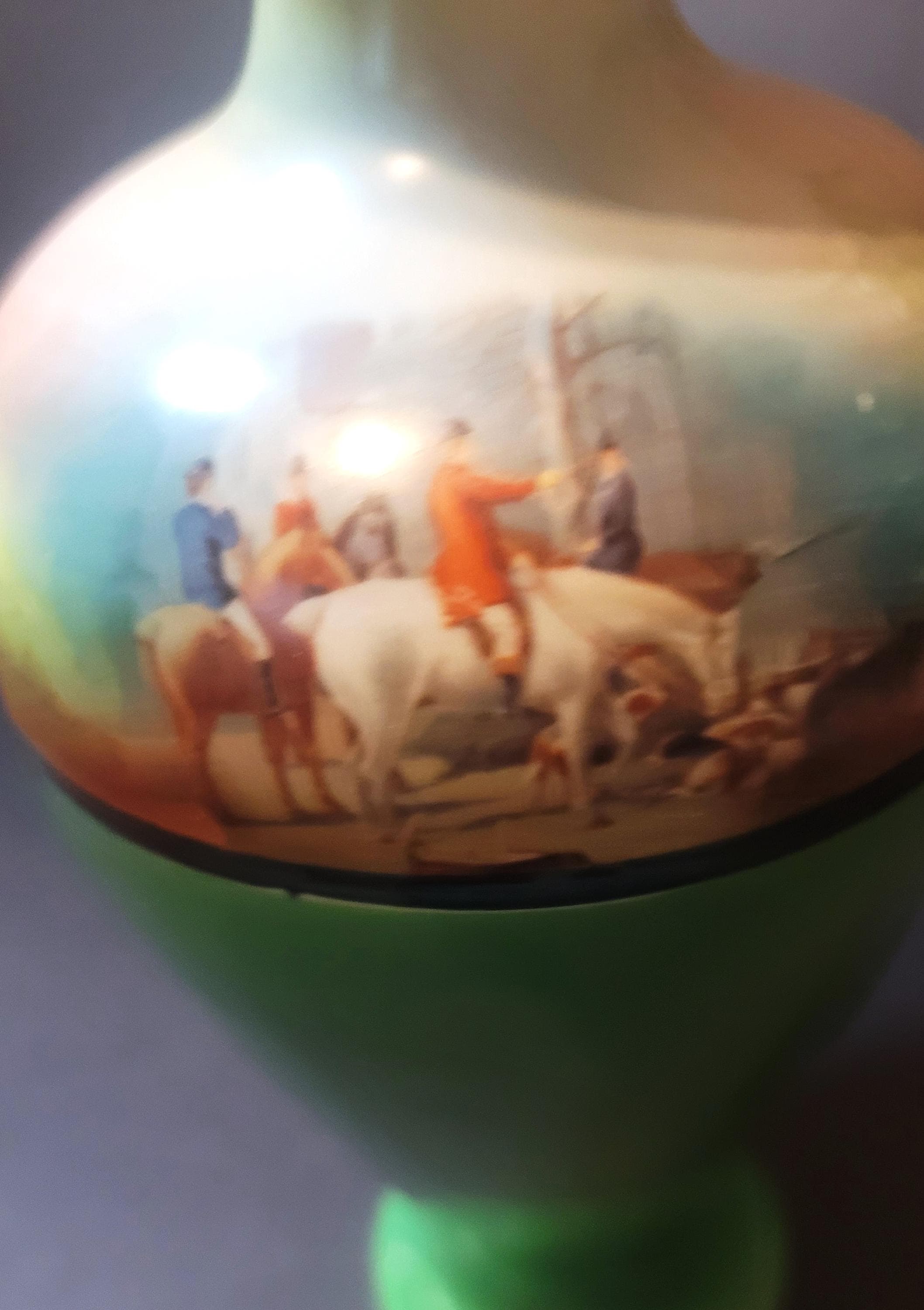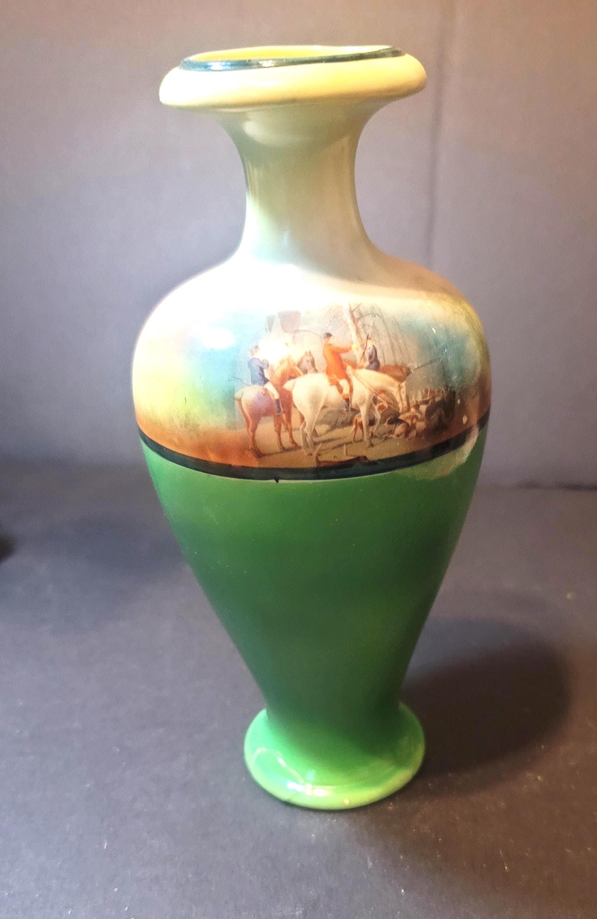 This vase featuring a hunting scene was made by Royal Bayreuth a high quality Bavarian manufacturer. The vase also has the PT crest which stands for the Tettau Porcelain Factory. It was made between the late 1800s and 1902. It stands 8.5" tall and the footed base is 2.5" in diameter. Has a very narrow top. In very good condition, no cracks, crazing or nicks. Free shipping in the US.