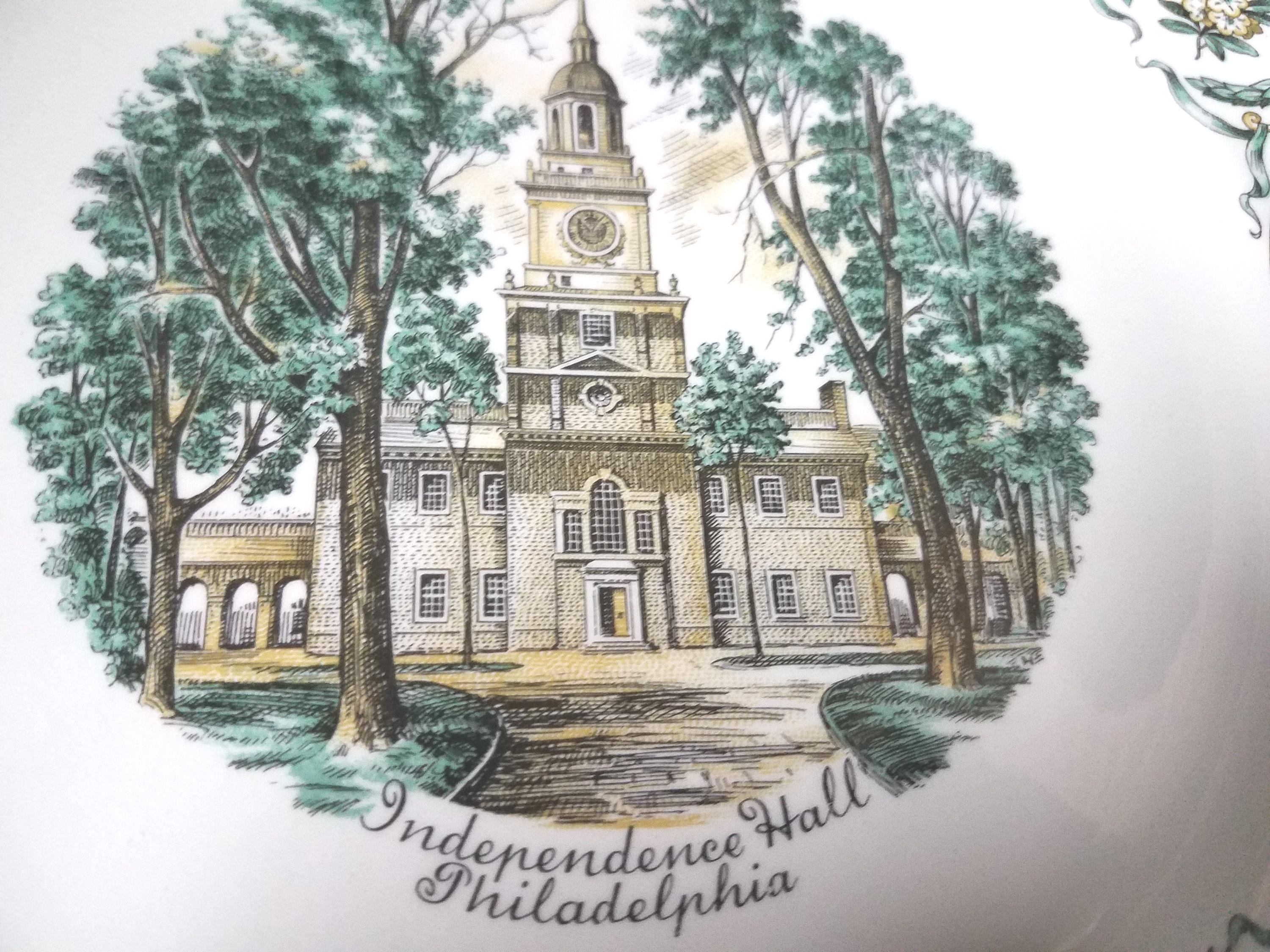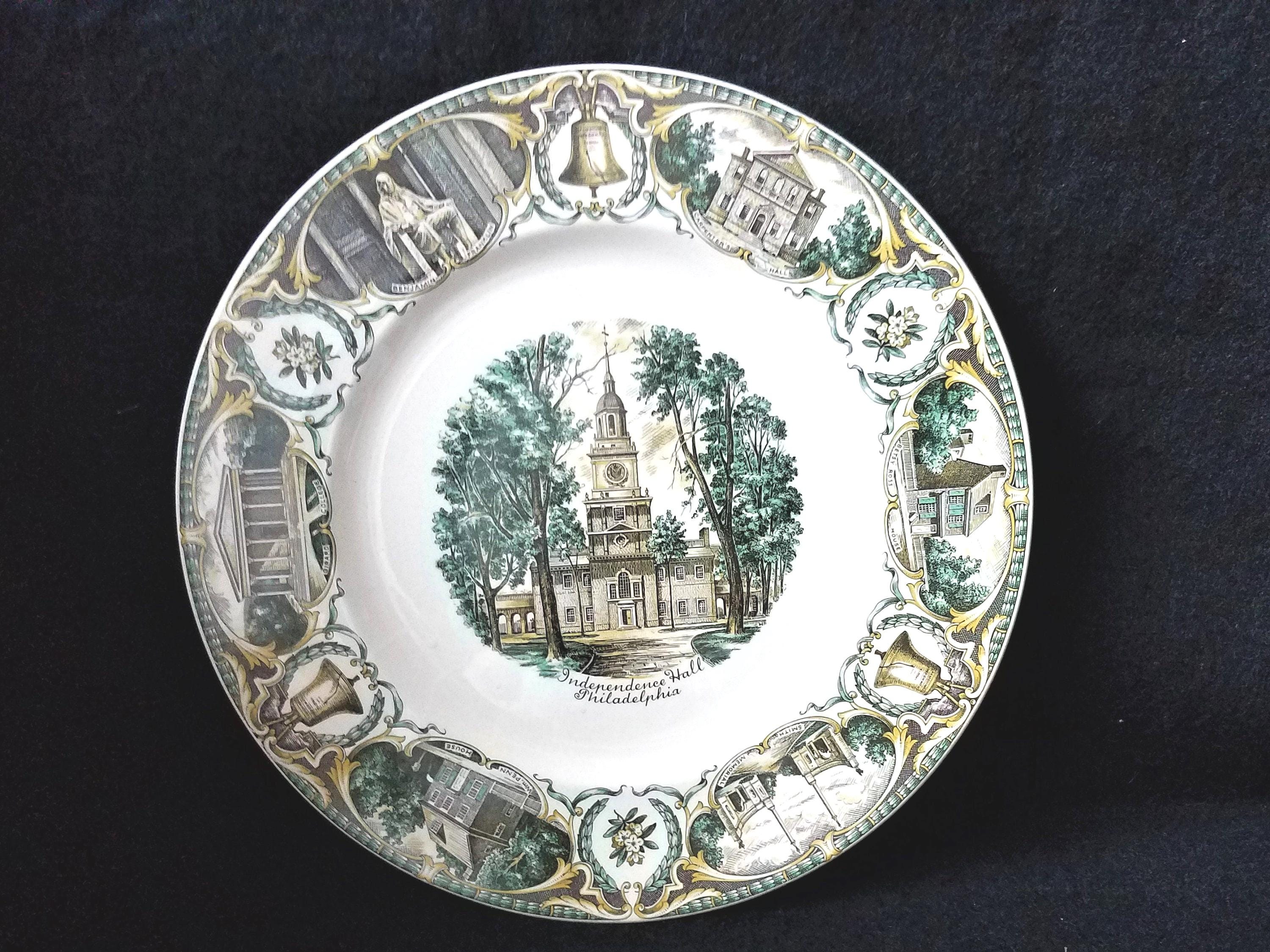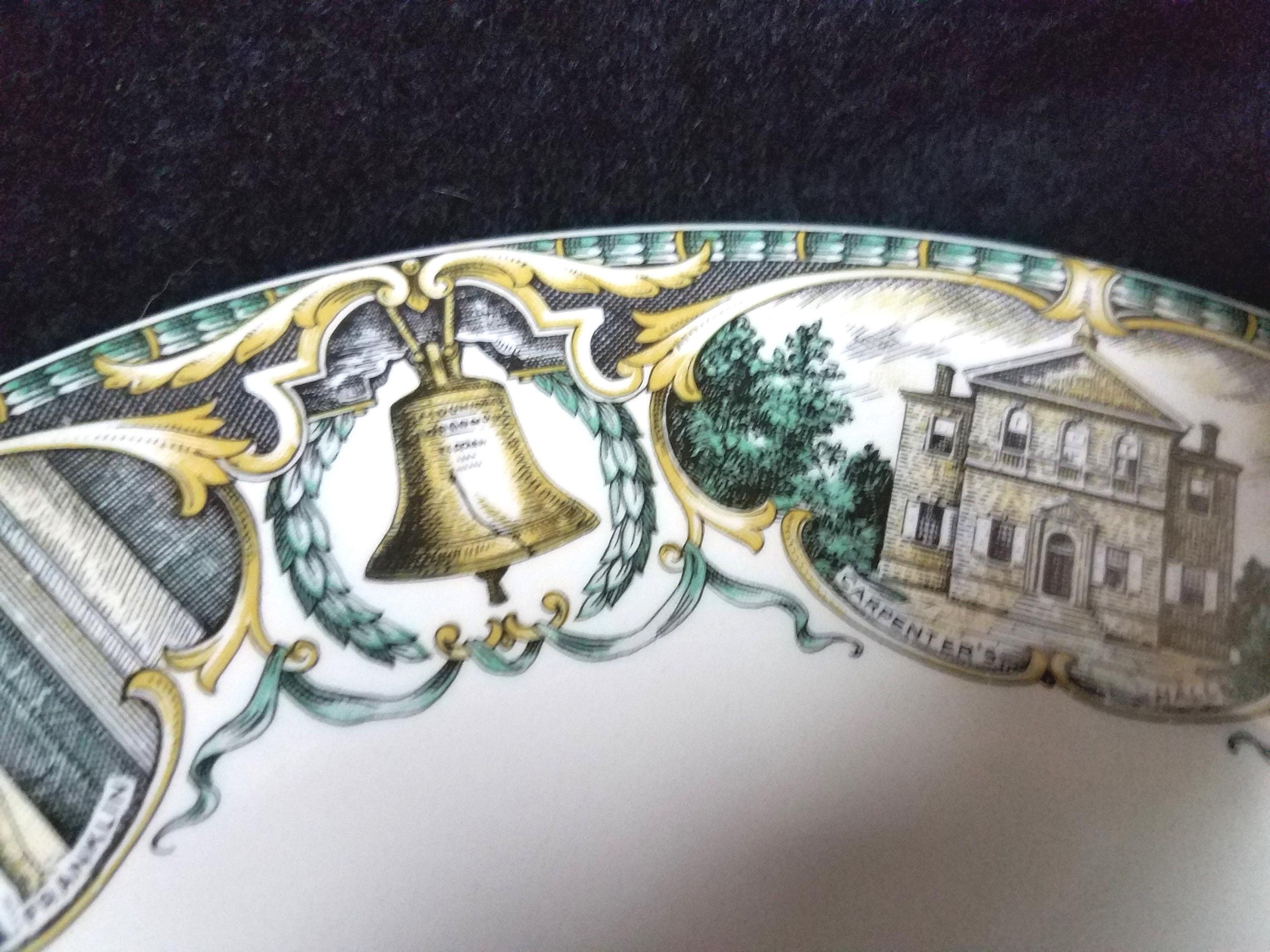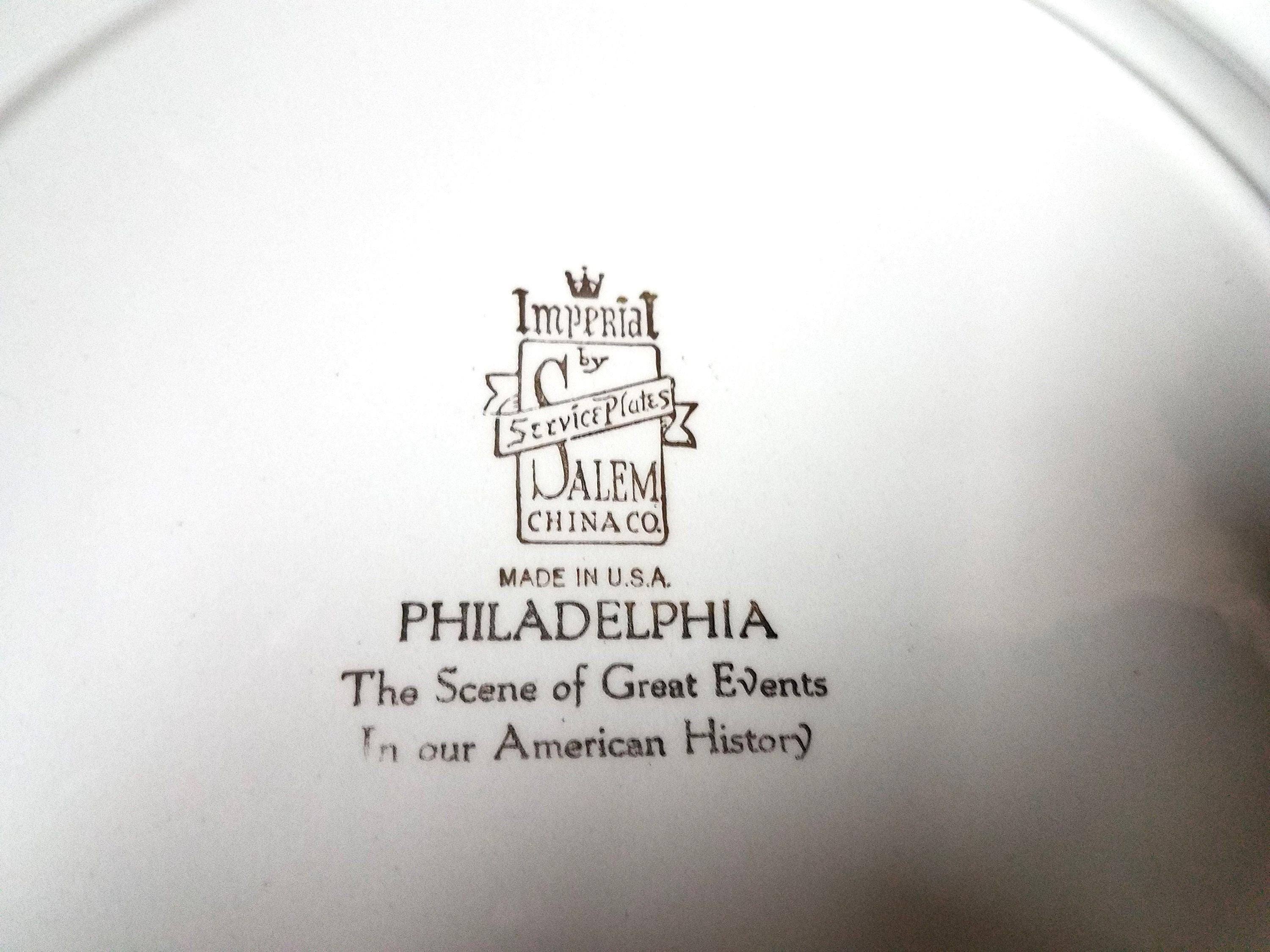 This is an Imperial Service Plate made by Salem China in Ohio which operated from 1898 to 1967. Many of the Imperial Service you see is gilded around the band but this one isn't. It shows Independence hall Philadelphia in the center and then around the band has the Liberty Bell, the Betsy Ross House and more along with costs of laurel and other decoration. It is drawn in black with lots of green and yellow and brown.