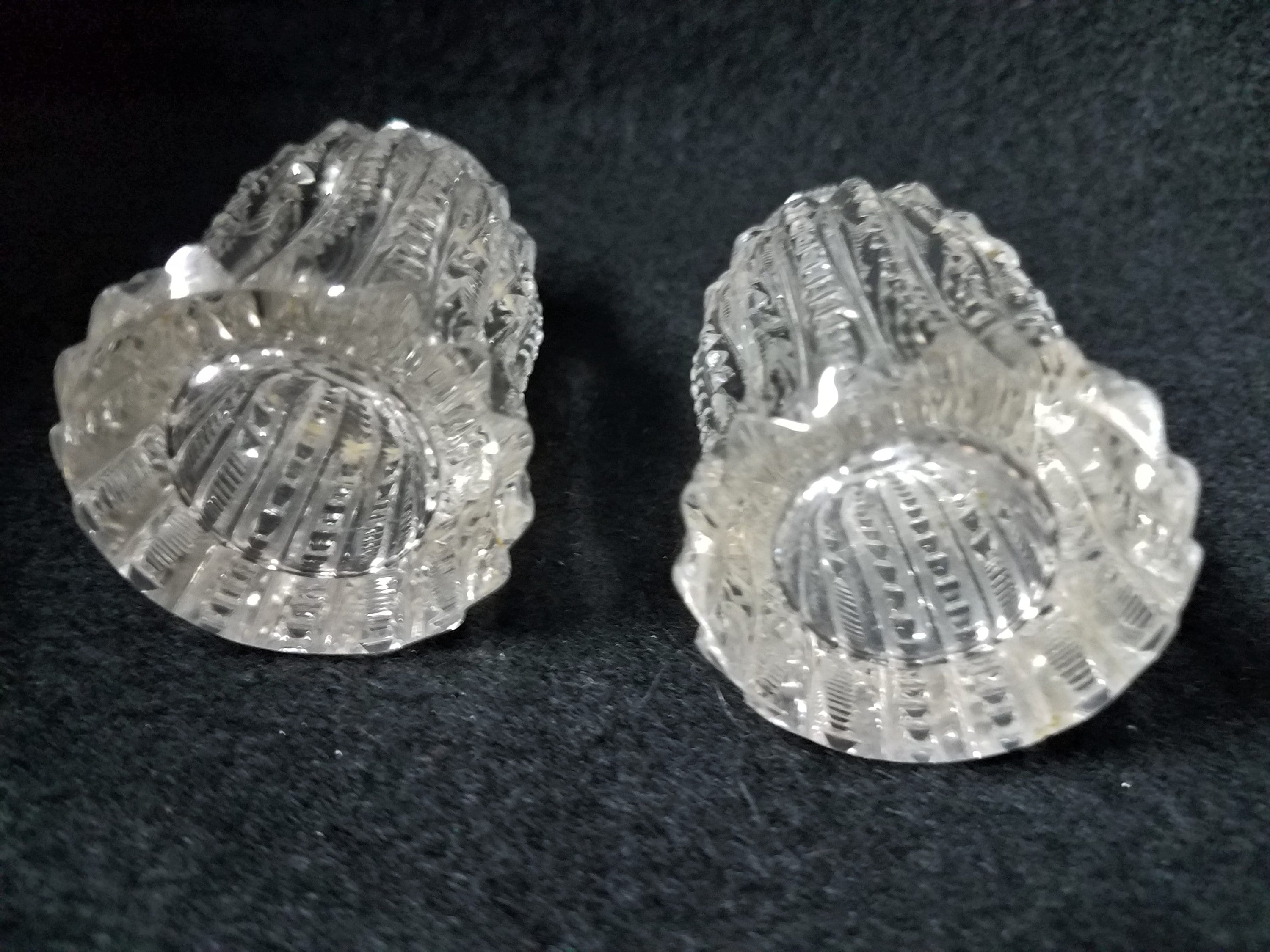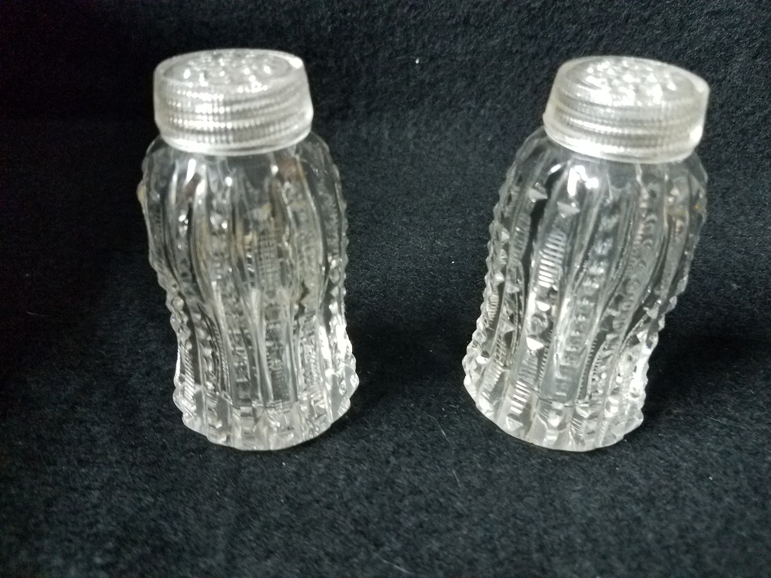 A lovely salt and pepper set, made out of glass from around the 1930s or 40s. They have a vertical cut glass design and the tops are also glass. The maker is unknown. They stand 3 5/16" tall and are 1 3/4" diameter at the bottom. The very top of the salt shaker under the cap has a chip but the cap still fits and the chip cannot be seen. Goes with any decor!