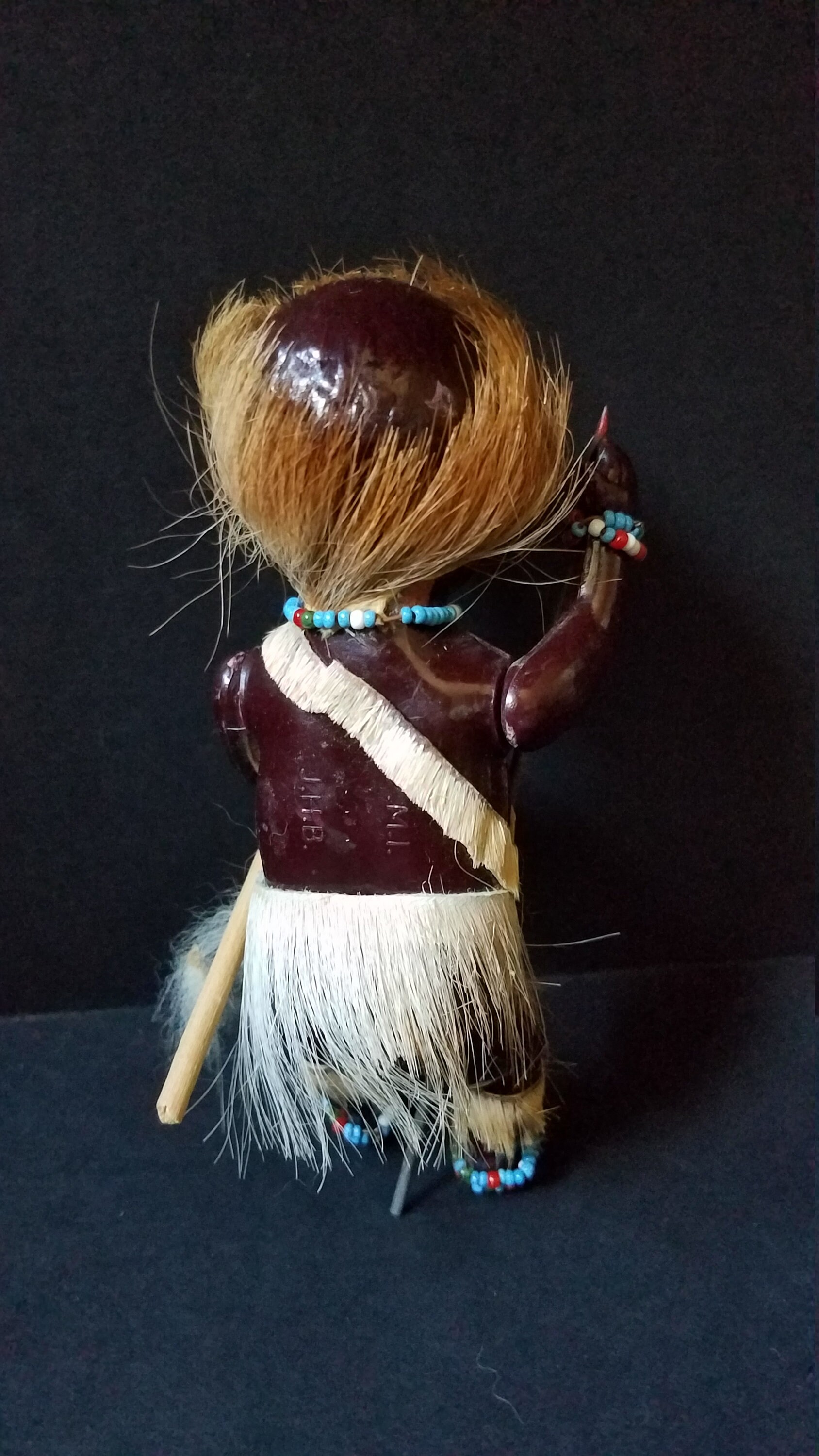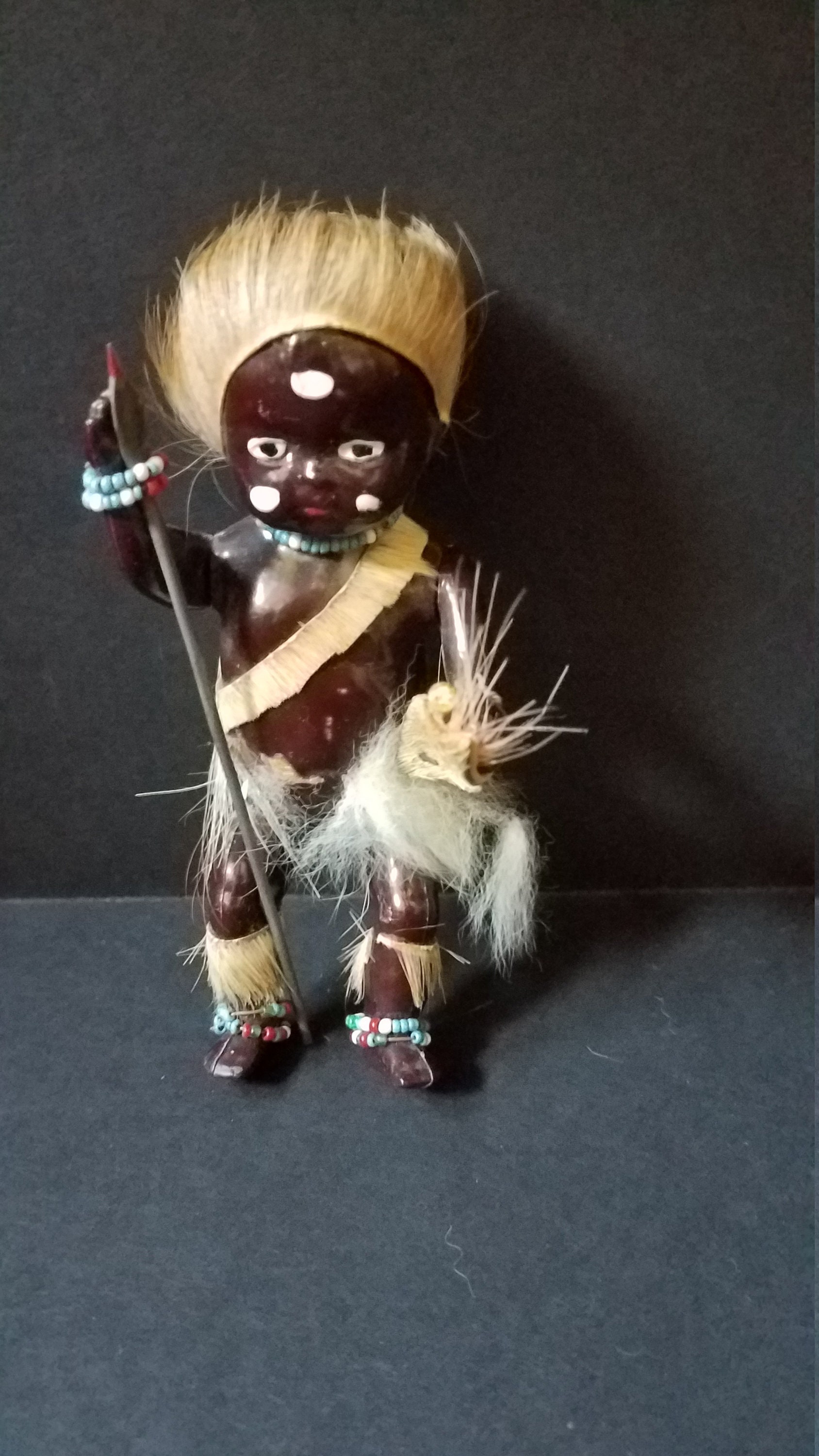 This adorable little guy was made by PMI JHB in the 50s and he is made from celluloid and has real fur on him. His arms and legs moved and he has a cute little spear and shield. He has beaded jewelry around his neck, wrists and ankles.