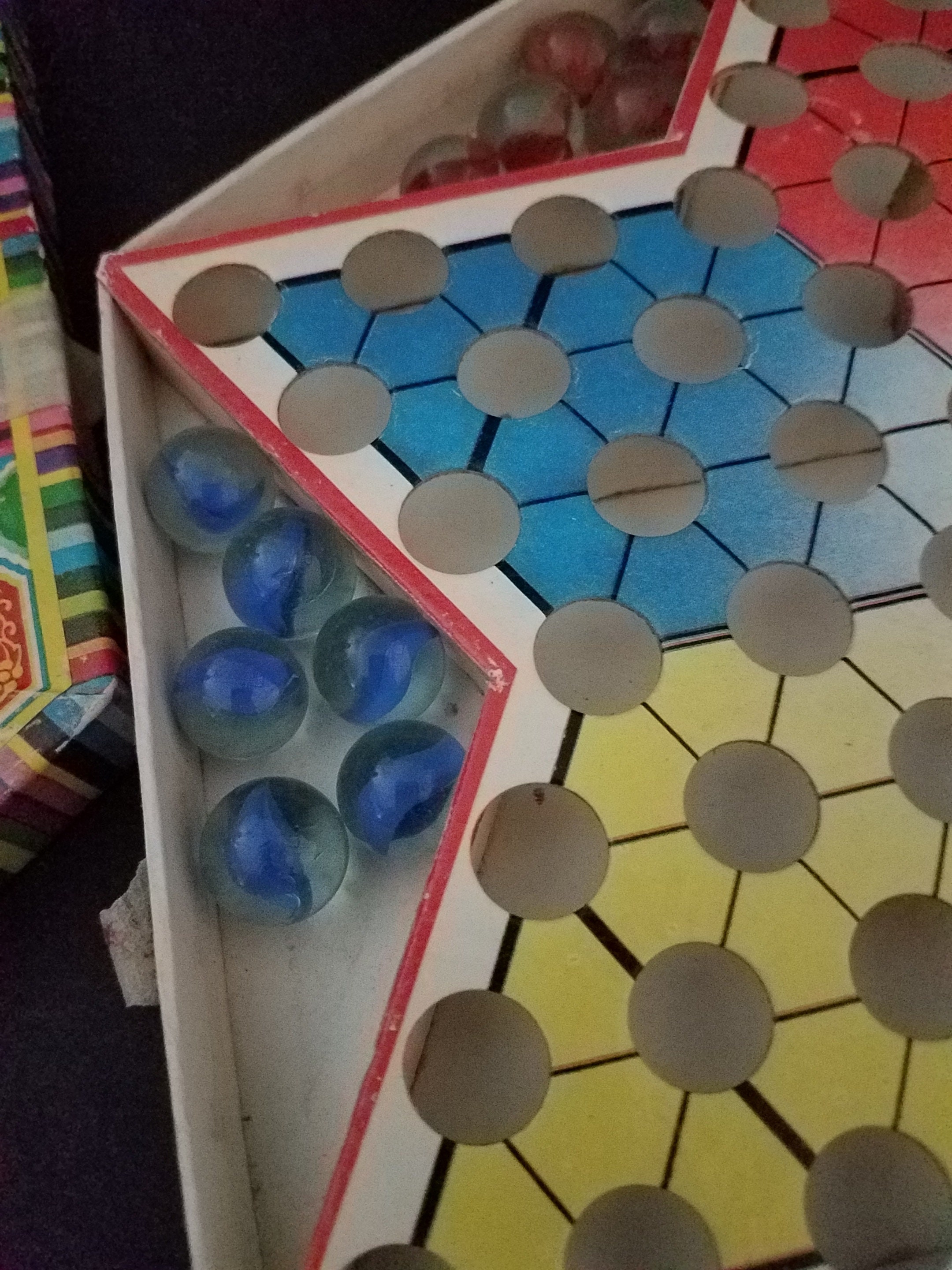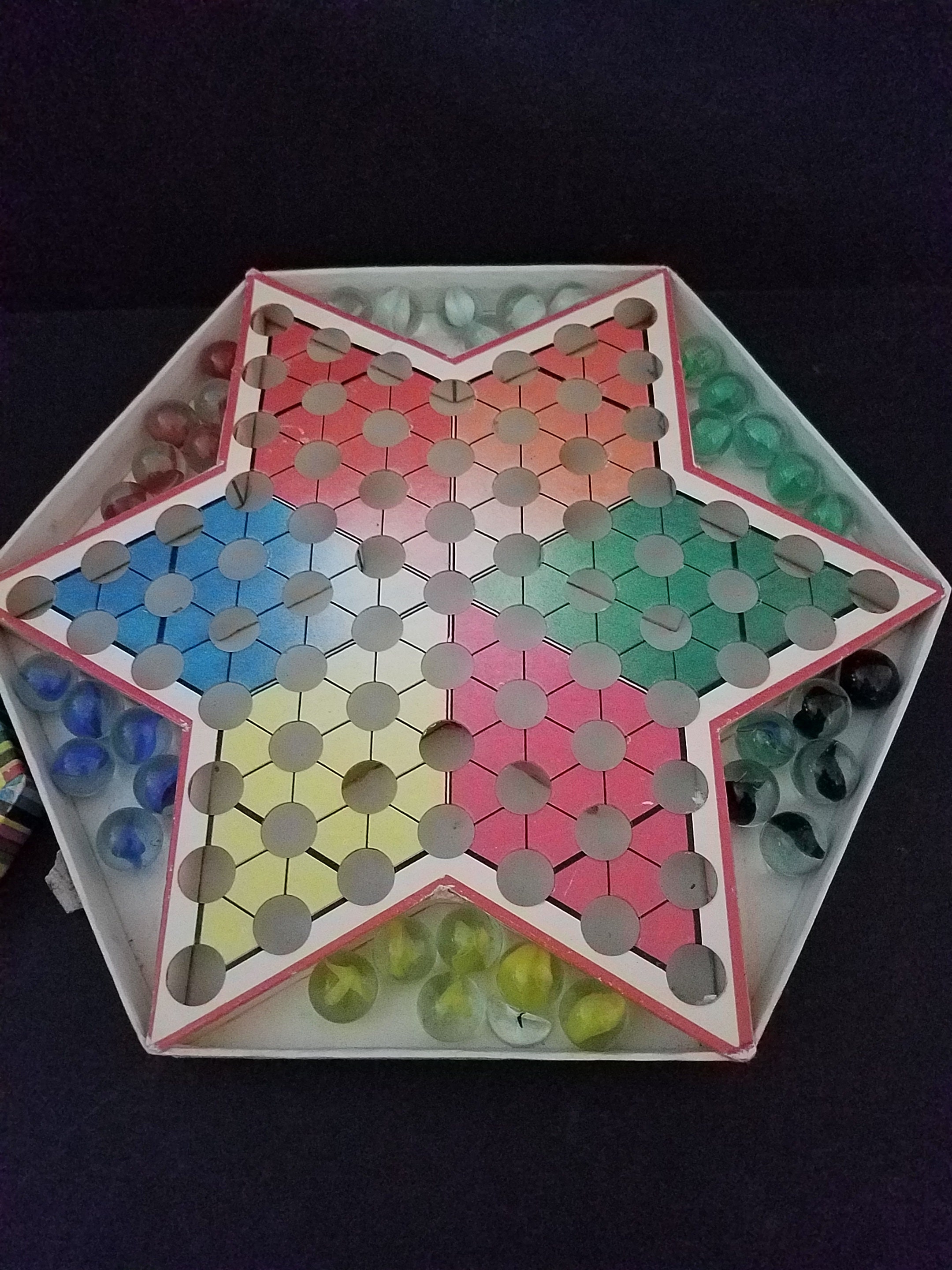 Cute little vintage Chinese Checkers game, much easier to store than those larger boards. This one is a hexagon shaped 9.5" in diameter. It has the standard 6 colors of glass marbles- These are clear cats eye in red, blue, white, yellow, green and black.