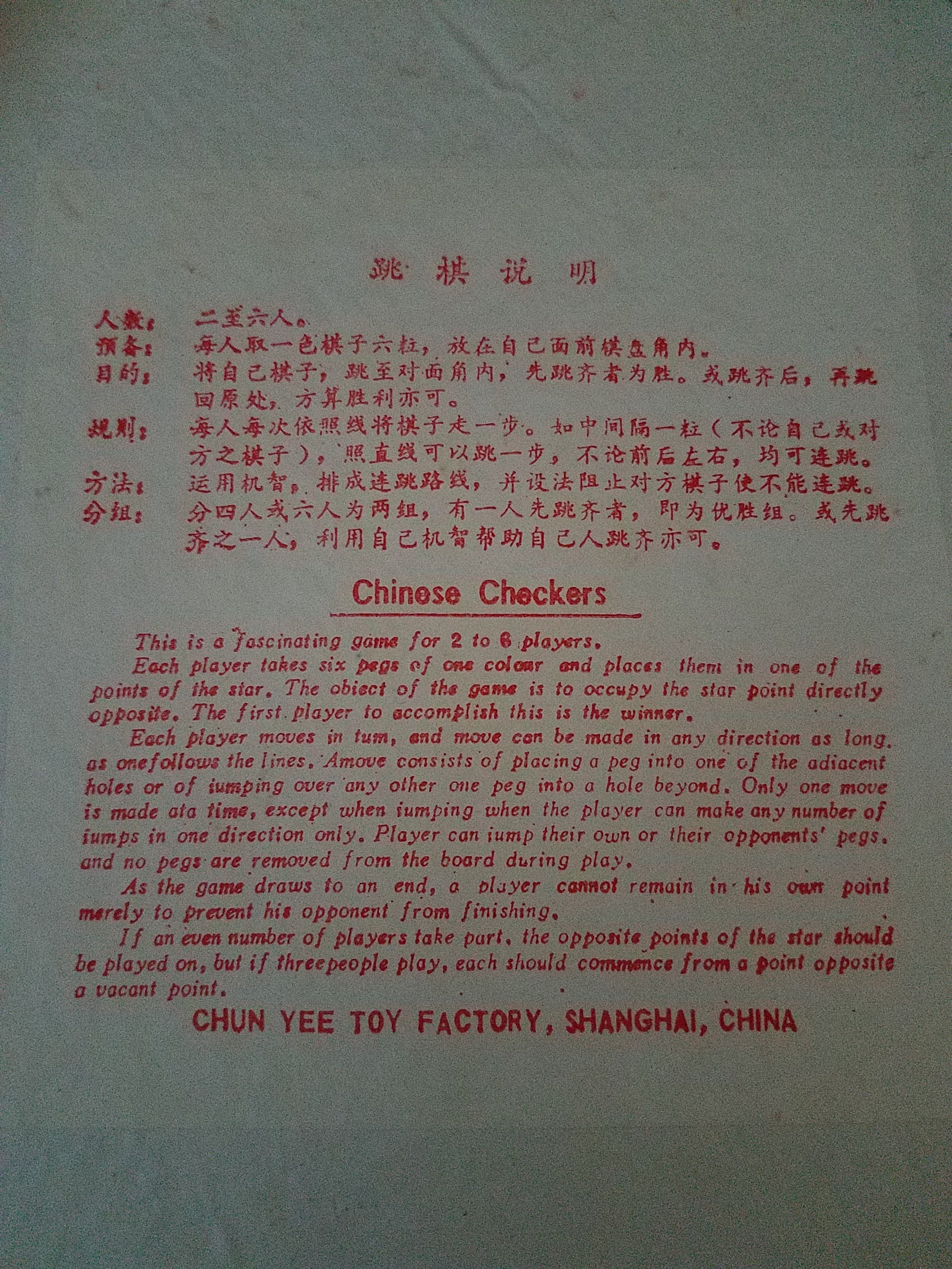 The directions are inside the top cover, in Chinese and English. It was made by Chun Yee Toy Factory in Shanghai China.