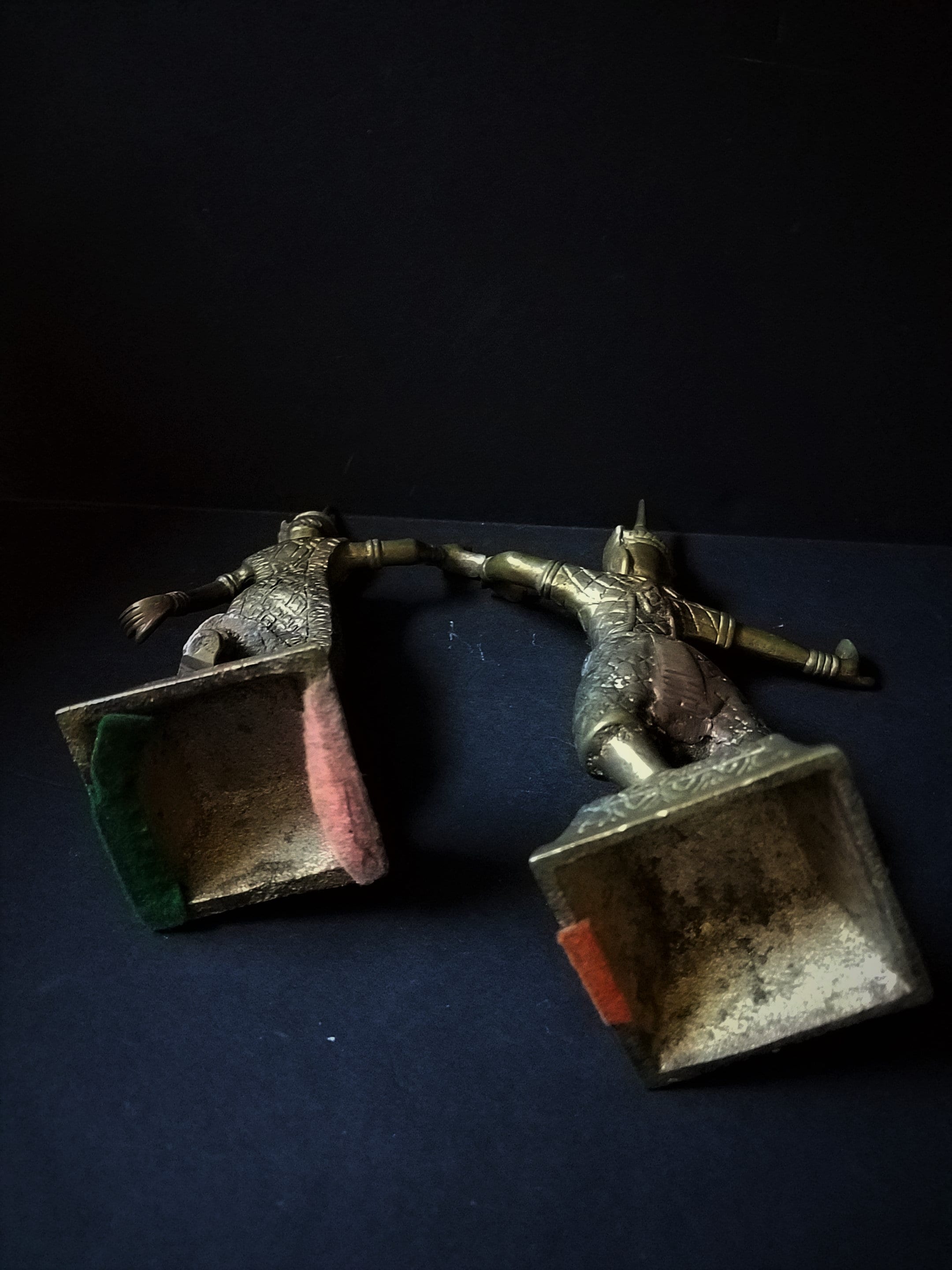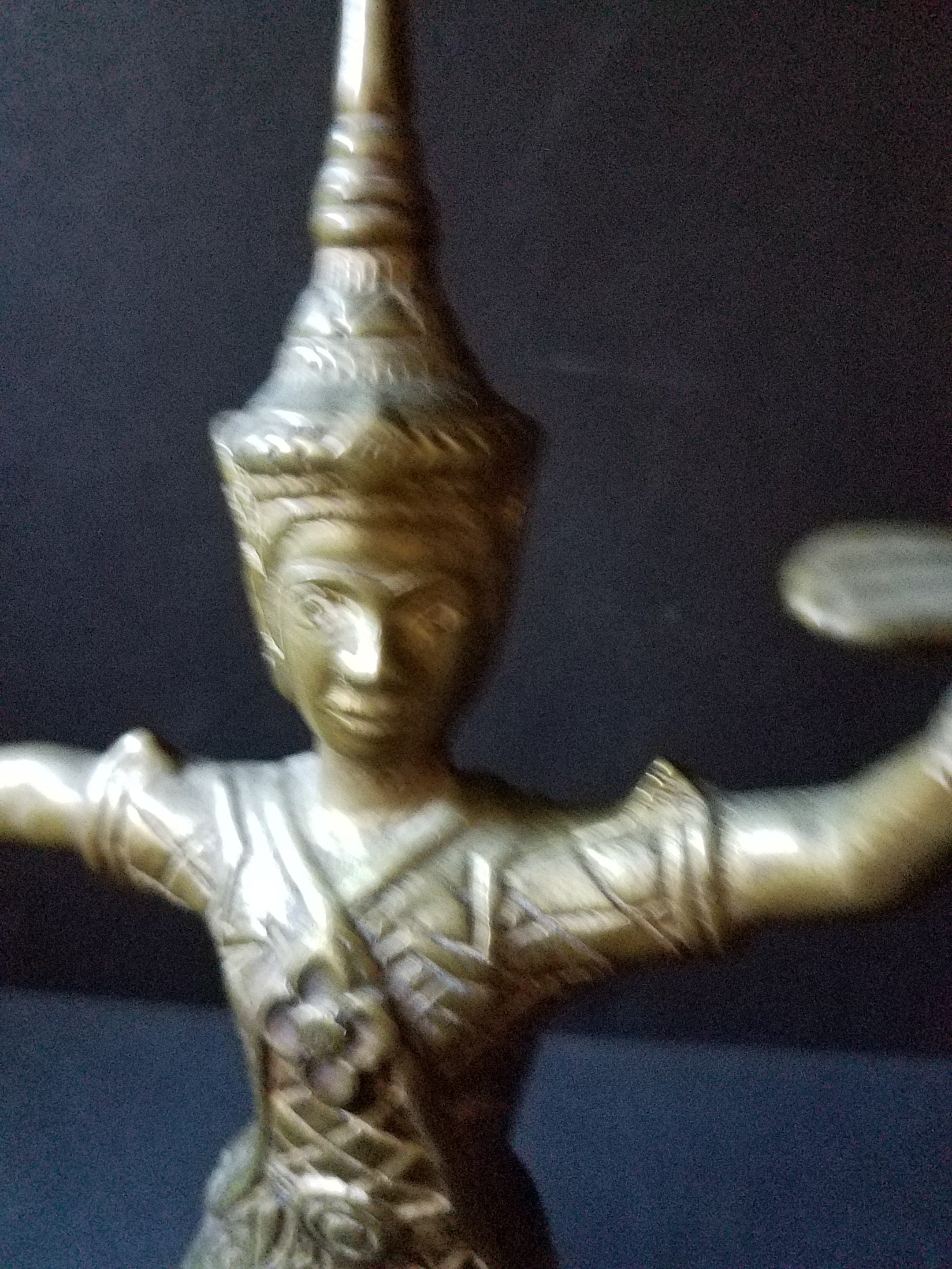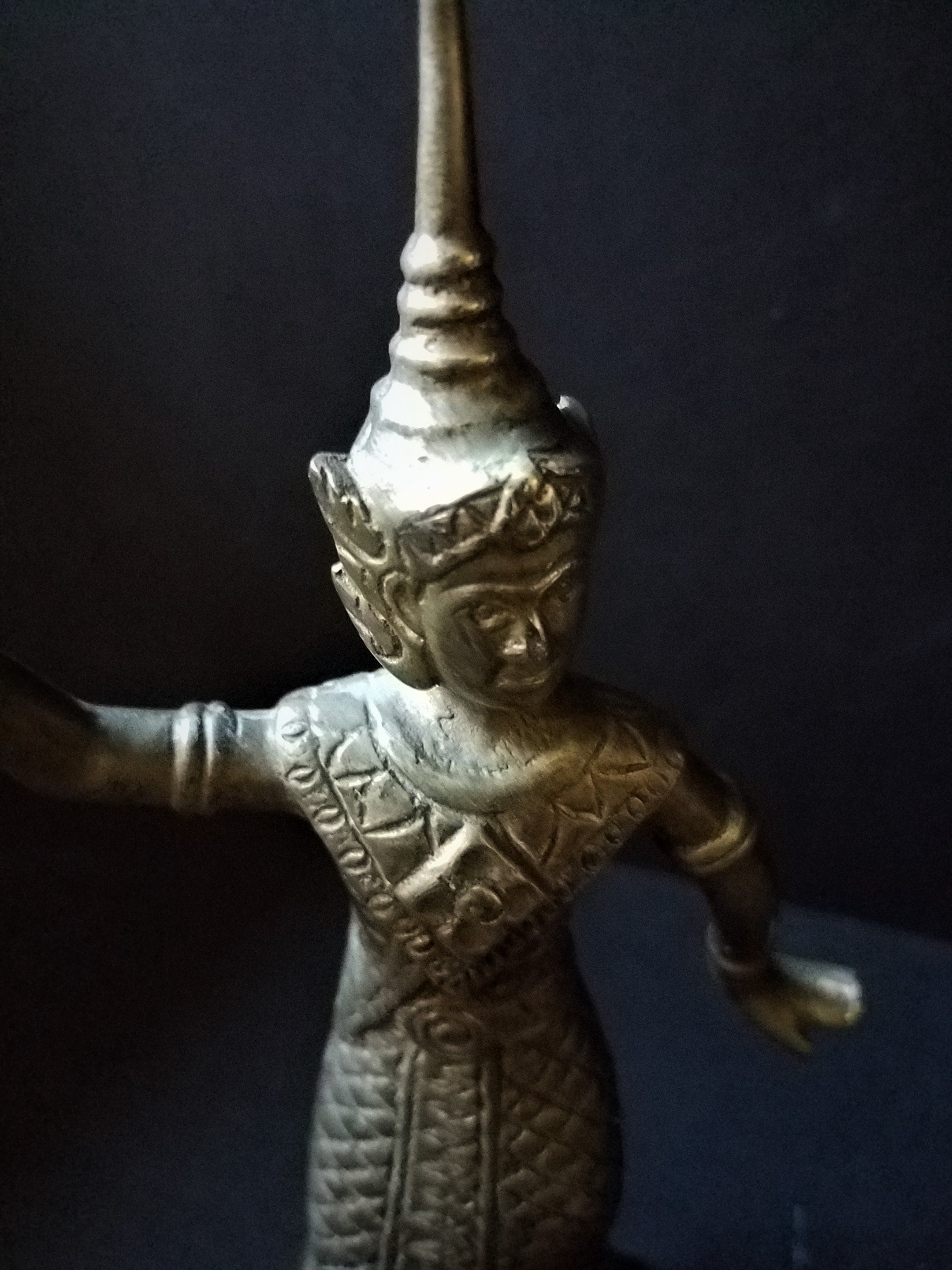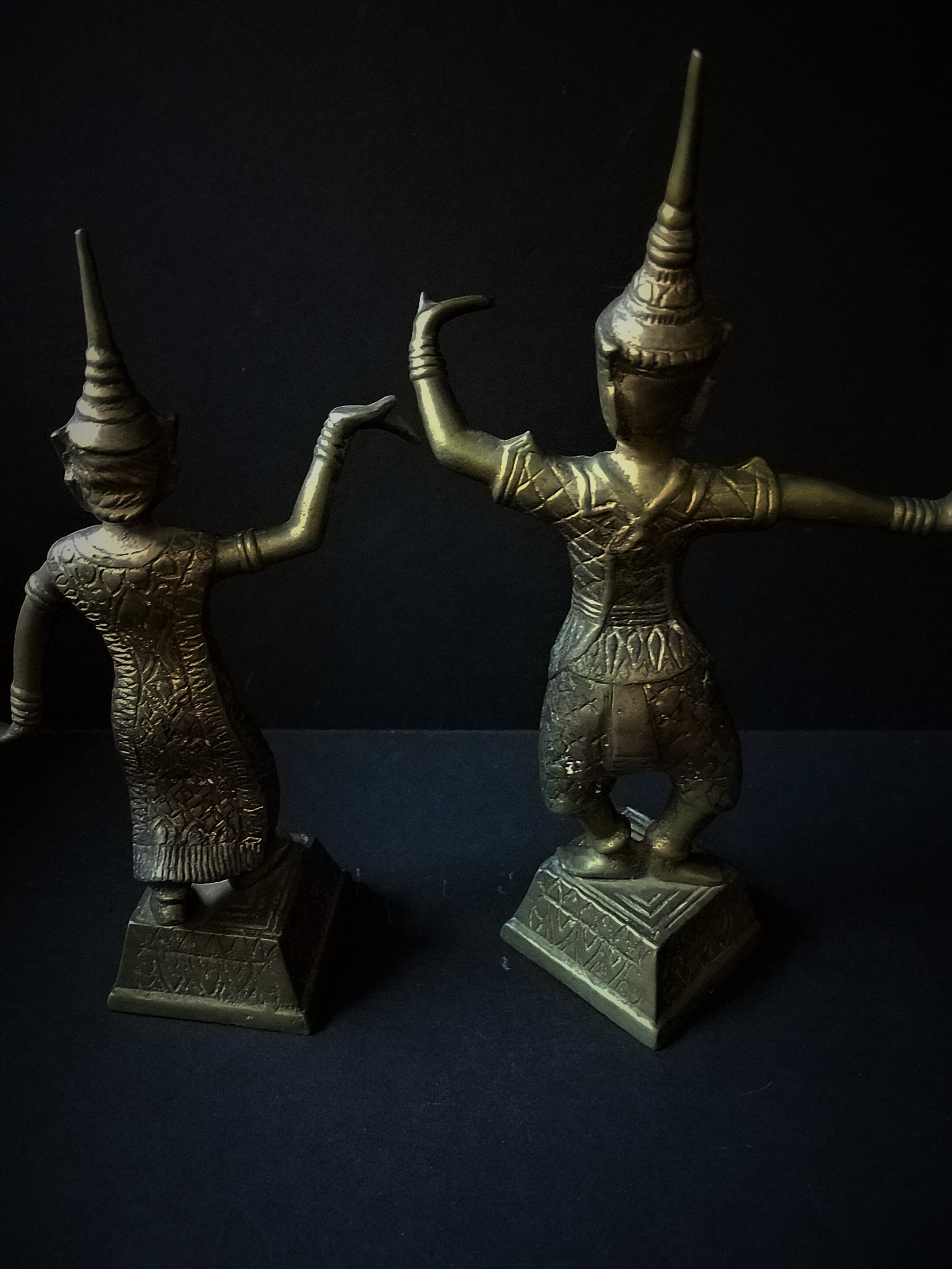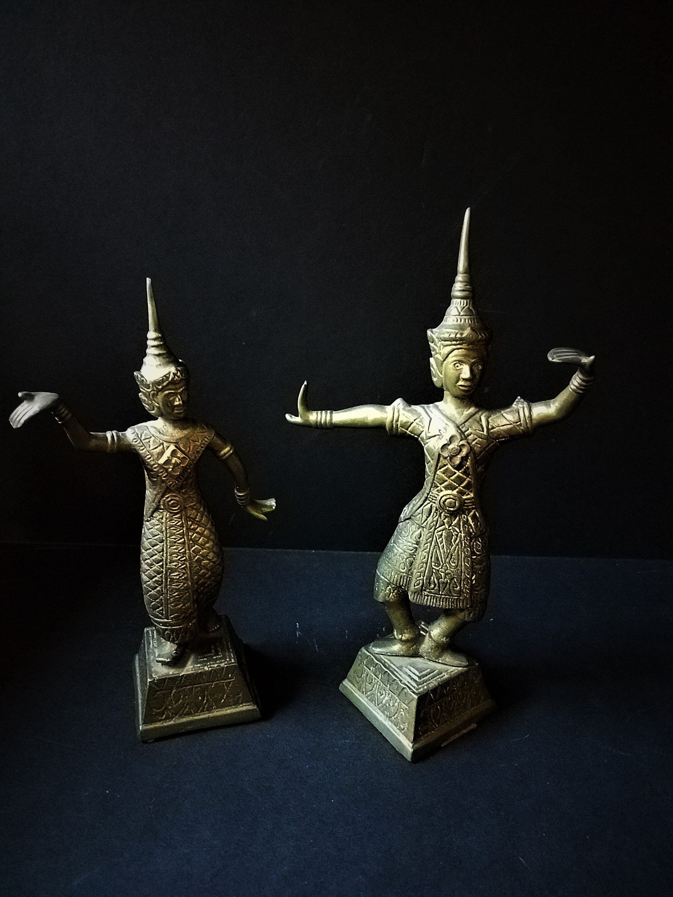 This is a really nice pair of brass figurines of Thai (or Siamese) dancers. They stand 8.5 and 9.5 inches tall and the bases are 2.25" square. They have some felt on the bottom to protect tables. They are wearing very detailed outfits. There are no makers mark on them but I believe they are 1970s or 80s. They are in excellent shape and would be really, really beautiful with some polishing. I started to polish one and it shines! Makes a great gift and I will polish them up before I ship!