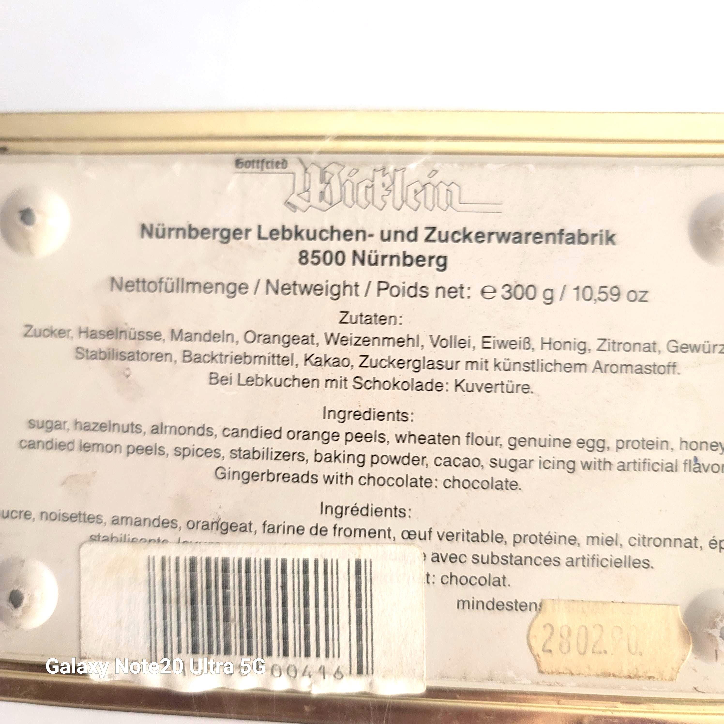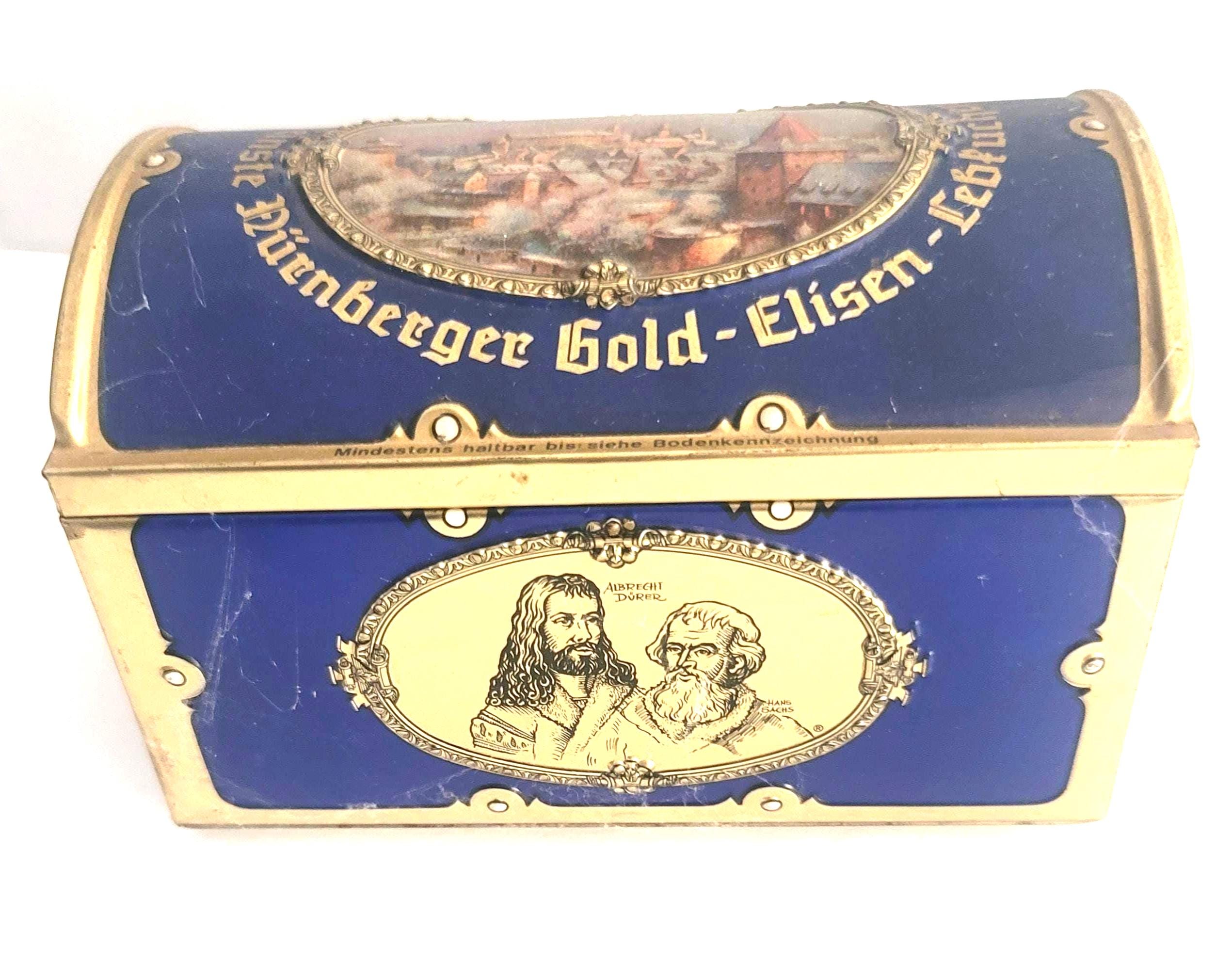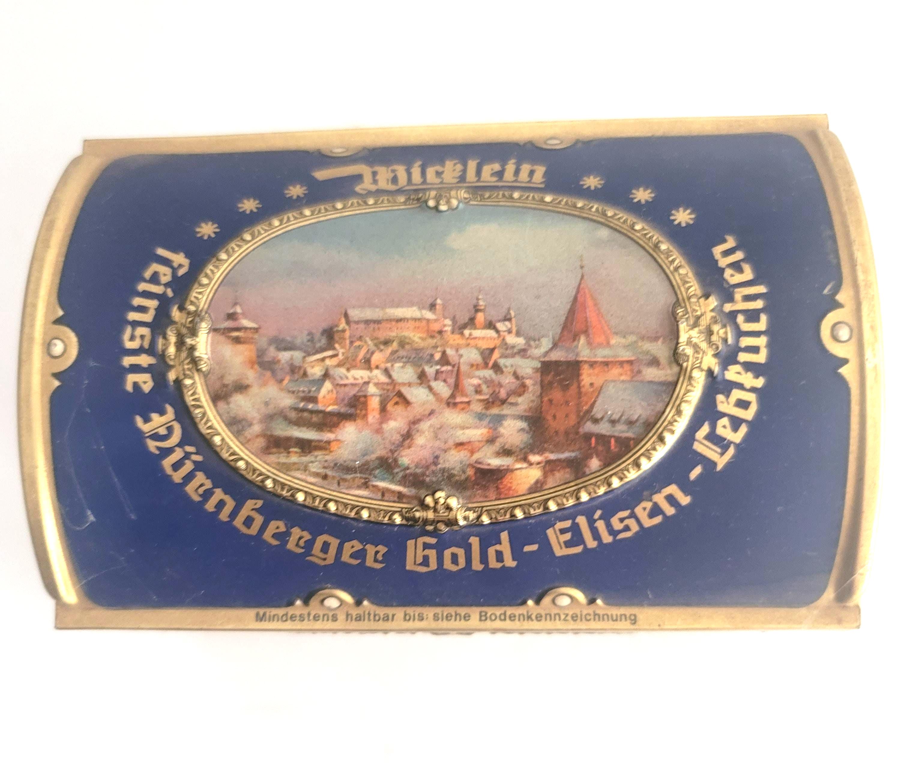 This is just a beautiful German royal blue and gold tin, put out by the confectionary company Gottfried Wicklein circa 1985. This factory has been in business since 1615! The company was sold though in the early nineties and now has another name. The picture on the top is surrounded by raised gold design.