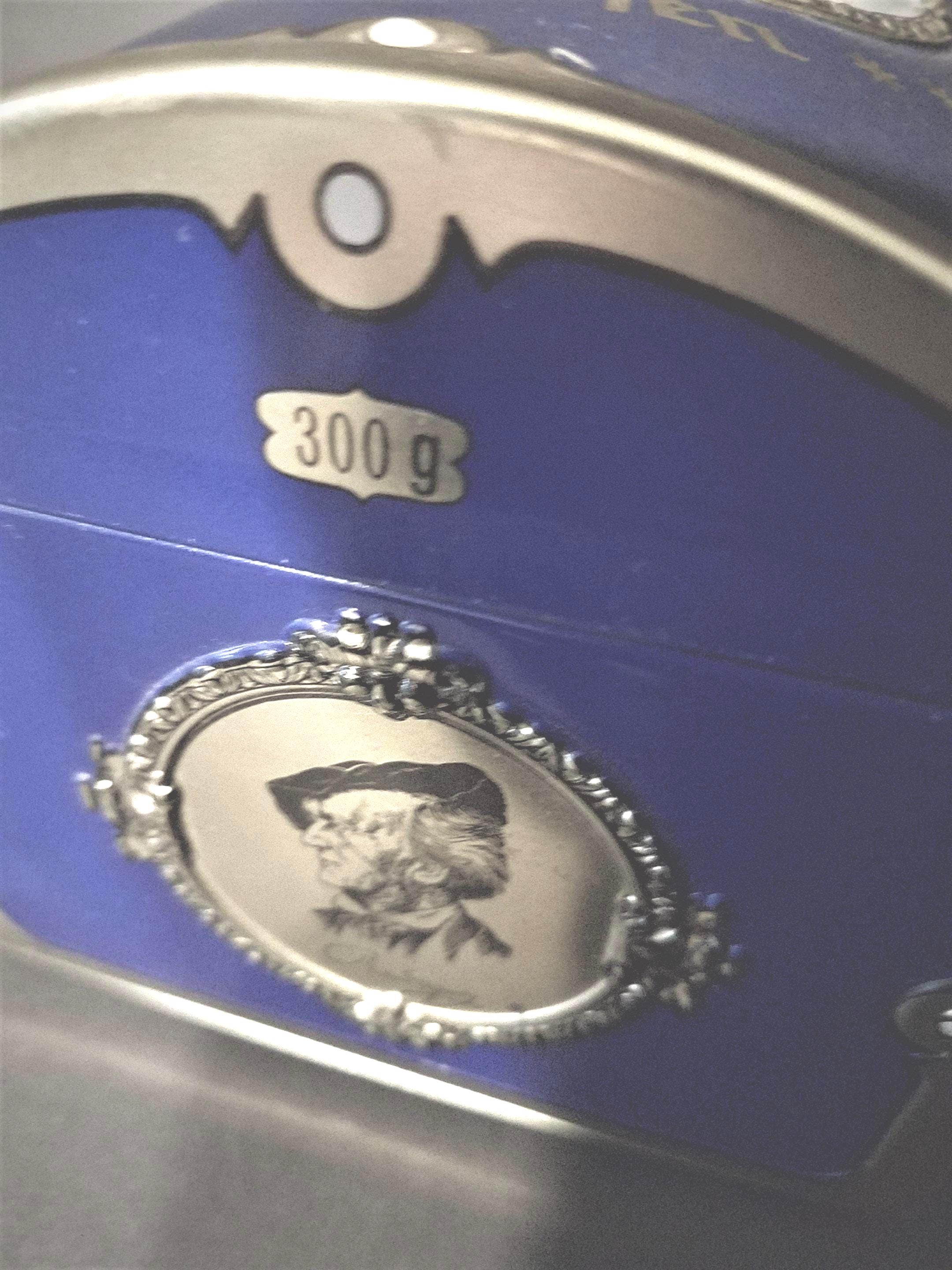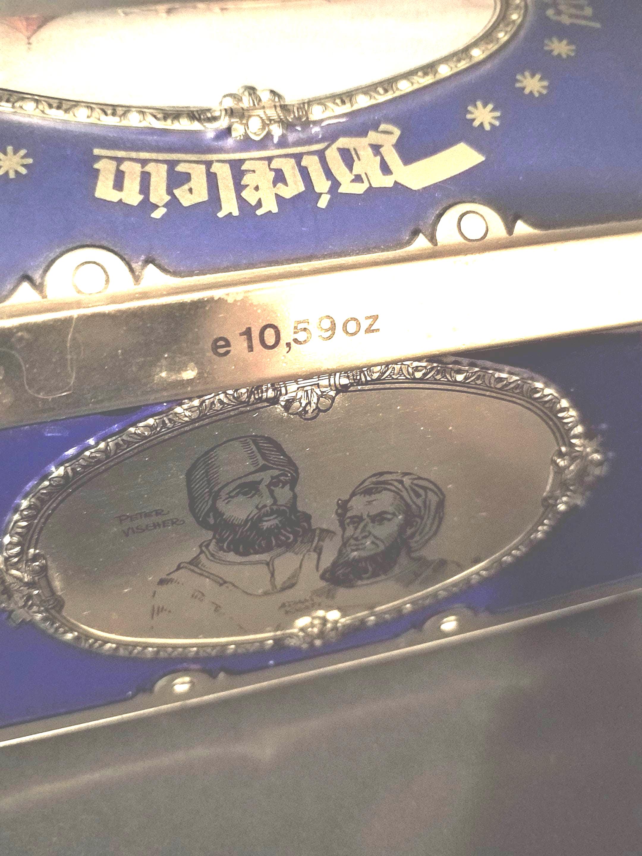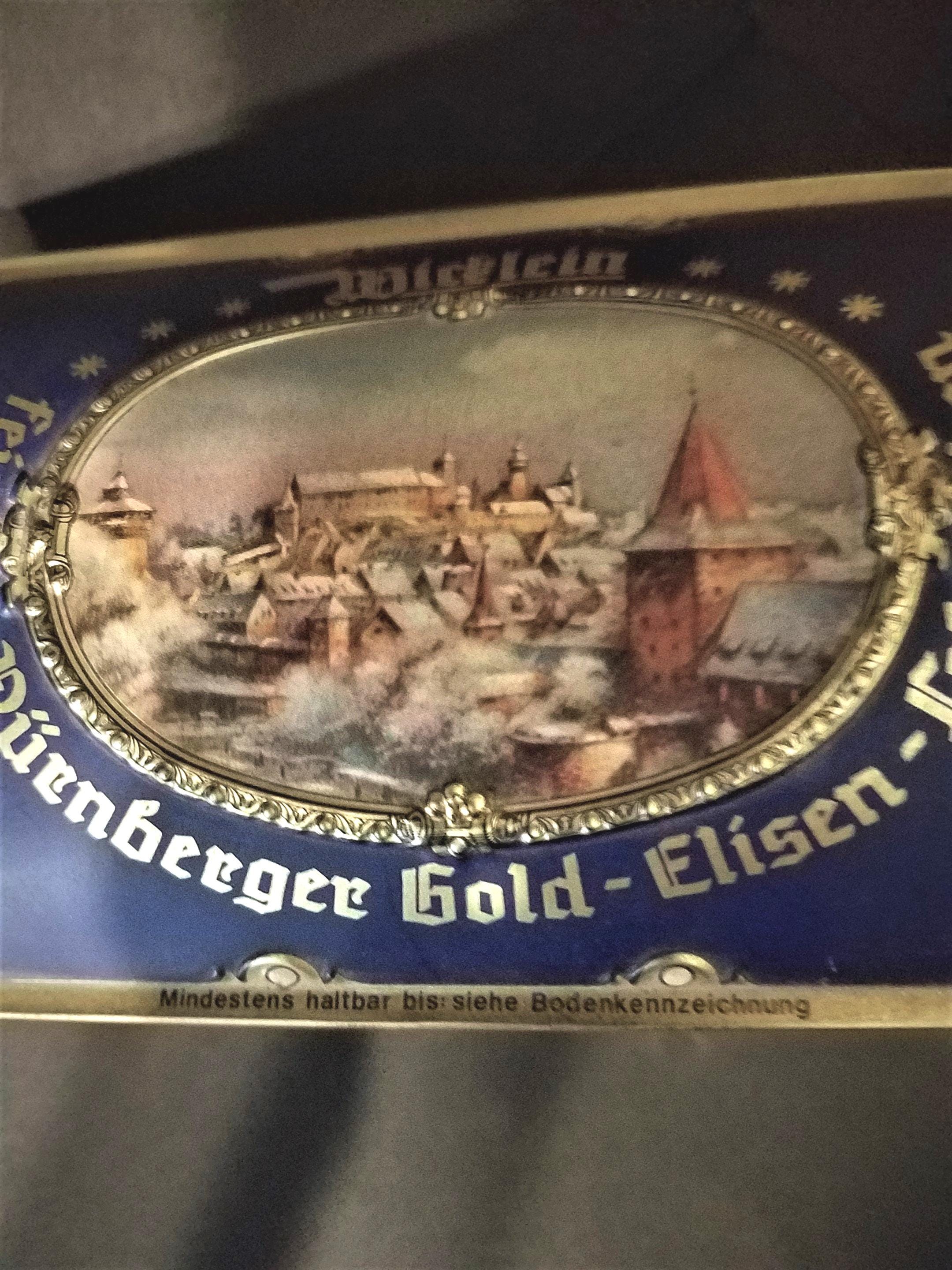 This is just a beautiful German royal blue and gold tin, put out by the confectionary company Gottfried Wicklein circa 1985. This factory has been in business since 1615! The company was sold though in the early nineties and now has another name. The picture on the top is surrounded by raised gold design.