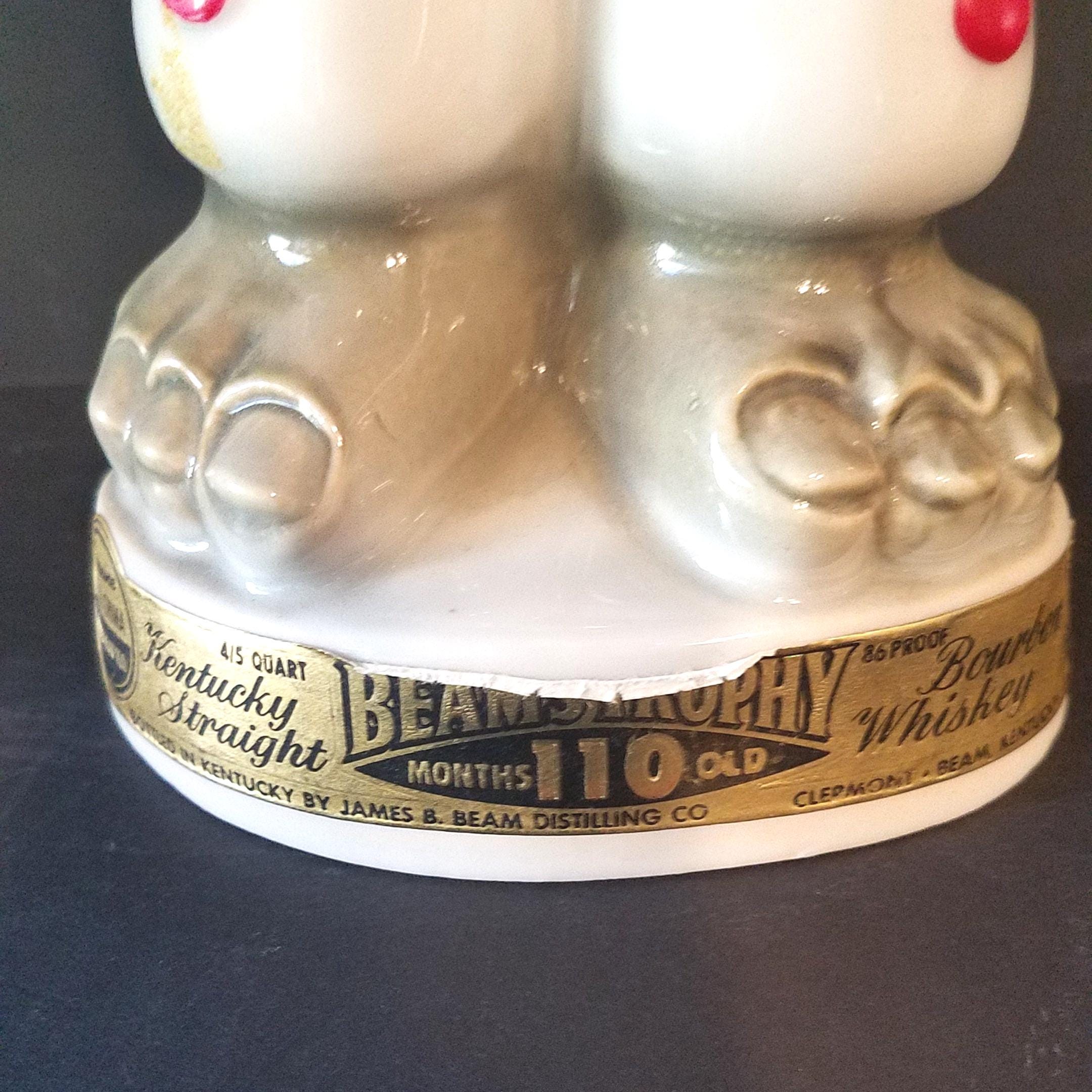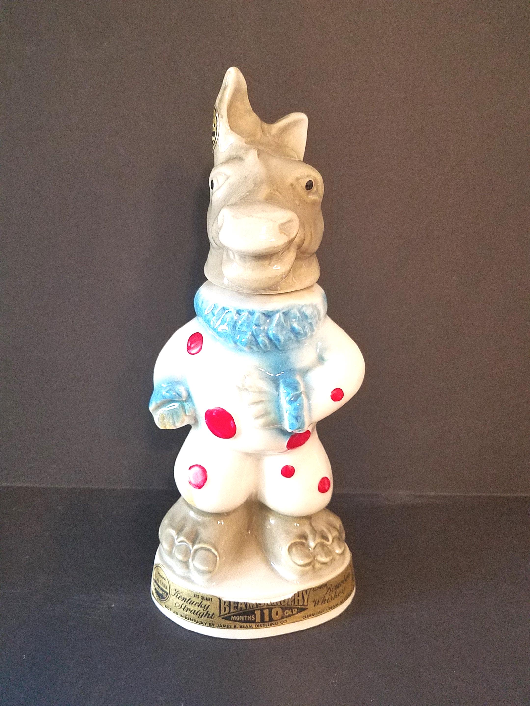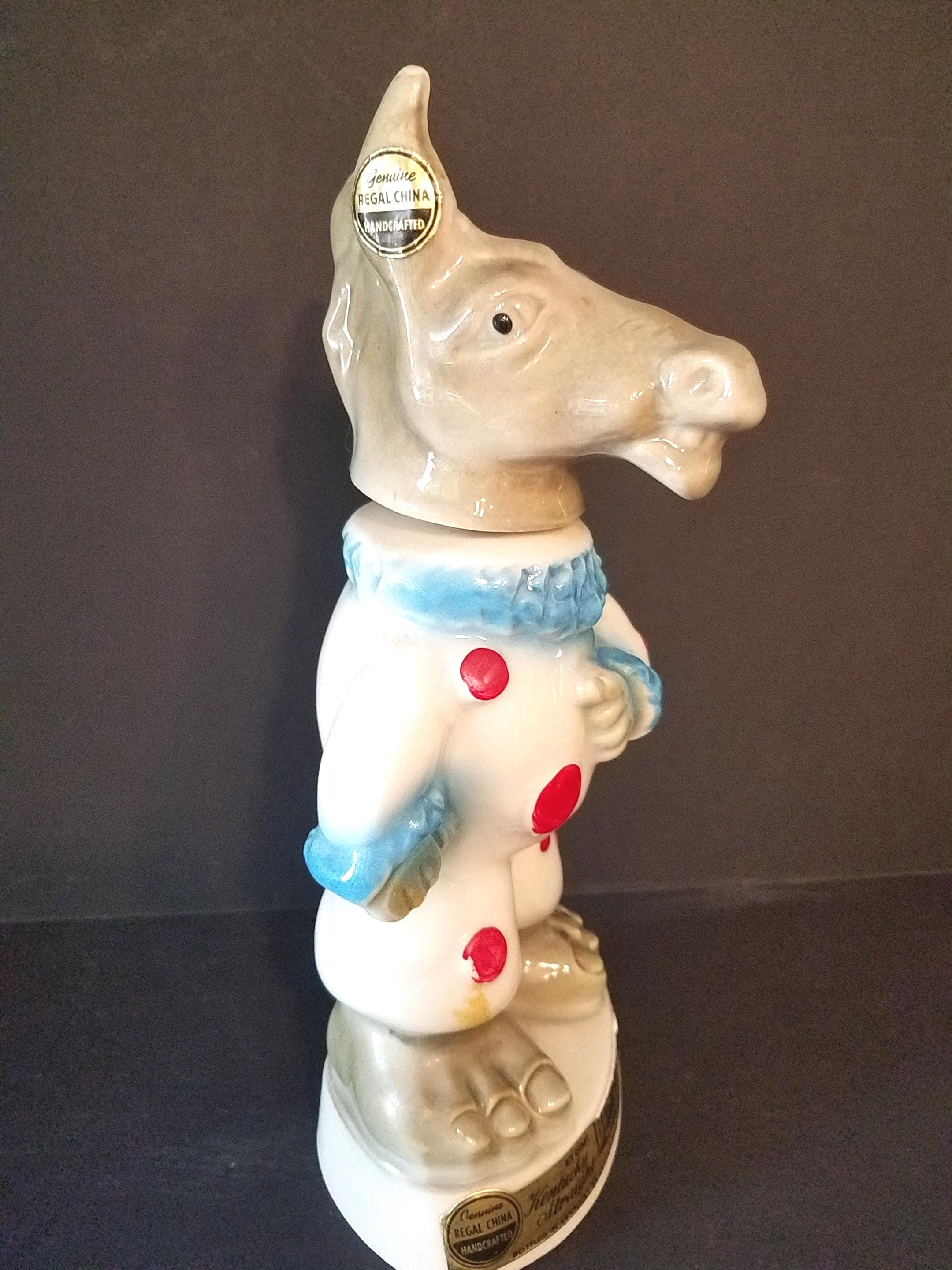 This is a 1968 Jim Beam Decanter that used to be filled with 4/5 quart of Beams Trophy Kentucky Straight Bourbon. It is the Democratic Donkey in a polka dot clown outfit. Unfortunately, when I was taking off the head for photographs the cork broke in half, it could be glued on but I will leave the buyer to decide how they want to handle it. The price is adjusted to reflect the broken cork.