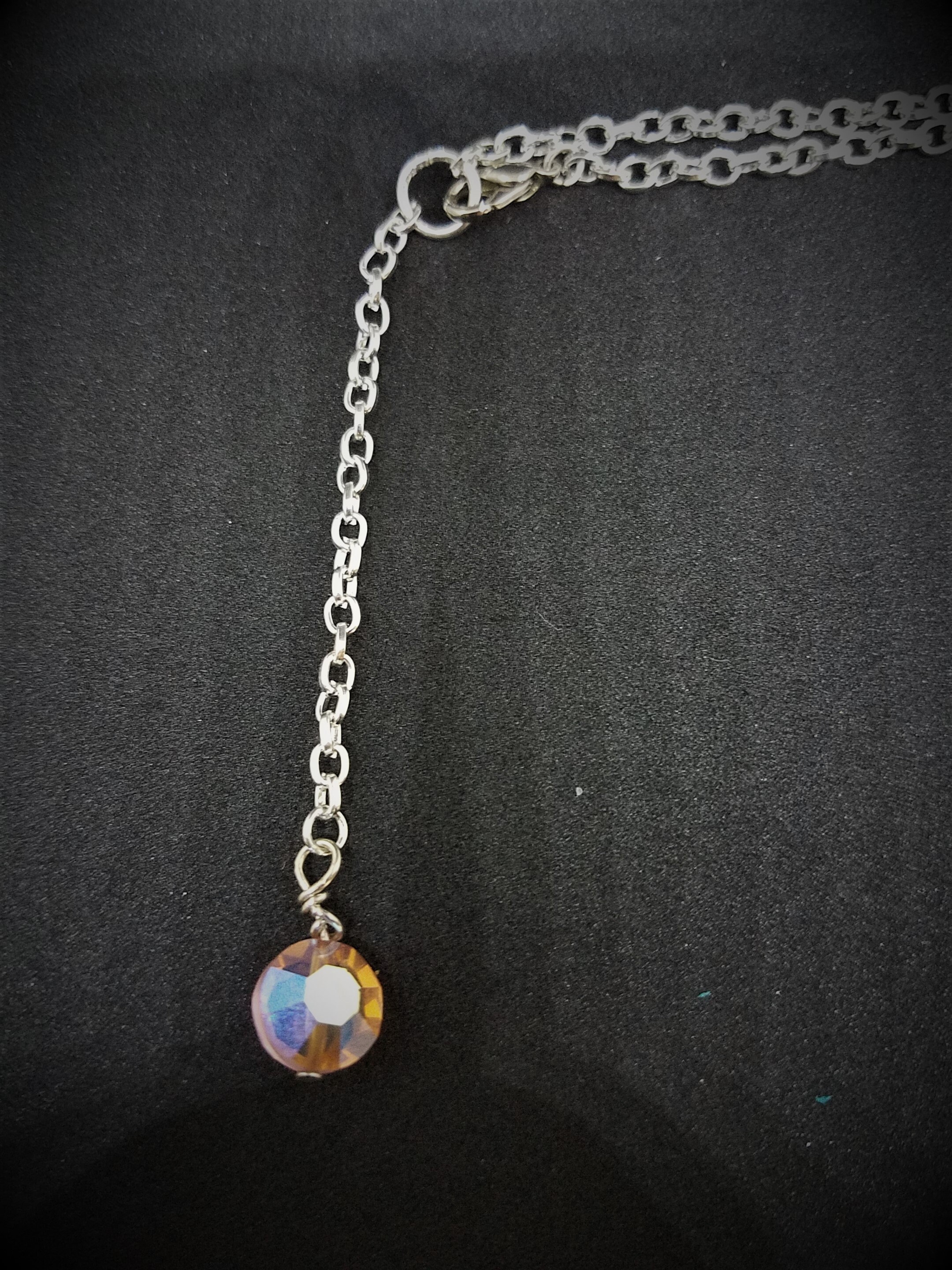 This is a necklace made from the end of a piece of vintage silver plated flatware. It is 2 5/8" long and attached to a silver plated chain embellished with pink swarovski crystals. The silver pendent features roses, leaves and vines. The back side of it features vines. The chain is 19" but is adjustable at 16" so you can wear it shorter or longer depending on your outfit. The extra chain is also embellished with a round crystal. The picture does not do this pretty necklace justice.