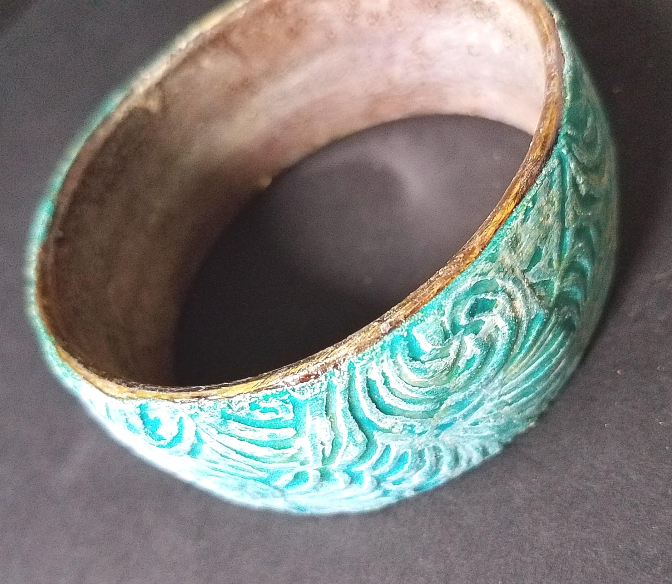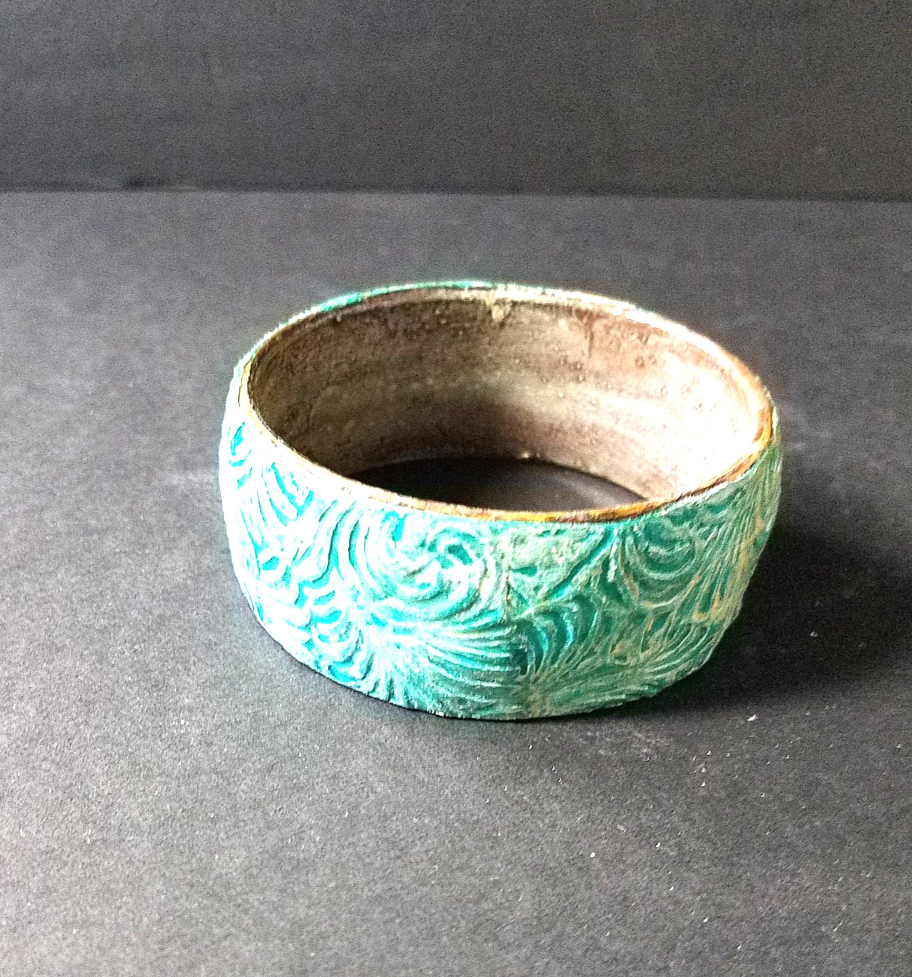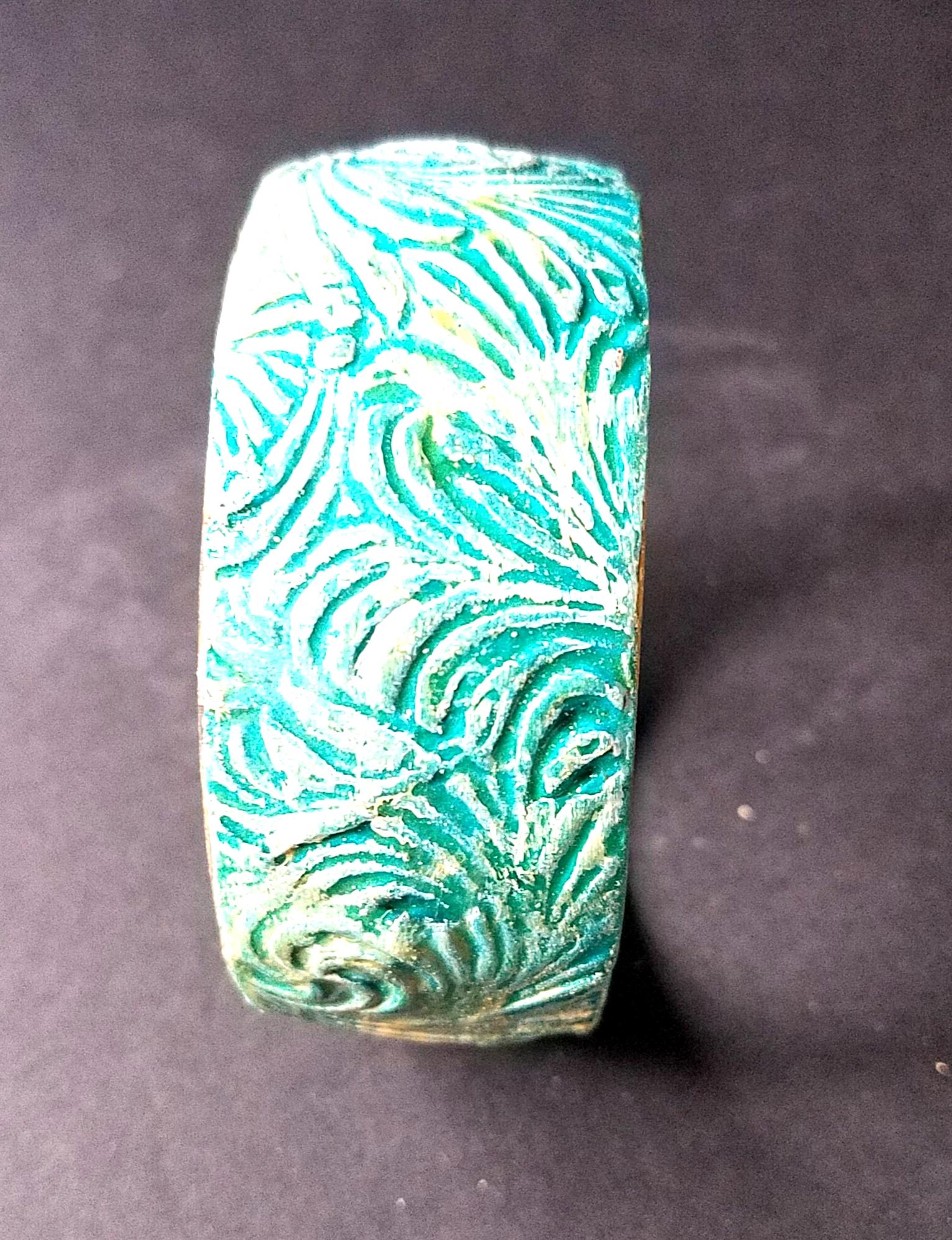 This is a recycled ugly old plastic cuff bangle bracelet. It has been painted and covered with embossed paper and then well sealed. It is a aged turquoise and brown on the inside. The inside is 8.25". I have an average size hand it fits easily.
