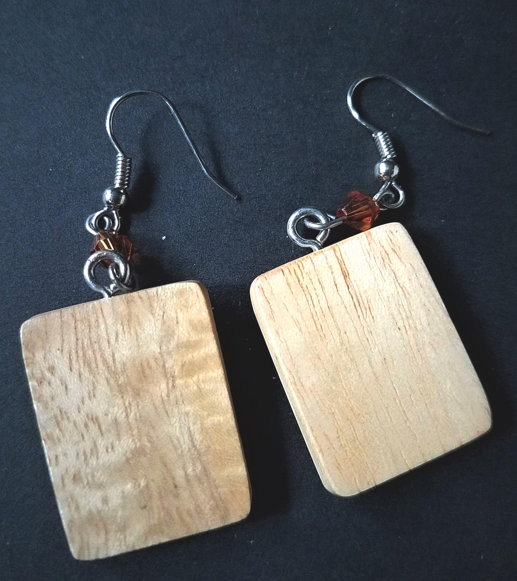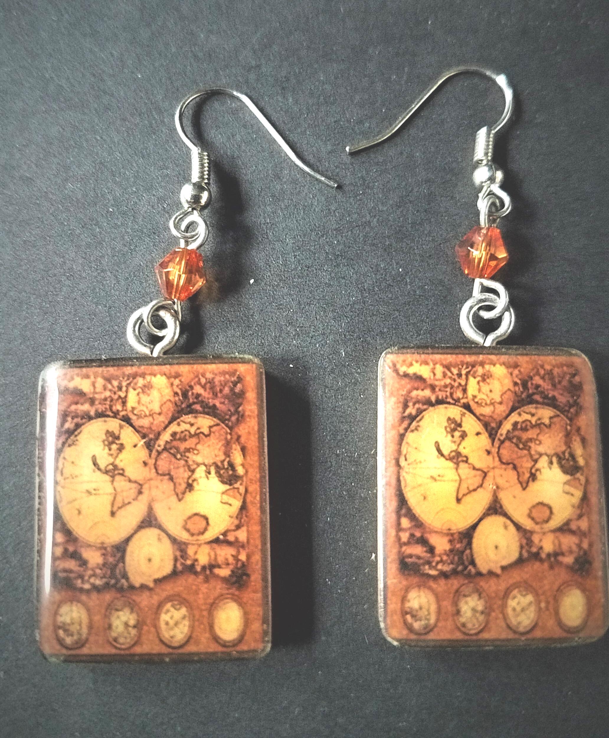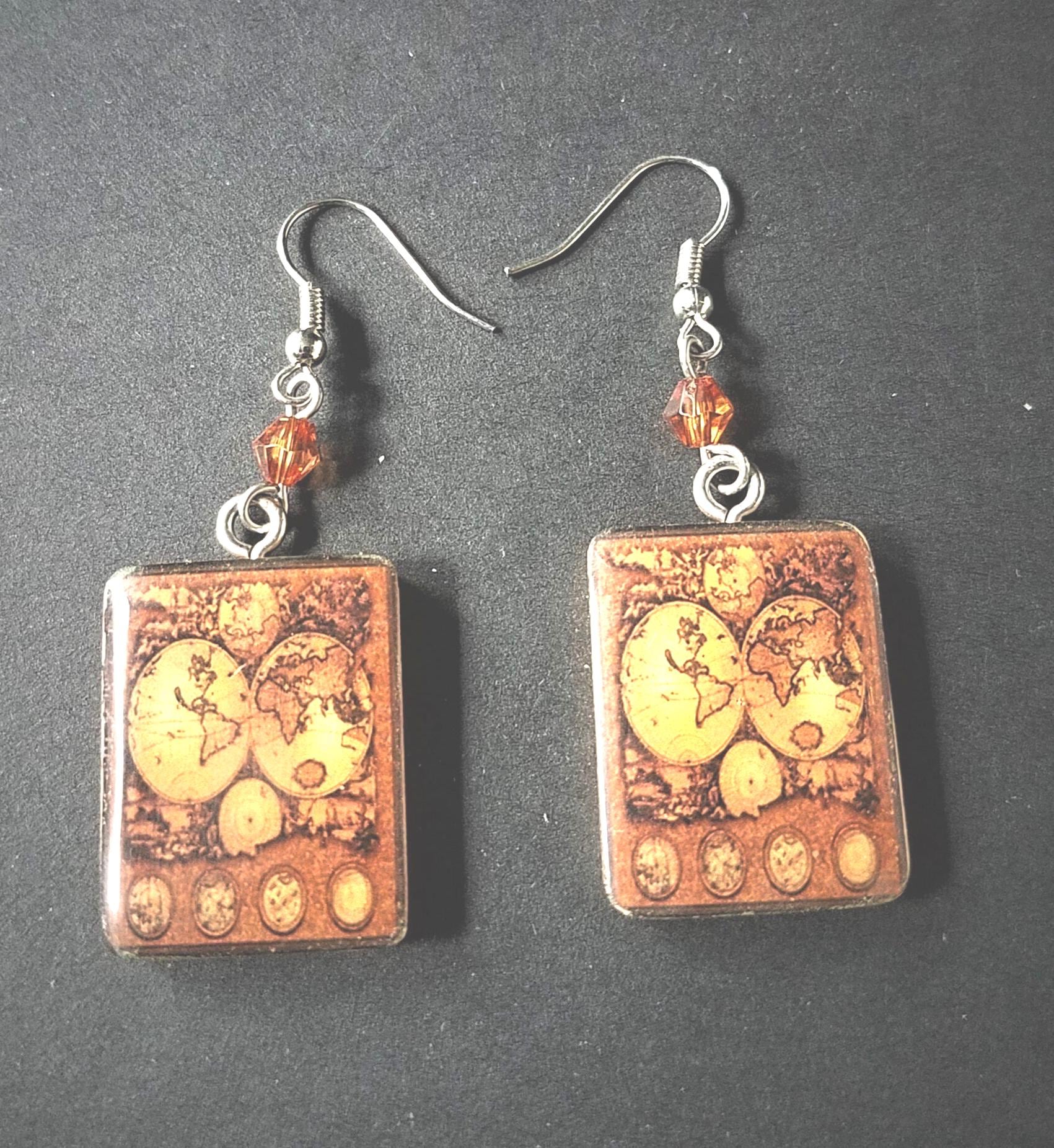 This is a pair of wooden earrings with a tiny old world map under resin and a tiny amber crystal in between the silver earwire and the map. The back side is just plain blond wood. The wood rectangles are 1" x .75".