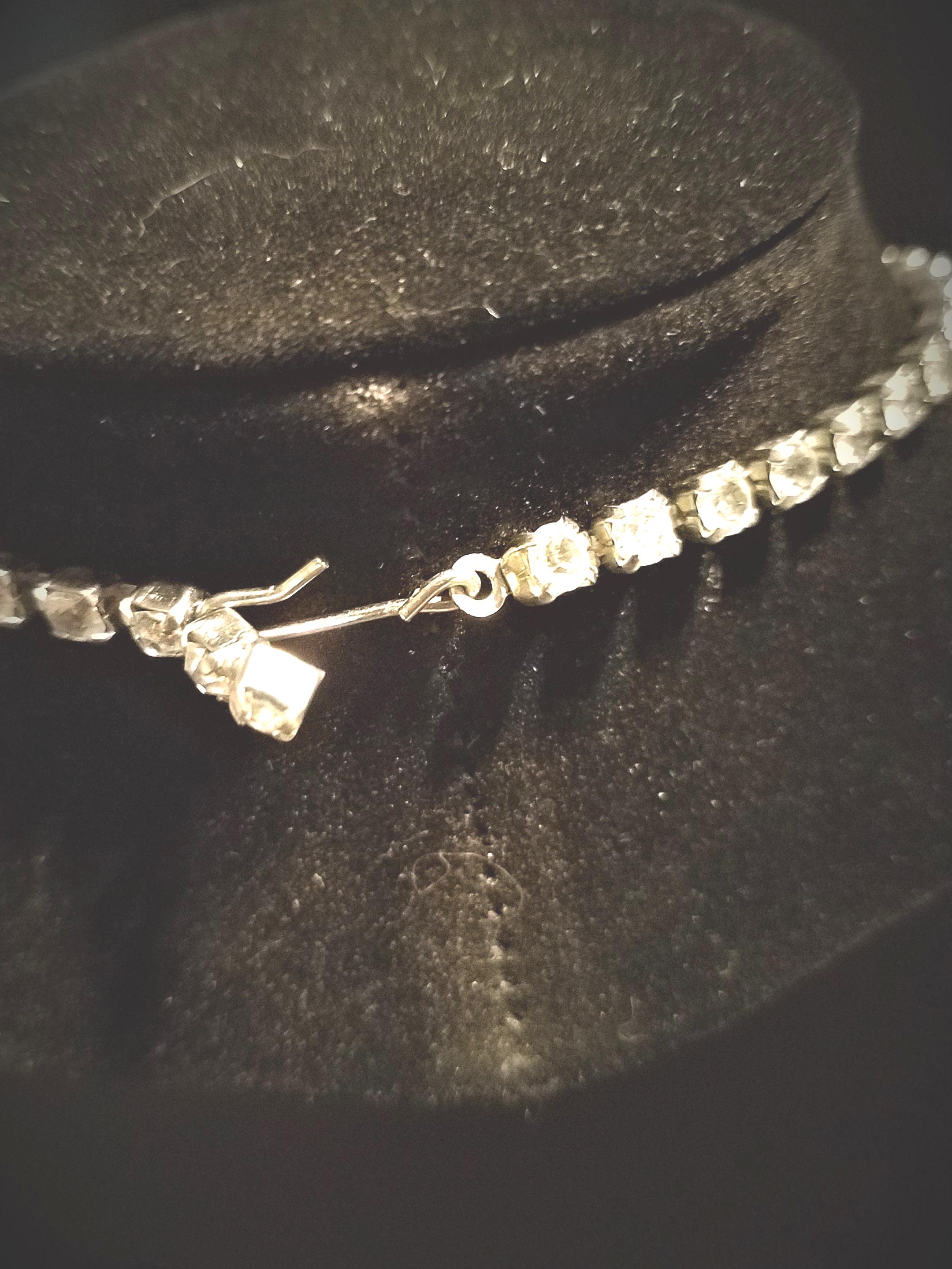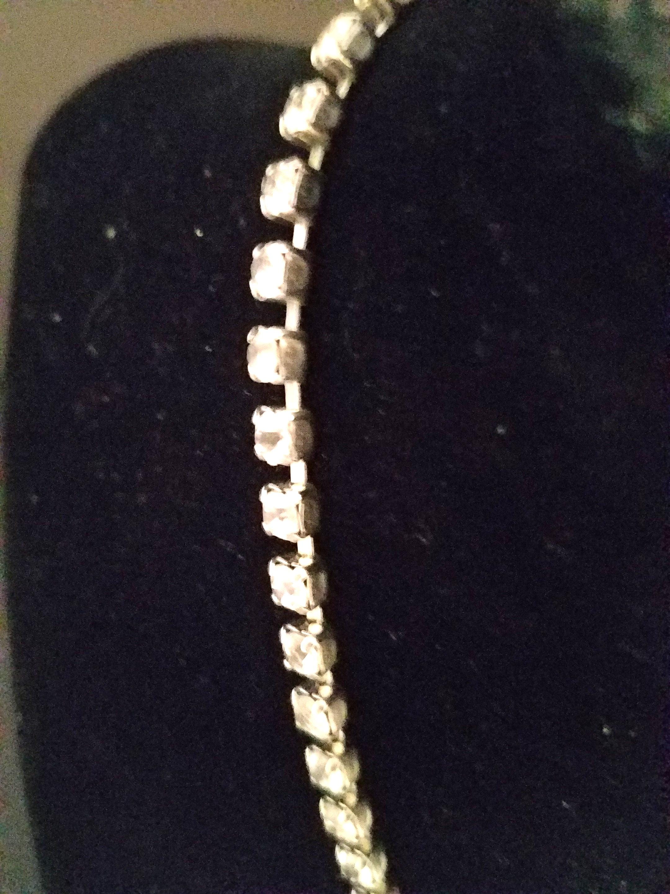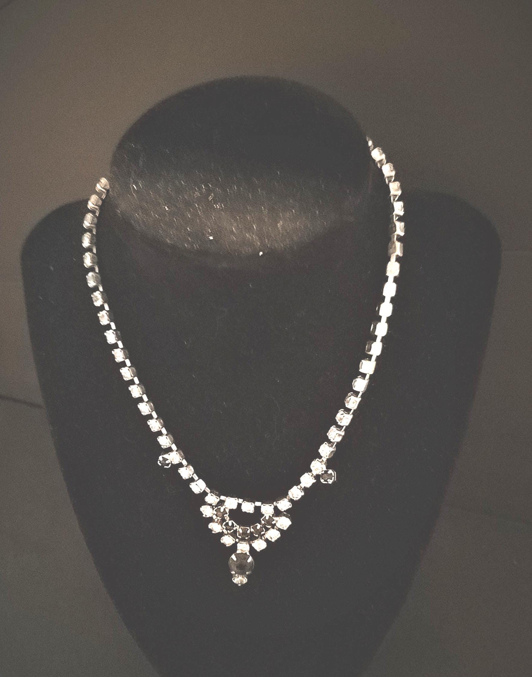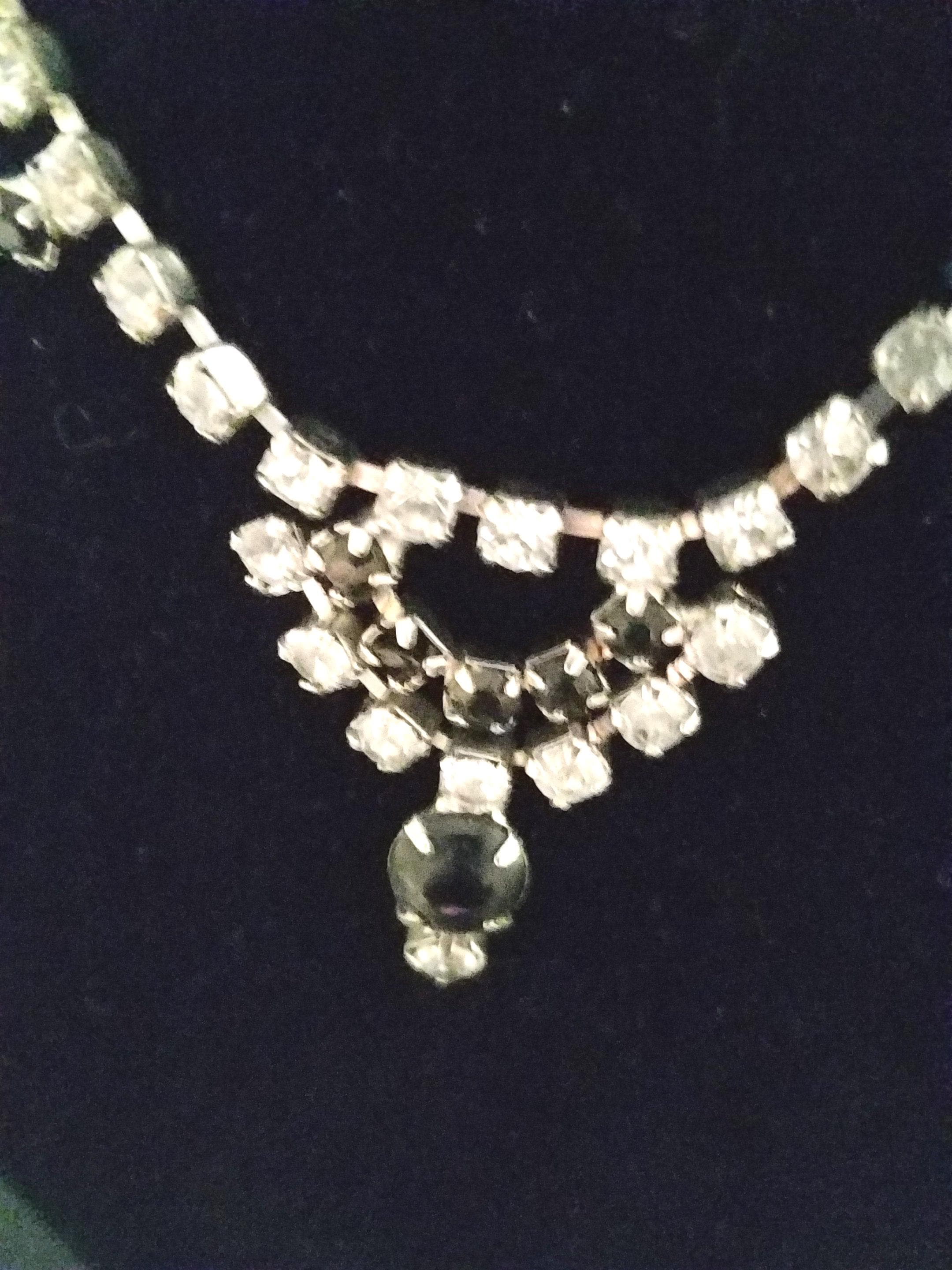 This 14" necklace is from the 40s or 50s and is made with cup chain filled with clear glass crystals. It is adjustable as the clasp is a hook that just hooks onto the necklace anywhere you choose. In the center is 2 rows of black and clear rhinestone swags with a black opaque stone on the bottom.